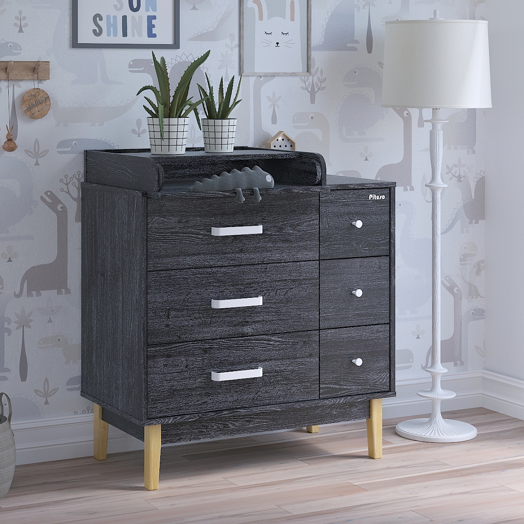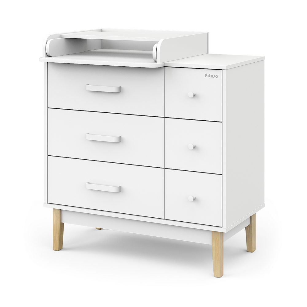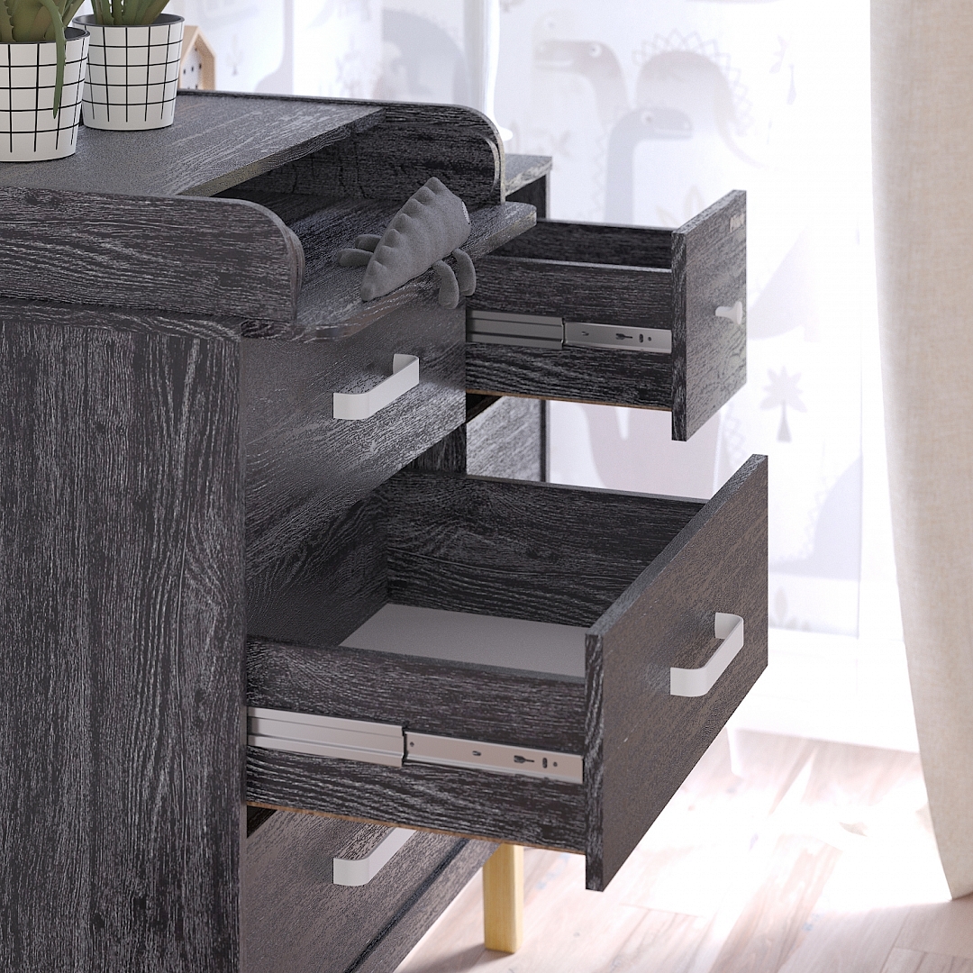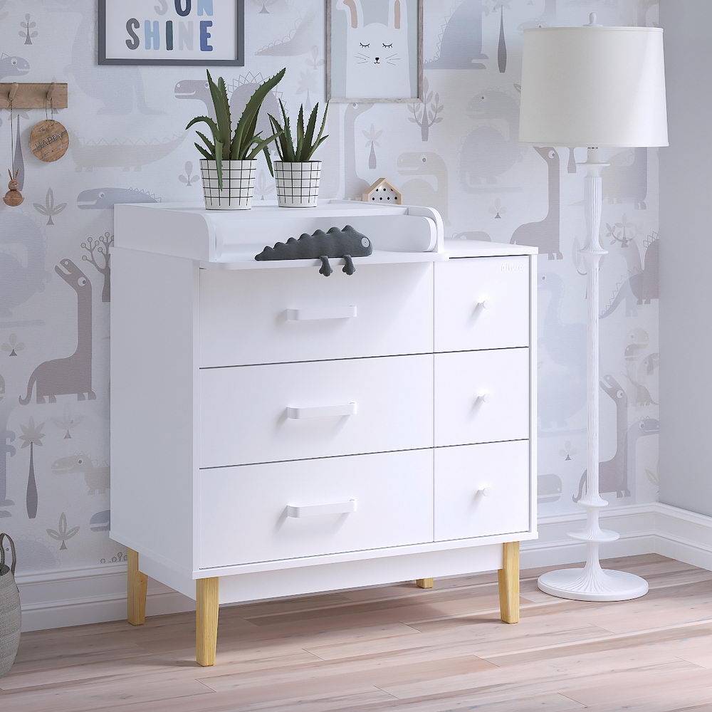 Большим преимуществом комода является съемный пеленальный столик. Пока ребенок маленький столик легко устанавливается на комод и позволит маме удобно переодевать ребенка, проводить все гигиенические процедуры. Пеленальный столик складной, в сложенном виде не мешает и может использоваться как дополнительные полочки. Когда ребенок подрастет, пеленальная поверхность полностью снимается без следов на комоде. Благодаря стильному внешнему виду комод отлично подойдет для гостиной, спальни, детской комнаты.