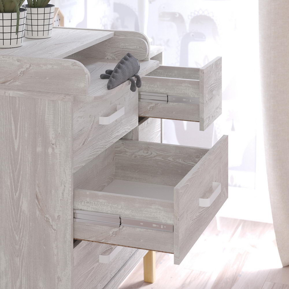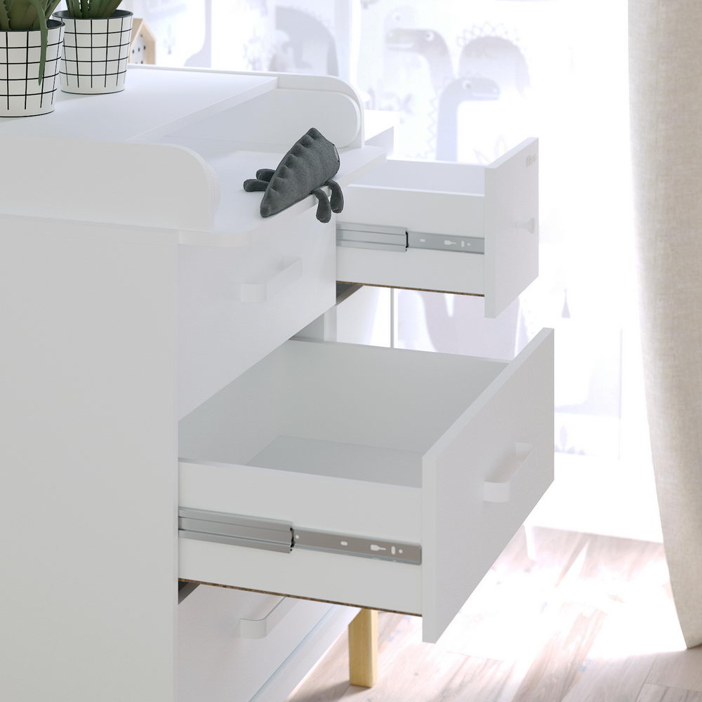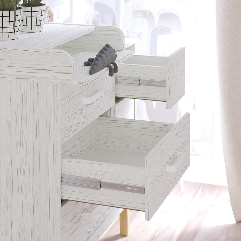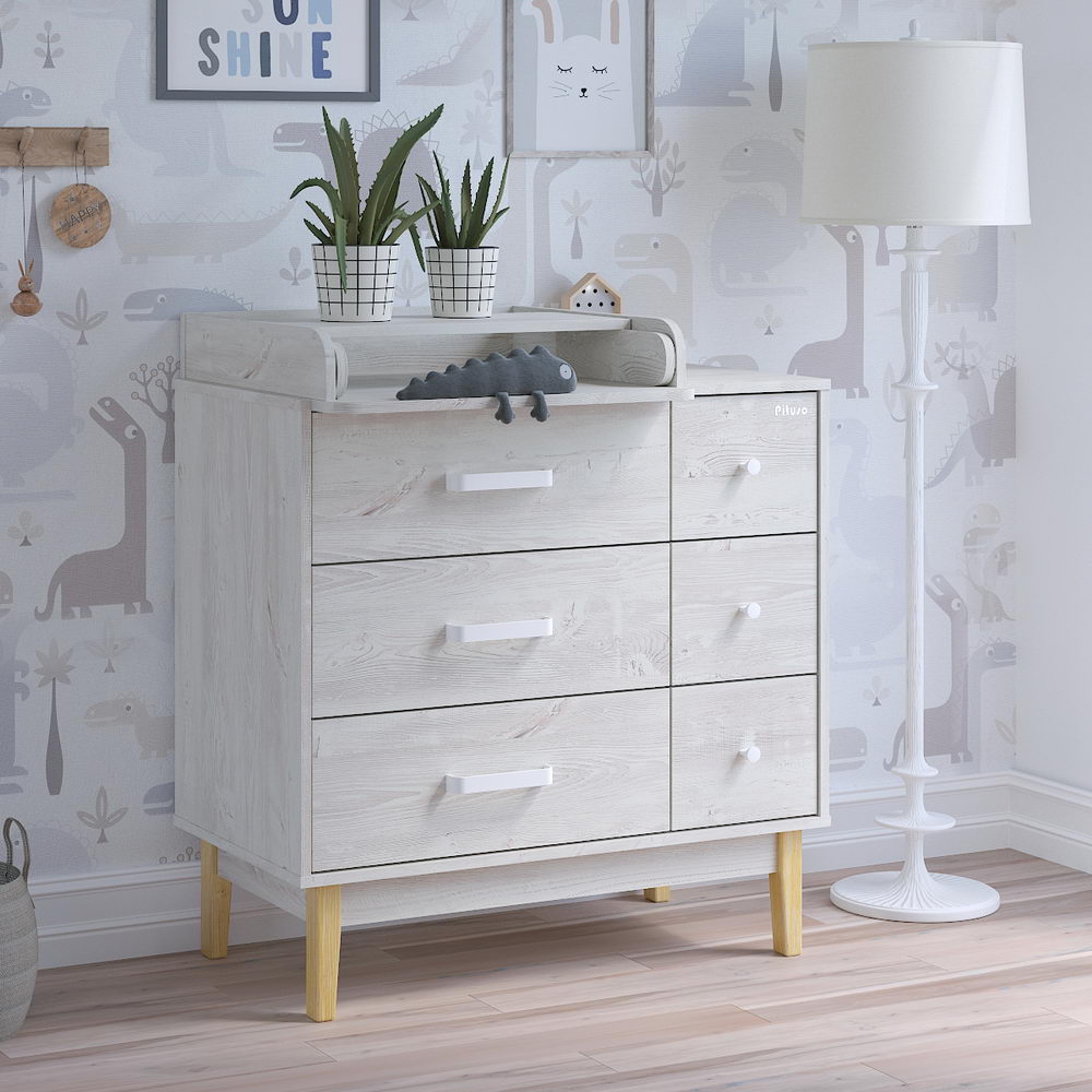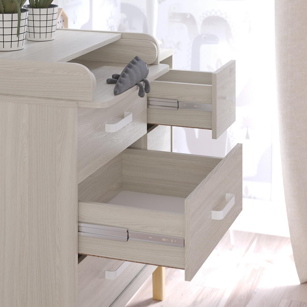 Большим преимуществом комода является съемный пеленальный столик. Пока ребенок маленький столик легко устанавливается на комод и позволит маме удобно переодевать ребенка, проводить все гигиенические процедуры. Пеленальный столик складной, в сложенном виде не мешает и может использоваться как дополнительные полочки. Когда ребенок подрастет, пеленальная поверхность полностью снимается без следов на комоде. Благодаря стильному внешнему виду комод отлично подойдет для гостиной, спальни, детской комнаты.
