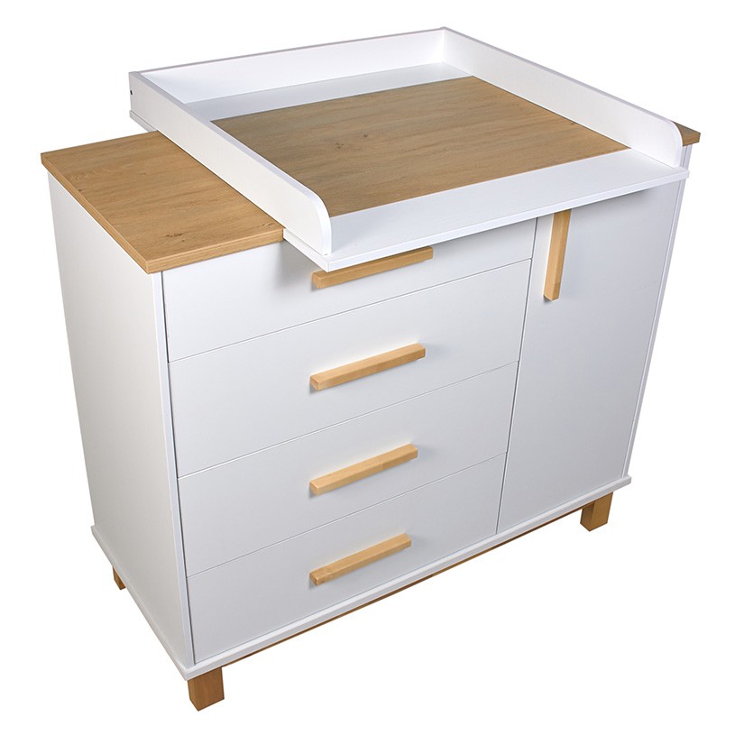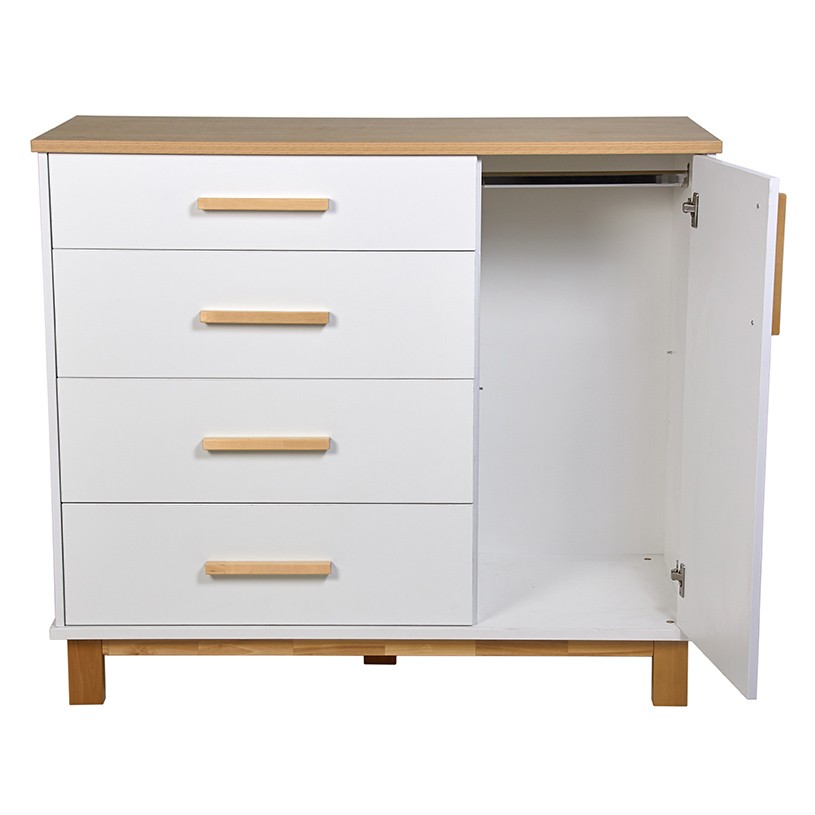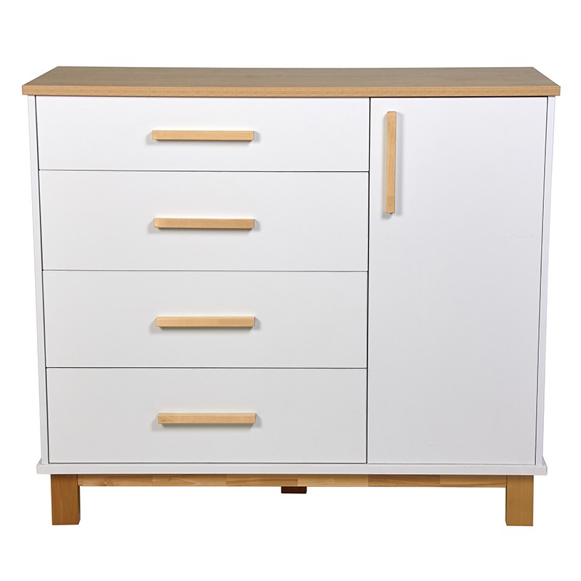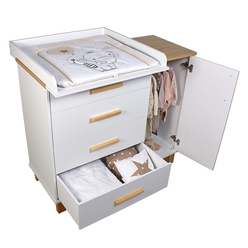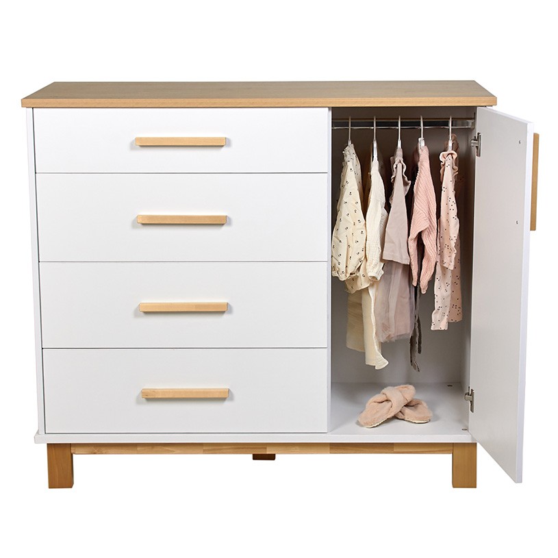 Комод выполнен в минималистическом дизайне и прекрасно впишется в любой интерьер. Его габариты полностью оправданы большим и удобным пространством для хранения детских вещей. Буквально каждый сантиметр будет использован по назначению. За счет белого цвета в сочетании с деревом, а так же высоким опорам, комод не выглядит громоздко.