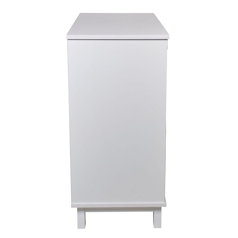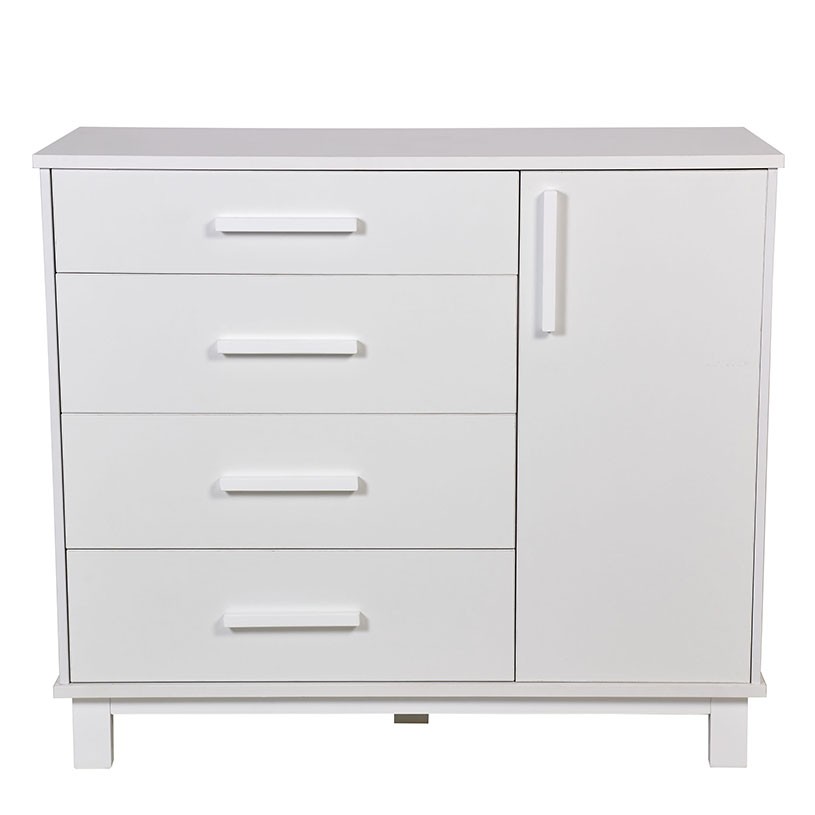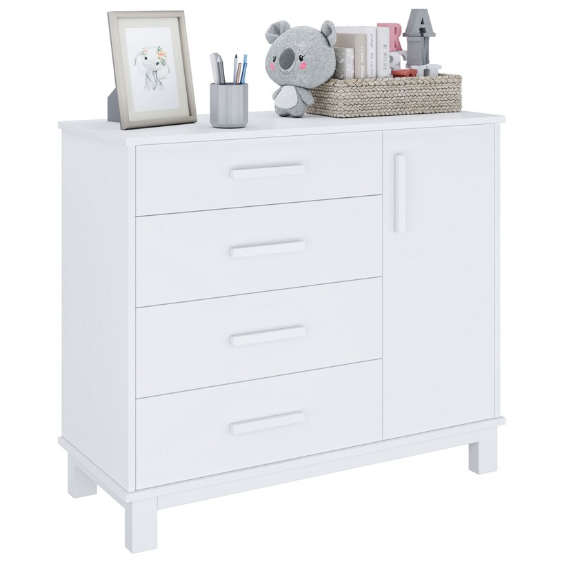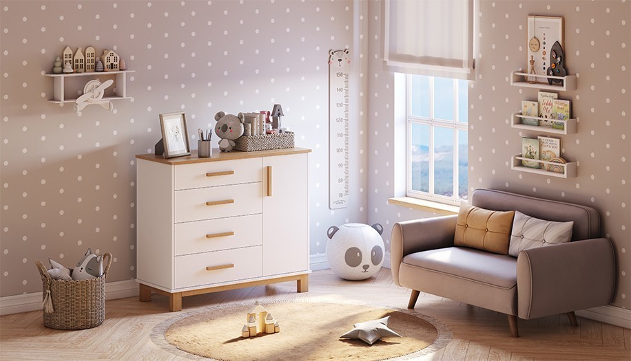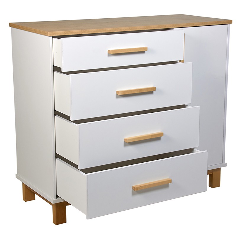 Комод выполнен в минималистическом дизайне и прекрасно впишется в любой интерьер. Его габариты полностью оправданы большим и удобным пространством для хранения детских вещей. Буквально каждый сантиметр будет использован по назначению. За счет белого цвета в сочетании с деревом, а так же высоким опорам, комод не выглядит громоздко.