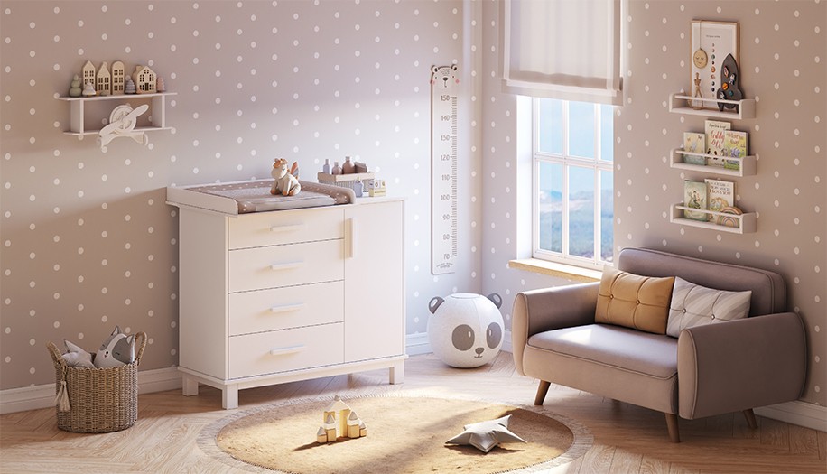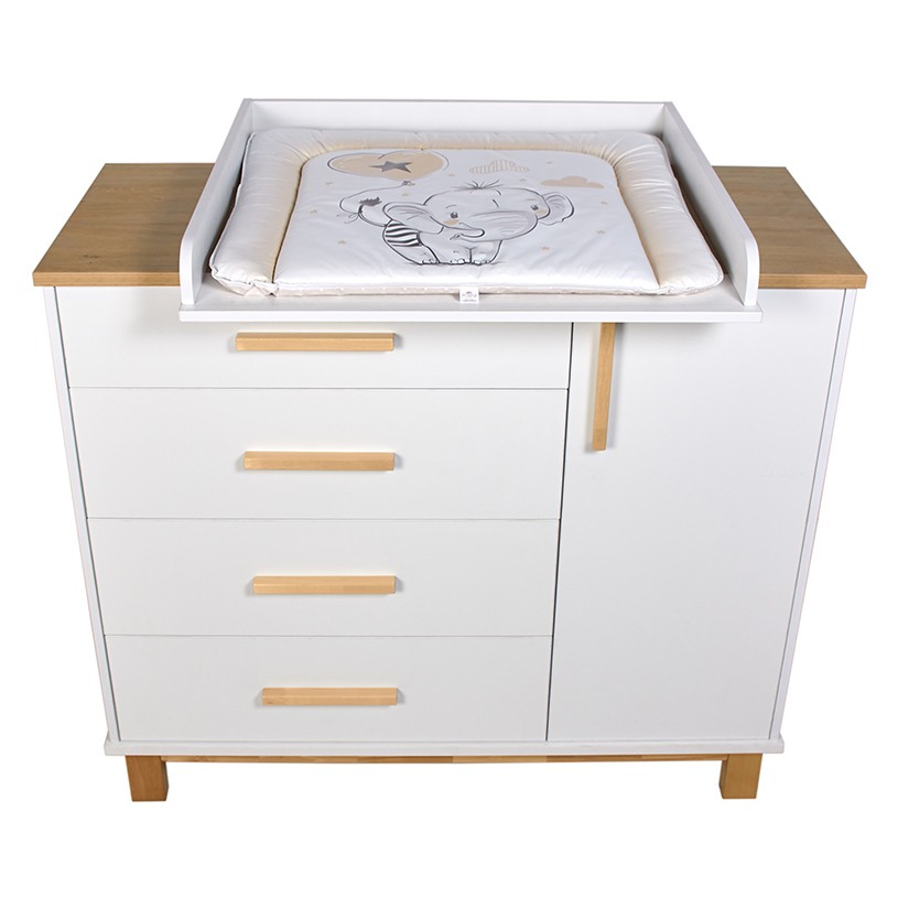 Комод можно использовать как пеленальный при дополнительной покупке универсальной пелеальной рамки. Она легко устанавливается на комод с любой стороны, быстро снимается и не оставляет следов. Пеленальная рамка позволит создать на комоде удобную зону для переодевания, пеленания ребенка, для массажа и воздушных ванн. При этом после ее установки на комоде остается место, где можно разместить гигиенические принадлежности.