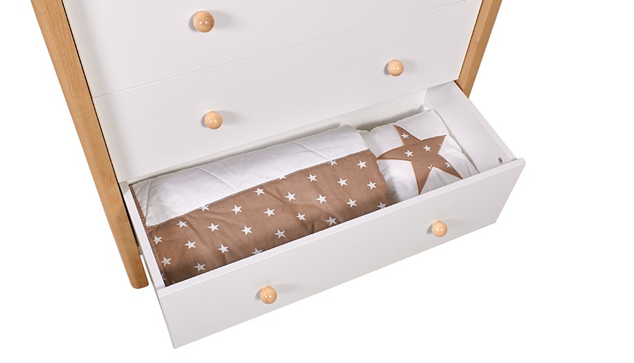 Комод подходит для пеленания малышей благодаря возможности установки пеленальной рамы, которая гарантирует удобство в уходе за ребенком и безопасность. Пеленальная рамка не входит в комплект и продается отдельно. Для данной модели подходит пеленальная рамка как на 80 см, так и на 60 см. При этом после ее установки на топах комодов остается место, где можно разместить гигиенические принадлежности.