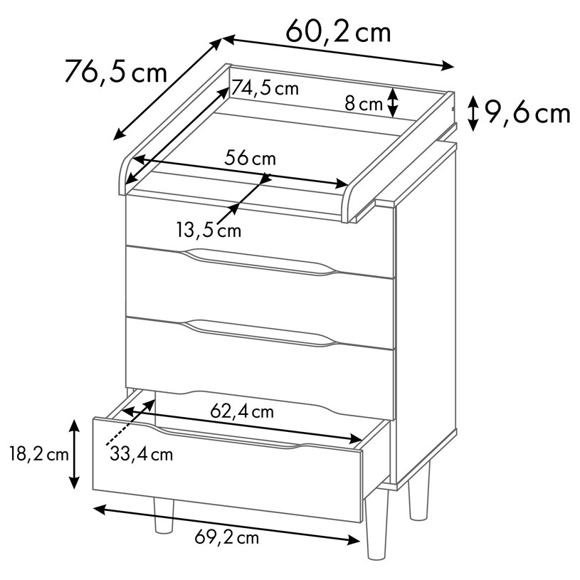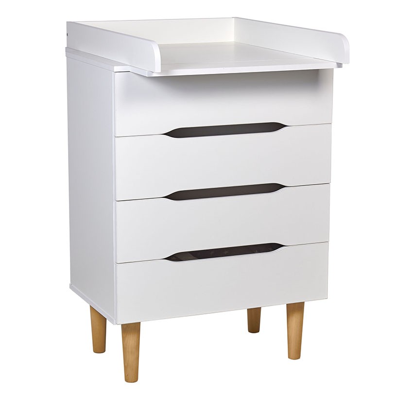 Комод подходит для пеленания малышей благодаря возможности установки пеленальной рамы с бортиками (покупается отдельно). Когда потребность в пеленании малыша отпадает, то рамка легко снимается, освобождая место для расположения предметов на топе комода.
