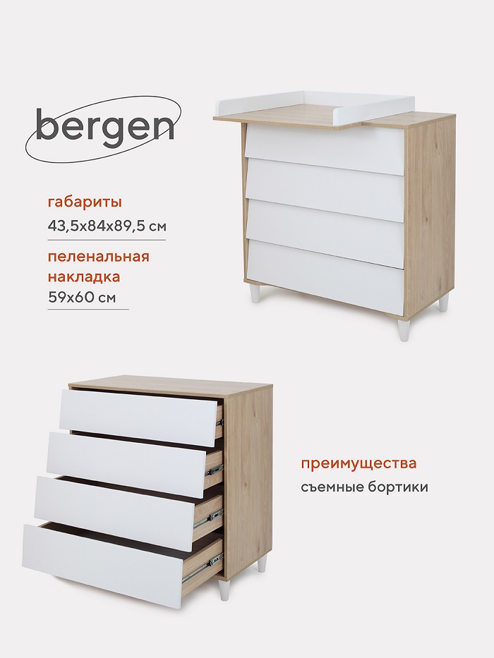 Комод Rant BERGEN 84 см (рант берген) - практичный комод с оригинальными фасадами, который отлично впишется в любой интерьер. У комода фасады наклонного типа, без зазоров, и без видимых ручек, что выгодно отличает его от других похожих моделей, а одежду надежно защищает от пыли. В комоде предусмотрен съемный пеленальный столик, который легко установить на комод с любой стороны. Когда ребенок подрастет, пеленальные бортики легко снимаются, и у вас останется удобный и вместительный бельевой комод для вещей. Все ящики оснащены телескопическими направляющими, что обеспечит надежность ящиков и возможность выдержать большие нагрузки. Комод установлен на надежные ножки. Расстояние от пола позволяет легко проводить влажную уборку. Комод Bergen сделан из экологически чистых материалов и покрыт краской на водной основе, которая полностью безопасна для ребенка.