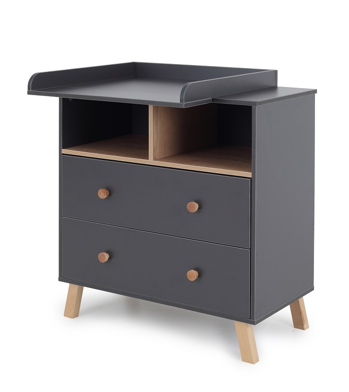 Комод VESTER имеет удобную ширину 80 см и оснащен 2 открытыми полочками, например, под гигиенические принадлежности, игрушки, упаковку подгузников и 2 закрытых ящика. 2 закрытых ящика снабжены телескопическими направляющими, выдерживают большую нагрузку, вместительные, удобно открываются и закрываются.