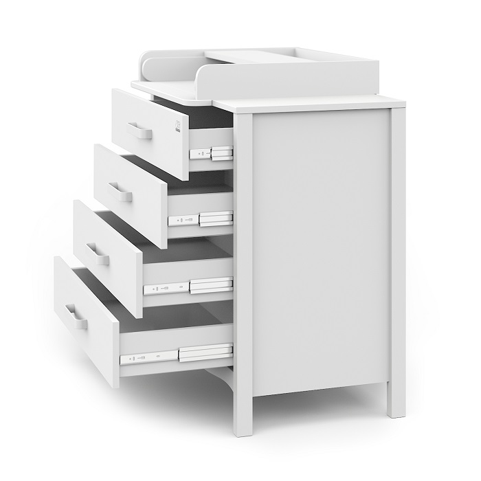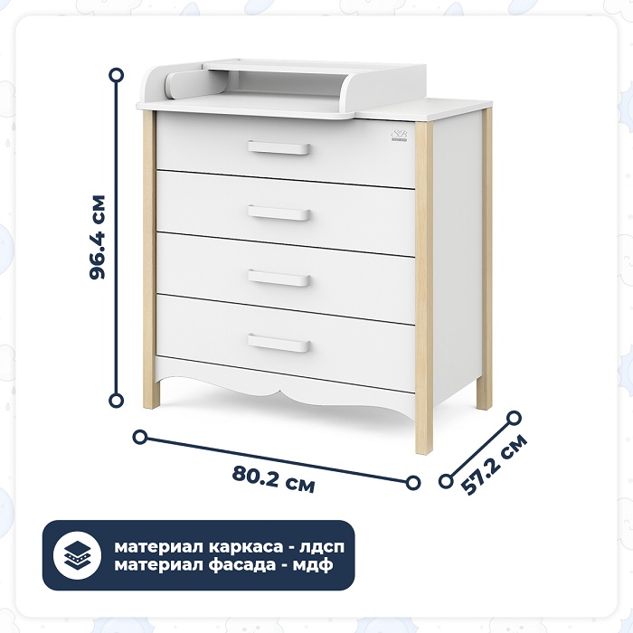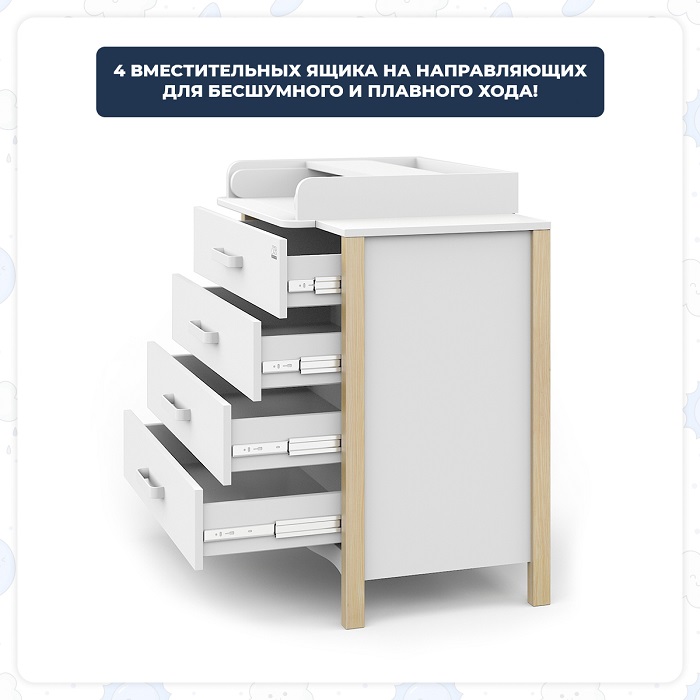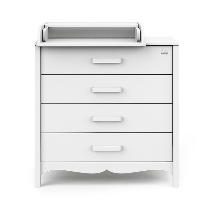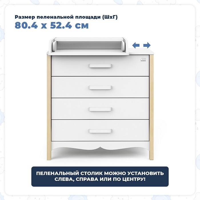 Отличительной особенностью комода является возможность устанавливать раскладной пеленальный столик слева, справа или по центру- как вам удобно! Пеленальная часть легко снимается, не оставляя никаких следов на столешнице.