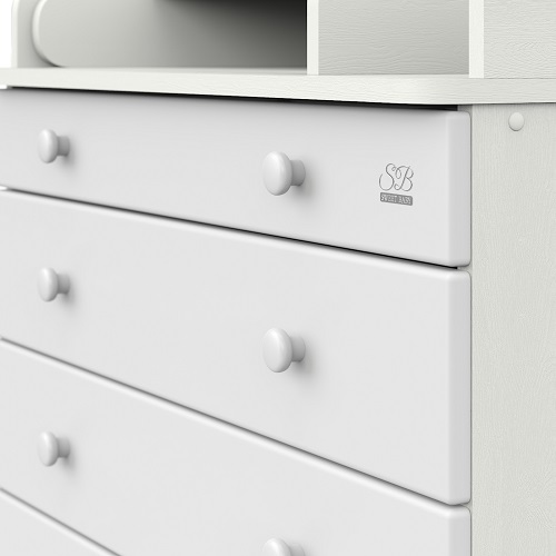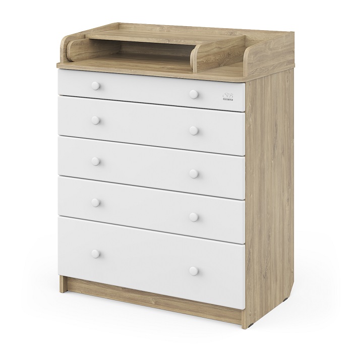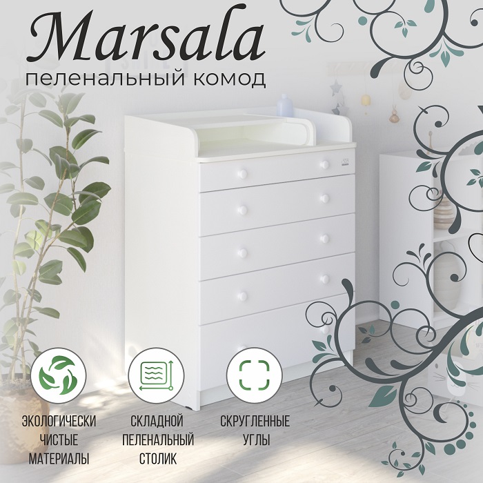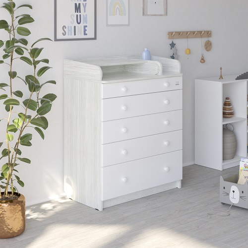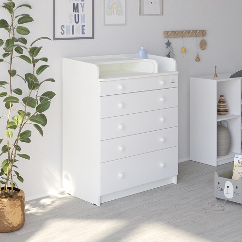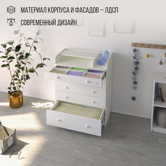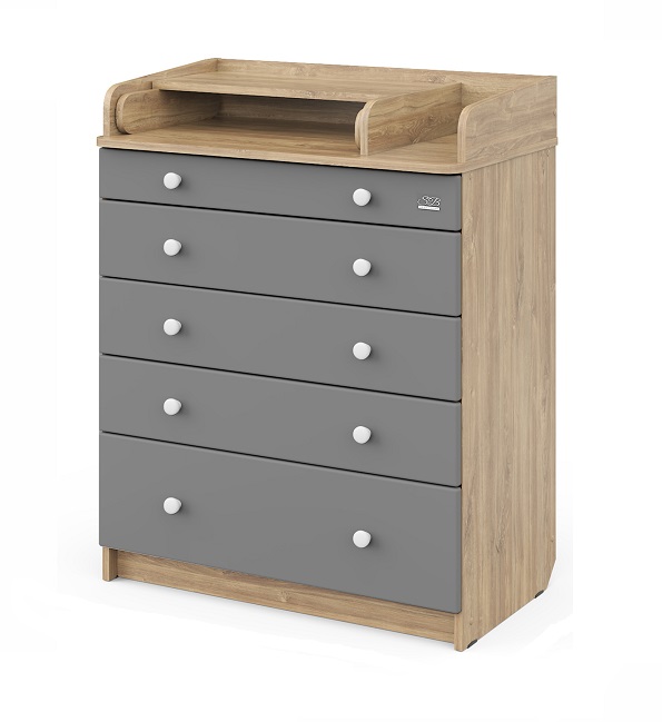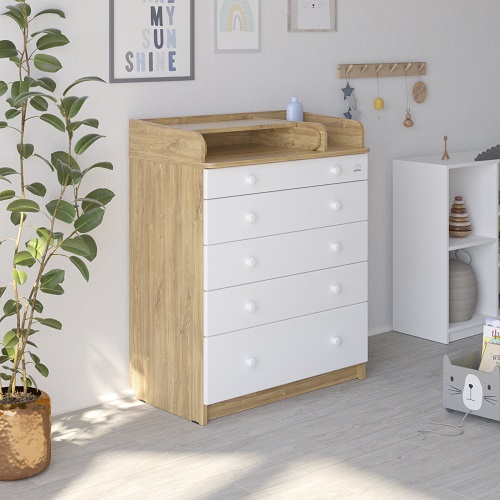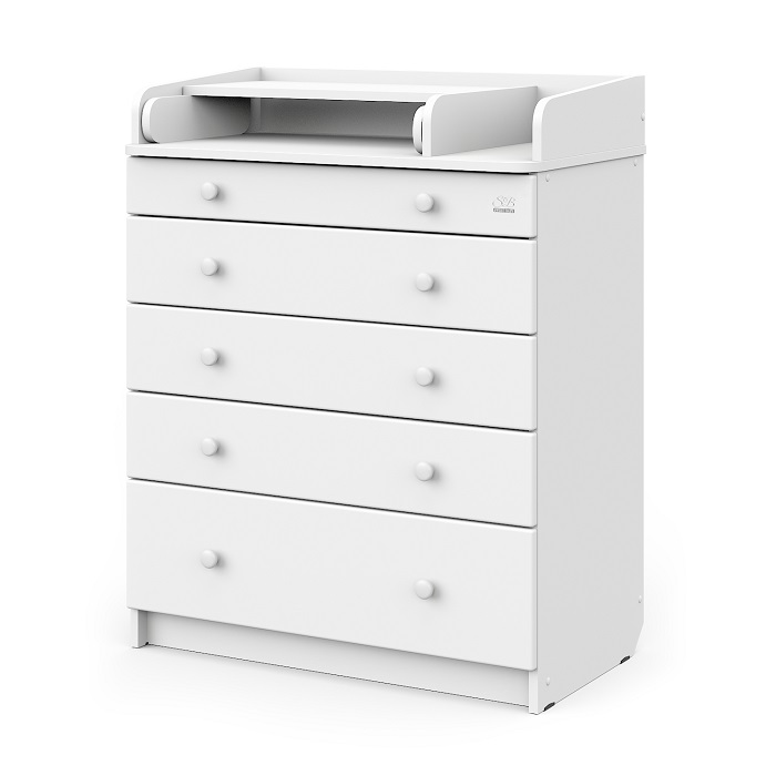 Комод Sweet Baby Marsala (Свит беби марсала) - практичный комод с органайзером для удобного хранения детских вещей. Преимущество данного комода в ящиках разного размера. Небольшие предметы вы сможете удобно разместить в верхних ящичках, а большие и более объемные вещи, как одеяло или комбинезон, удобно поместятся в большом нижнем ящике. Все ящики оснащены шарикоподшипниковыми направляющими для бесшумного хода. Так же комод оснащен складным пеленальным столиком, который поможет на удобной для вас высоте пеленать, переодевать ребенка и осуществлять все необходимые для малыша гигиенические процедуры. Когда пеленальная поверхность не нужна, она компактно складывается и может использоваться как дополнительная полочка. Комод создан в современном стиле и в комбинациях контрастных оттенков благородной древесины с нежными белыми или бежевыми фасадами. Комод устойчив, надежен, и прослужит вам длительный срок.