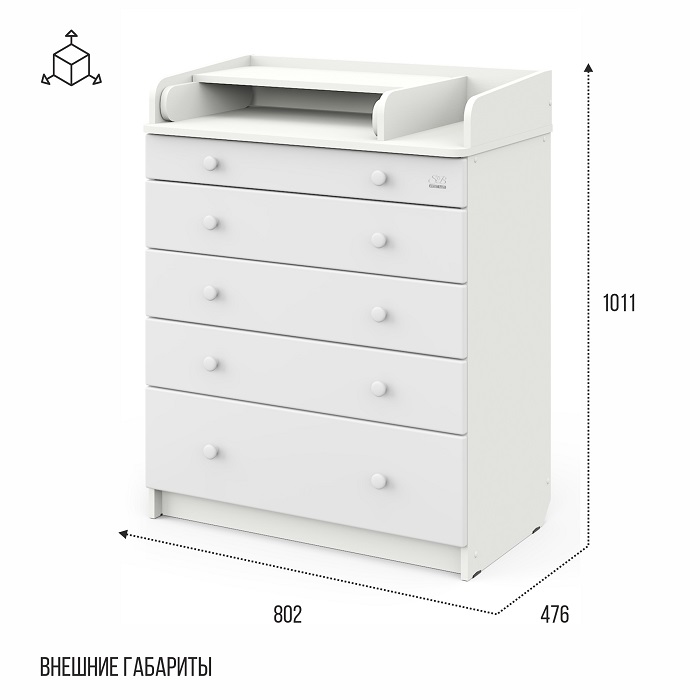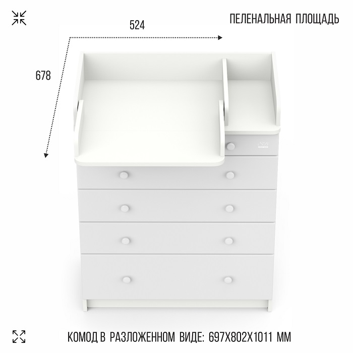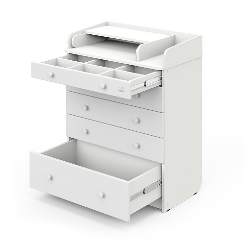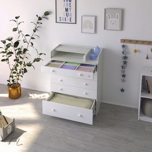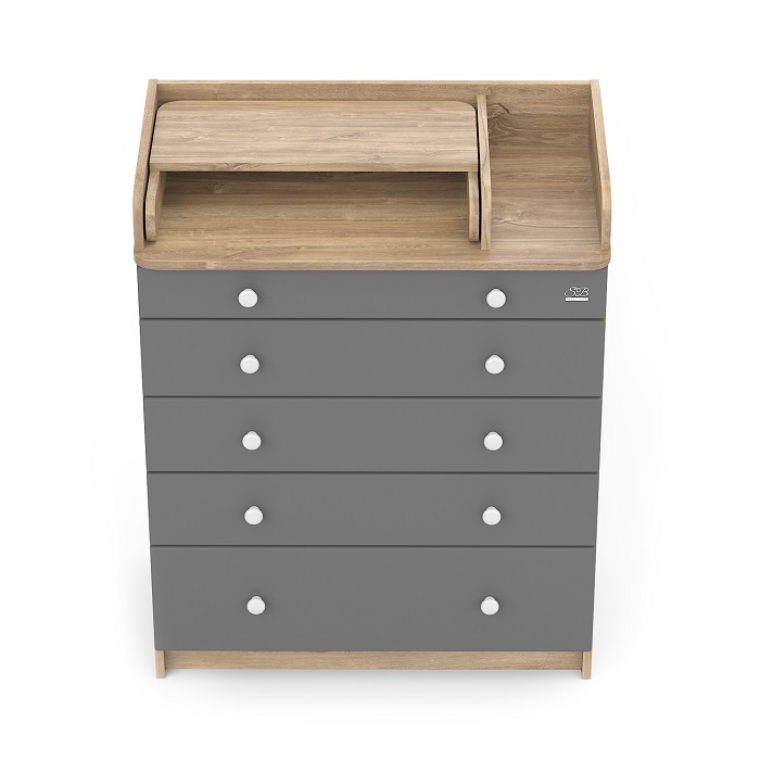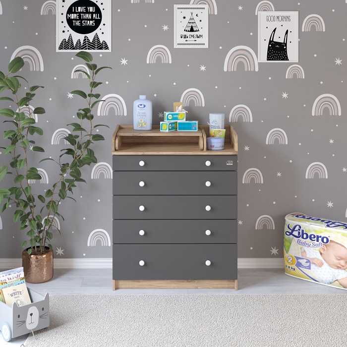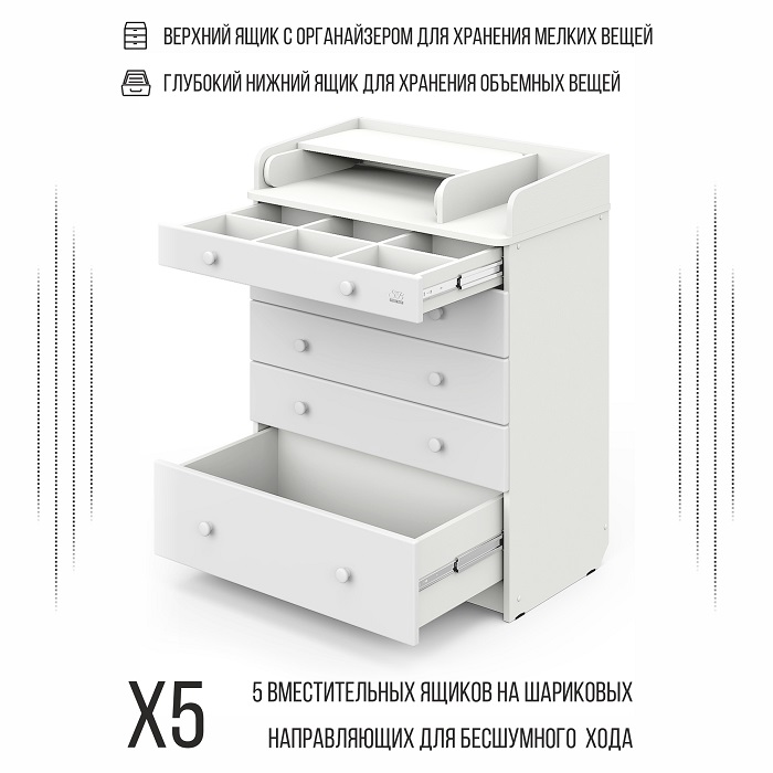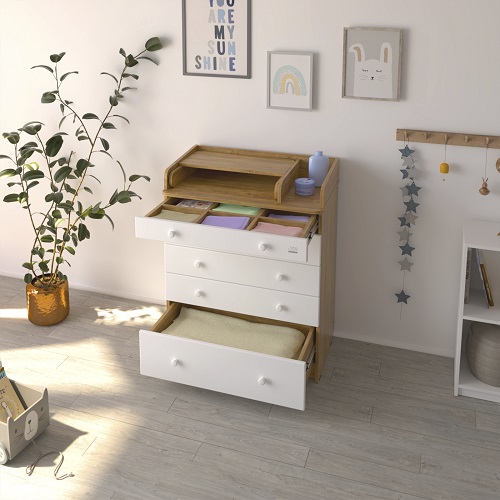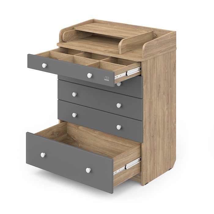 Комод Sweet Baby Marsala (Свит беби марсала) - практичный комод с органайзером для удобного хранения детских вещей. Преимущество данного комода в ящиках разного размера. Небольшие предметы вы сможете удобно разместить в верхних ящичках, а большие и более объемные вещи, как одеяло или комбинезон, удобно поместятся в большом нижнем ящике. Все ящики оснащены шарикоподшипниковыми направляющими для бесшумного хода. Так же комод оснащен складным пеленальным столиком, который поможет на удобной для вас высоте пеленать, переодевать ребенка и осуществлять все необходимые для малыша гигиенические процедуры. Когда пеленальная поверхность не нужна, она компактно складывается и может использоваться как дополнительная полочка. Комод создан в современном стиле и в комбинациях контрастных оттенков благородной древесины с нежными белыми или бежевыми фасадами. Комод устойчив, надежен, и прослужит вам длительный срок.