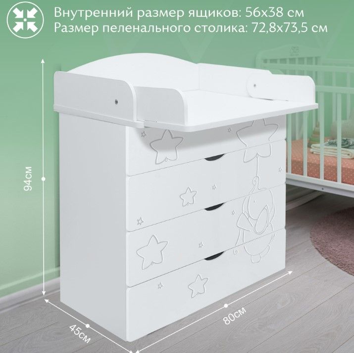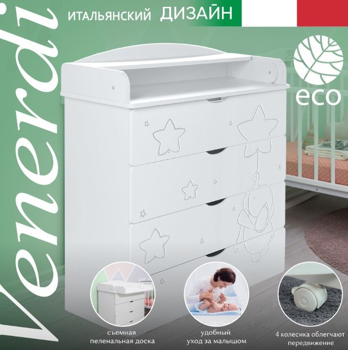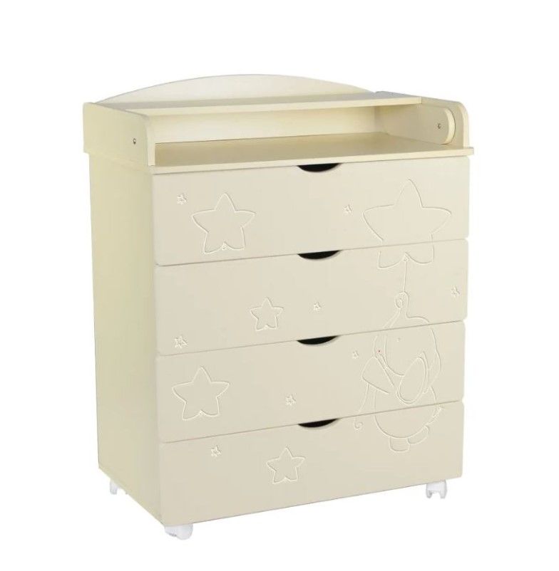 Комод Sweet Baby Venerdi Слон (Свит беби венерди) - красивый и практичный комод со съемным / раскладным пеленальный столиком. Этот комод удобен в эксплуатации и будет полезен не только пока малыш маленький, но и в дальнейшем, как вместительный бельевой комод. Большие ящики удобно выдвигаются и задвигаются. Комод оснащен складным пеленальным столиком. В сложенном виде столик не занимает много места и служит как дополнительное место для хранения вещей. В дальнейшем столик можно снять полностью. К комоду прикреплены 4 вращающихся колеса, за счет которых комод удобно передвигать по комнате. Мягкий пластик на каждом колесе обеспечивает бесшумное движение по половому покрытию, а также защищает его от царапин.