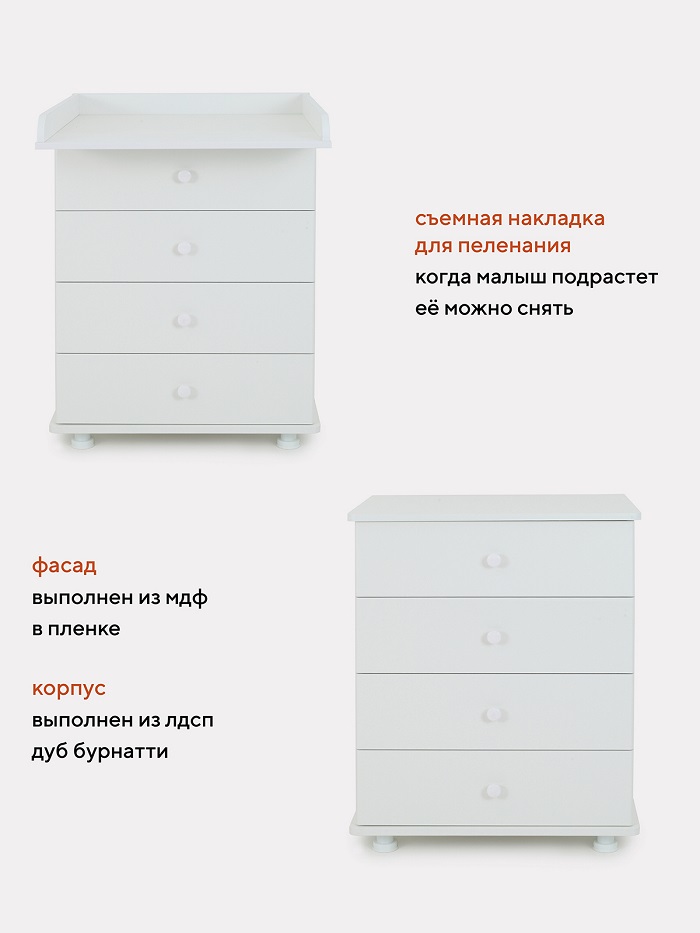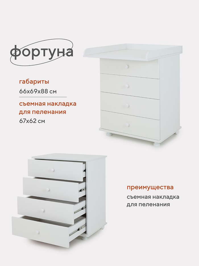 Комод Топотушки Фортуна 600/4 New - компактный и безопасный комод с пеленальным столиком. Новинка 2024 года - легко съемная пеленальная панель, которая превращает пеленальный комод в бельевой.