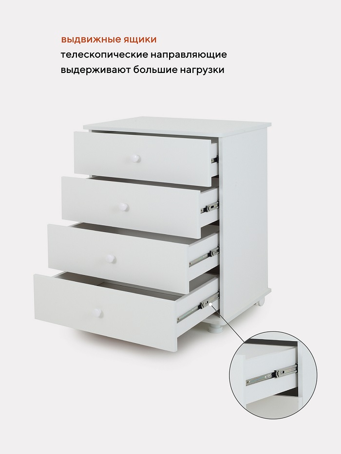- к тому же ящики дополнены телескопическими направляющими, благодаря которым комод способен выдерживать большие нагрузки на протяжении длительного времени