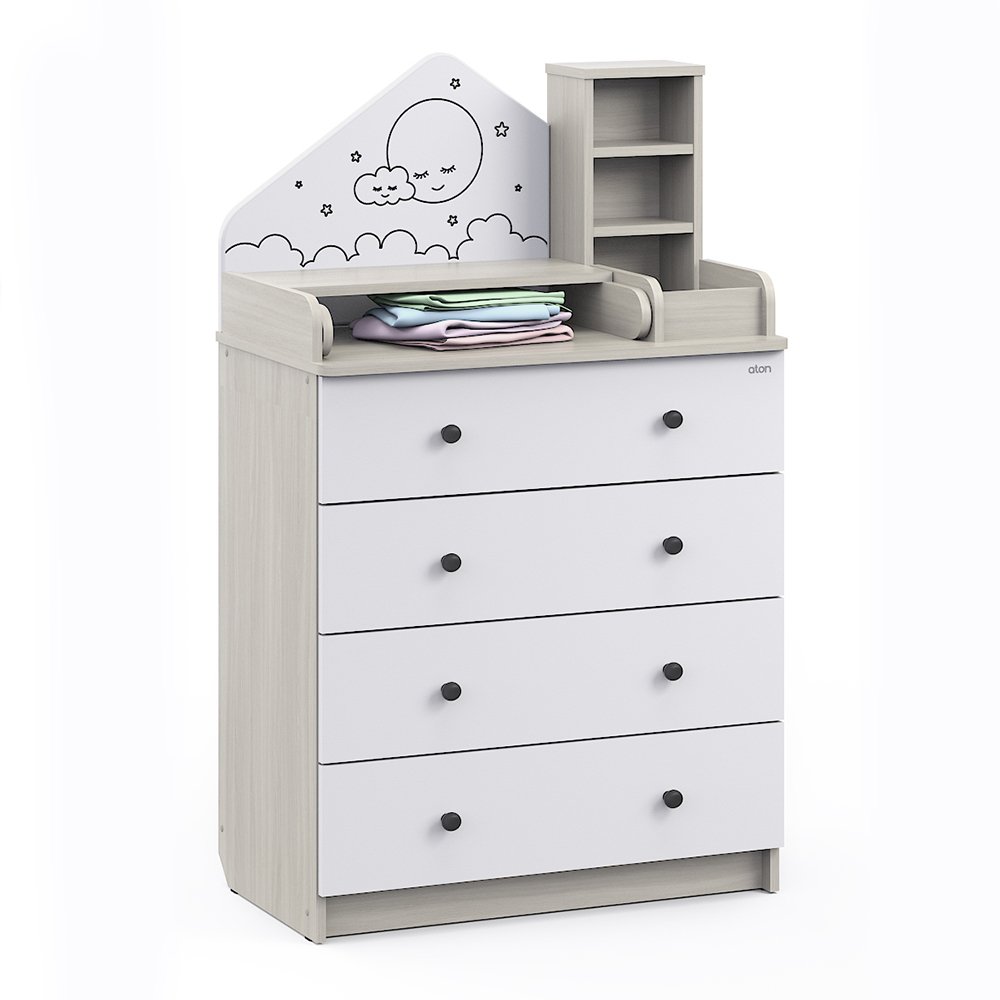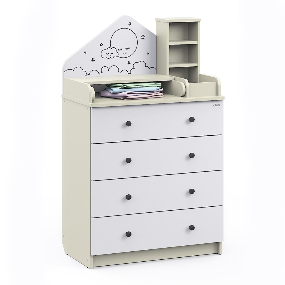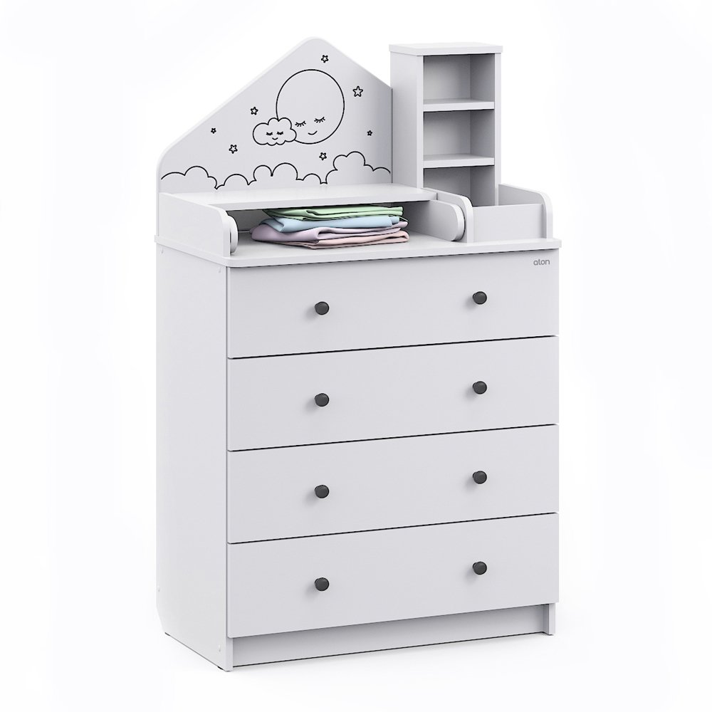 Детский комод трансформер Атон Сириус ALF 804 ЛДСП - это не просто комод, это уникальная система, которая сделает детскую комнату удобной и уютной. Красивый комод трансформируется в столик для ребенка и полноценный комод для хранения вещей. Пеленальный столик раскладывается для удобного переодевания малыша, а когда ребенок подрастет, легко снимается. Для детской косметики предусмотрены небольшие полочки. У вас всегда все будет под рукой. Комод украшен симпатичным "домиком", который придает комоду оригинальность.