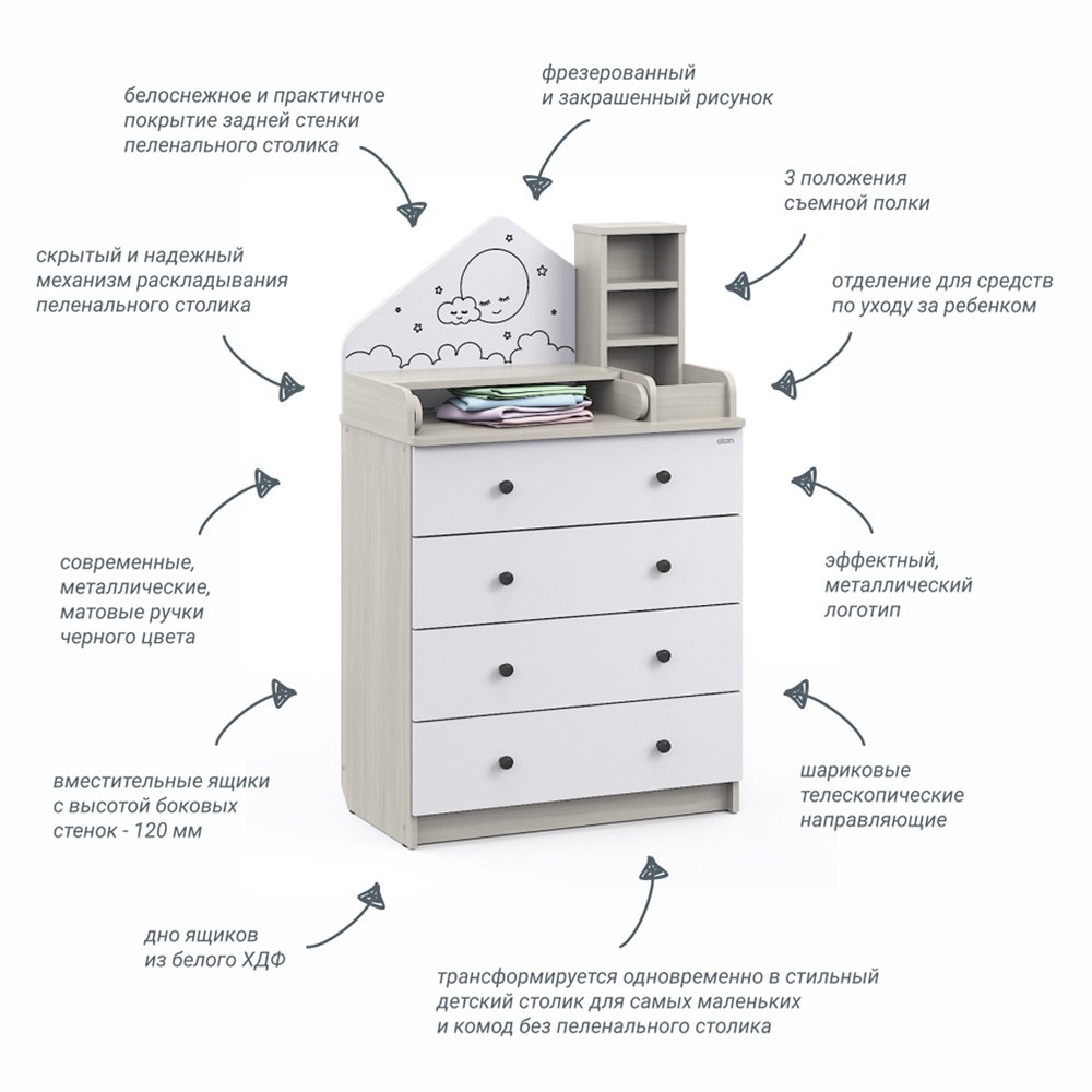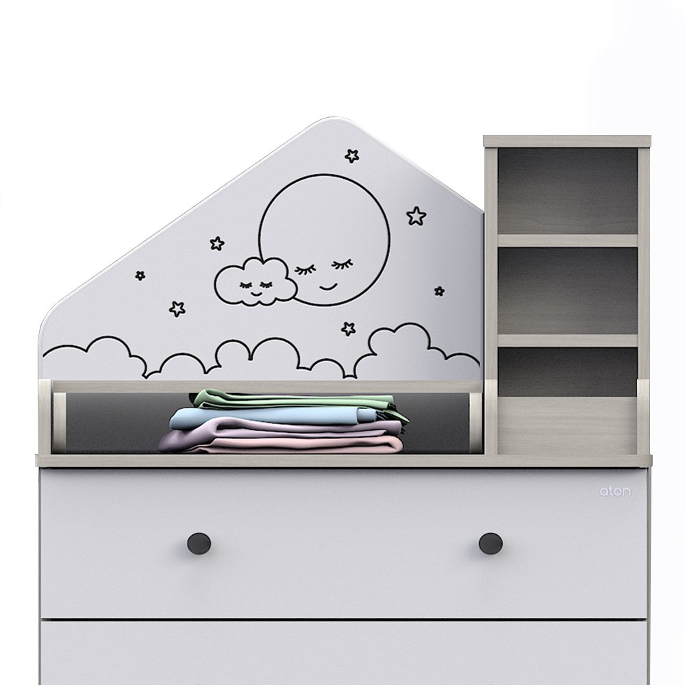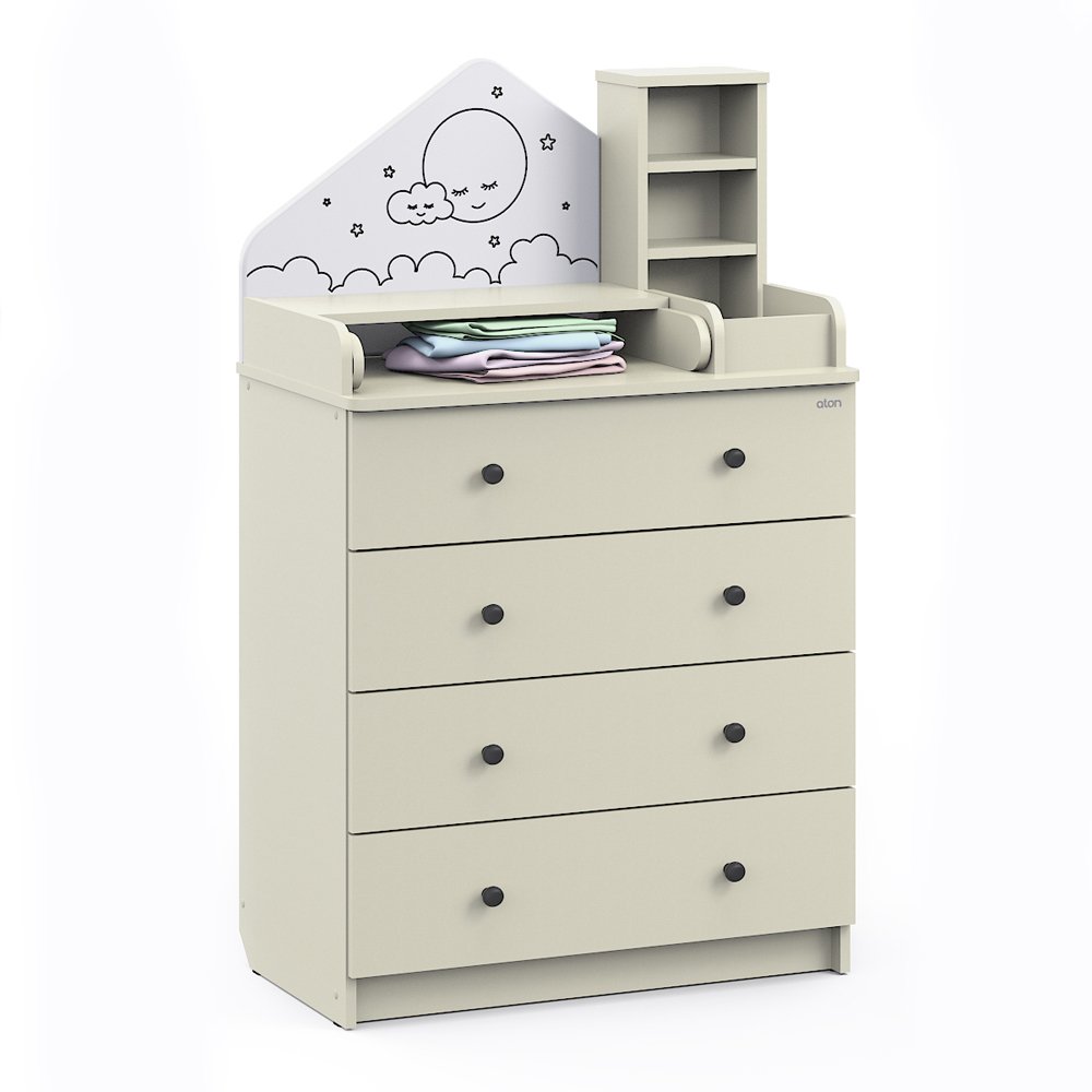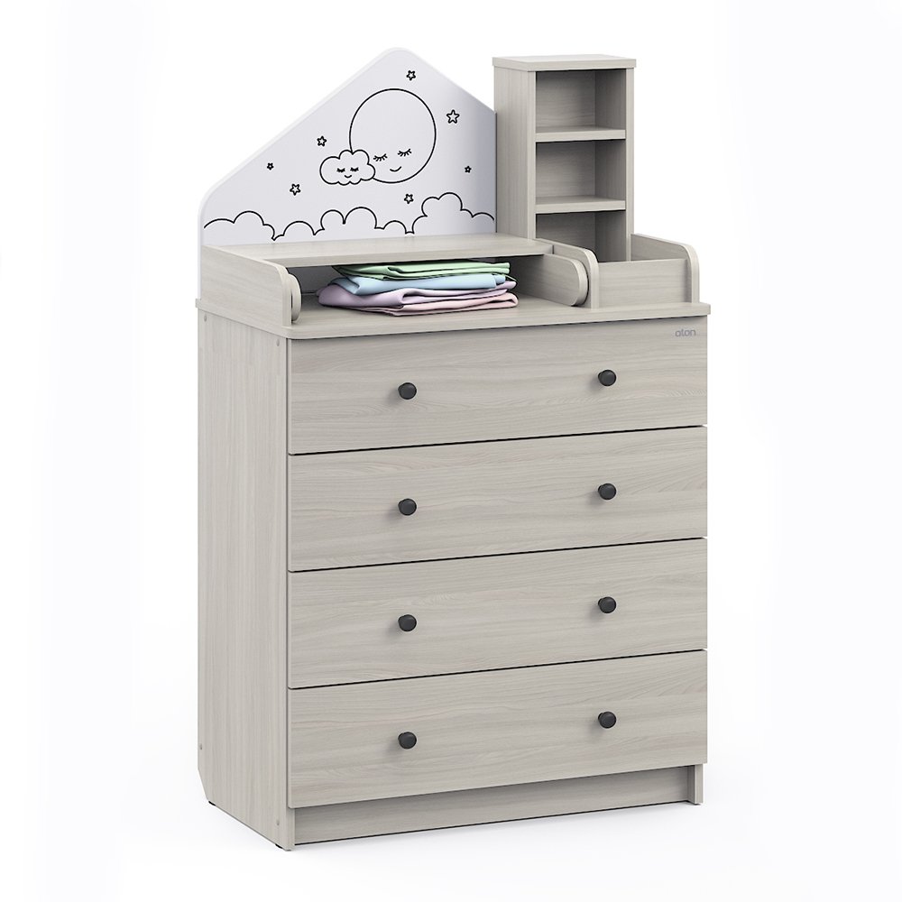 Детский комод трансформер Атон Сириус ALF 804 ЛДСП - это не просто комод, это уникальная система, которая сделает детскую комнату удобной и уютной. Красивый комод трансформируется в столик для ребенка и полноценный комод для хранения вещей. Пеленальный столик раскладывается для удобного переодевания малыша, а когда ребенок подрастет, легко снимается. Для детской косметики предусмотрены небольшие полочки. У вас всегда все будет под рукой. Комод украшен симпатичным "домиком", который придает комоду оригинальность.