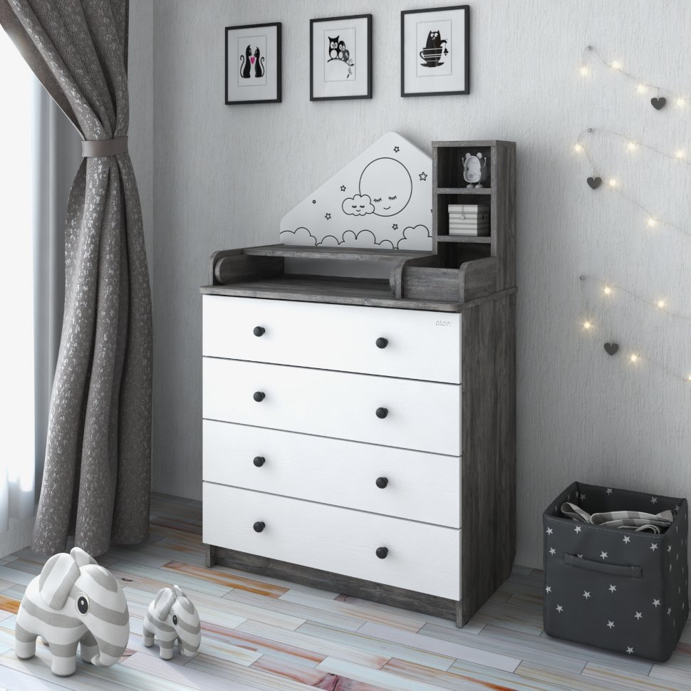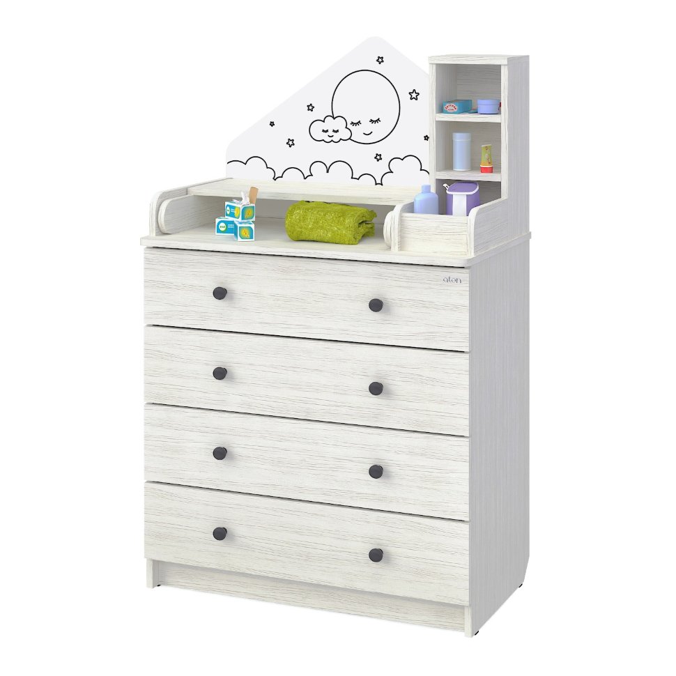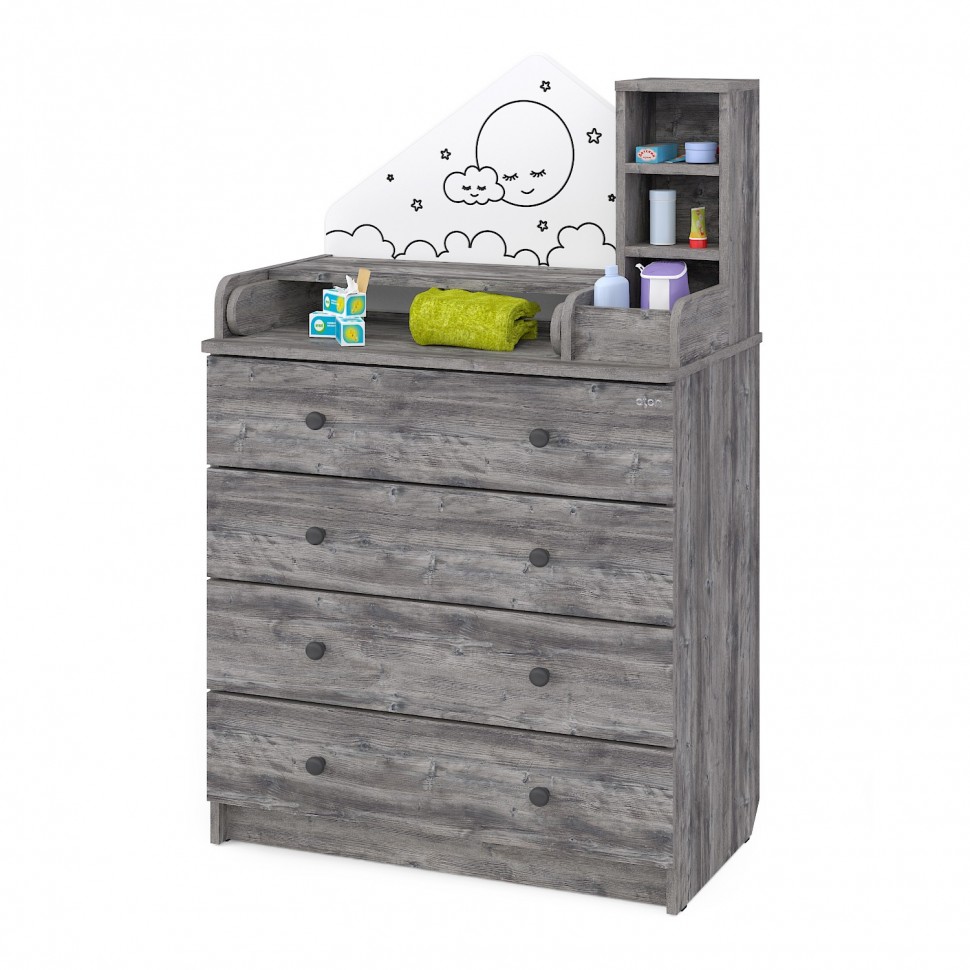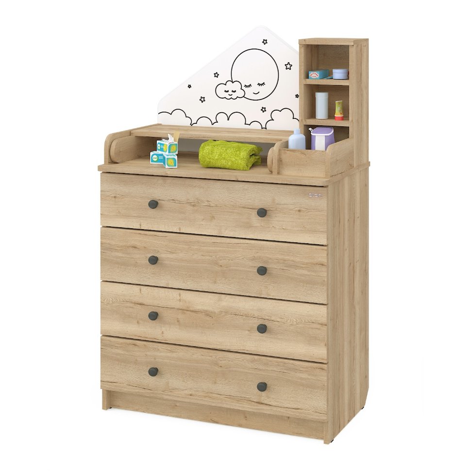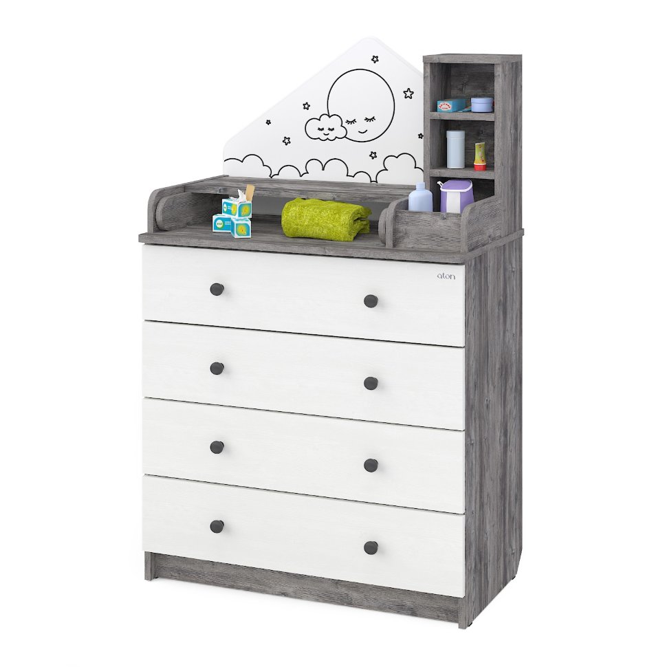 Комод трансформер АТОН Сириус ALF WOOD ЛДСП (альф вуд) - пеленальный комод с возможностью трансформации сразу в 2 предмета для ребенка постарше: стол и вещевой комод. Еще ни когда комод не был так удобен и действительно использовался долгий период времени. Вместительные ящики комода оборудованы шариковыми направляющими полного выдвижения. Специально для данного комода подобраны черные матовые ручки-кнопки из металла. Полочки и вместительное отделение рядом с пеленальным столиком позволит разместить все принадлежности по уходу за ребенком в быстром доступе. Верхняя полочка имеет 3 положения по высоте, либо её можно совсем убрать. У столешницы и пеленального столика комода скругленные углы для безопасности. Пеленальный столик оборудован скрытым и надежным механизмом раскладывания . Покрытие корпуса имитирует текстуру натуральной древесины.