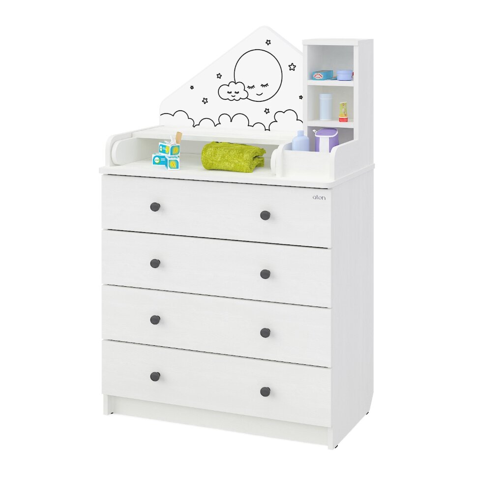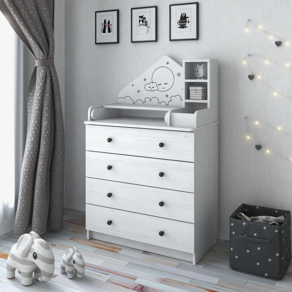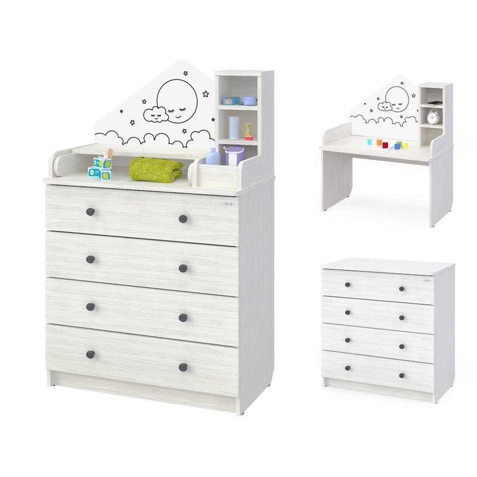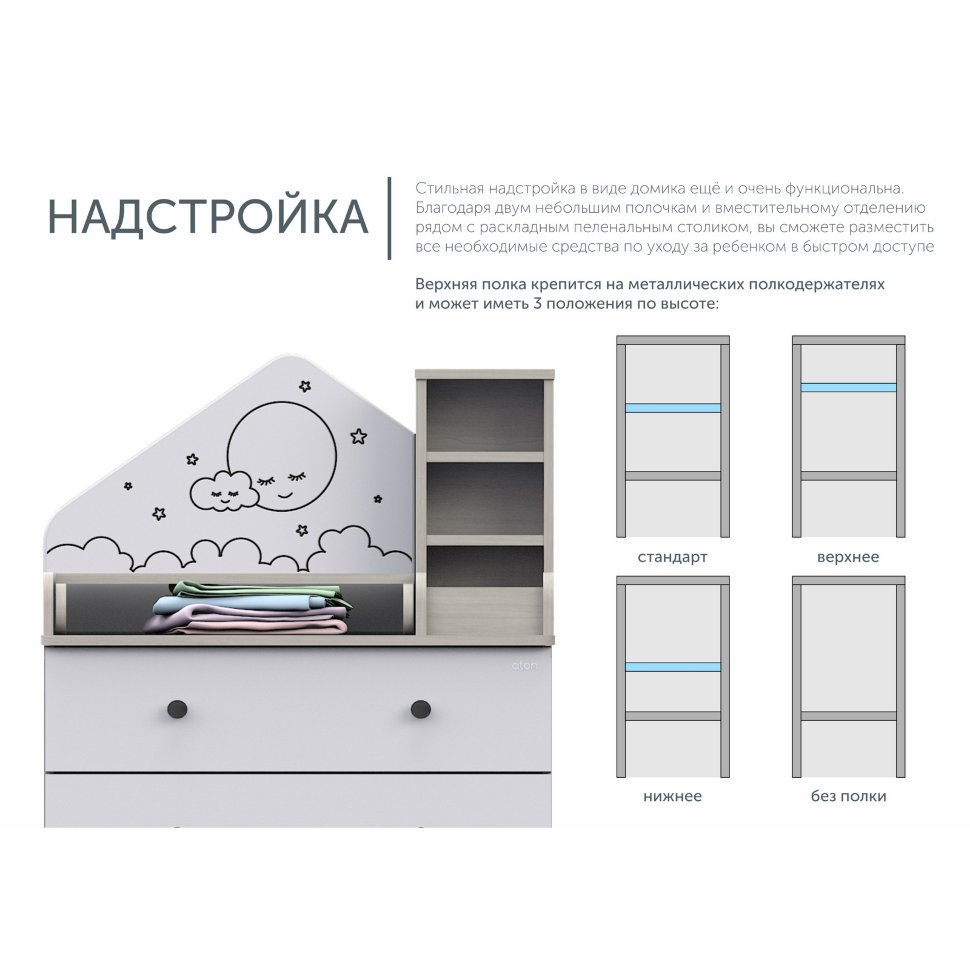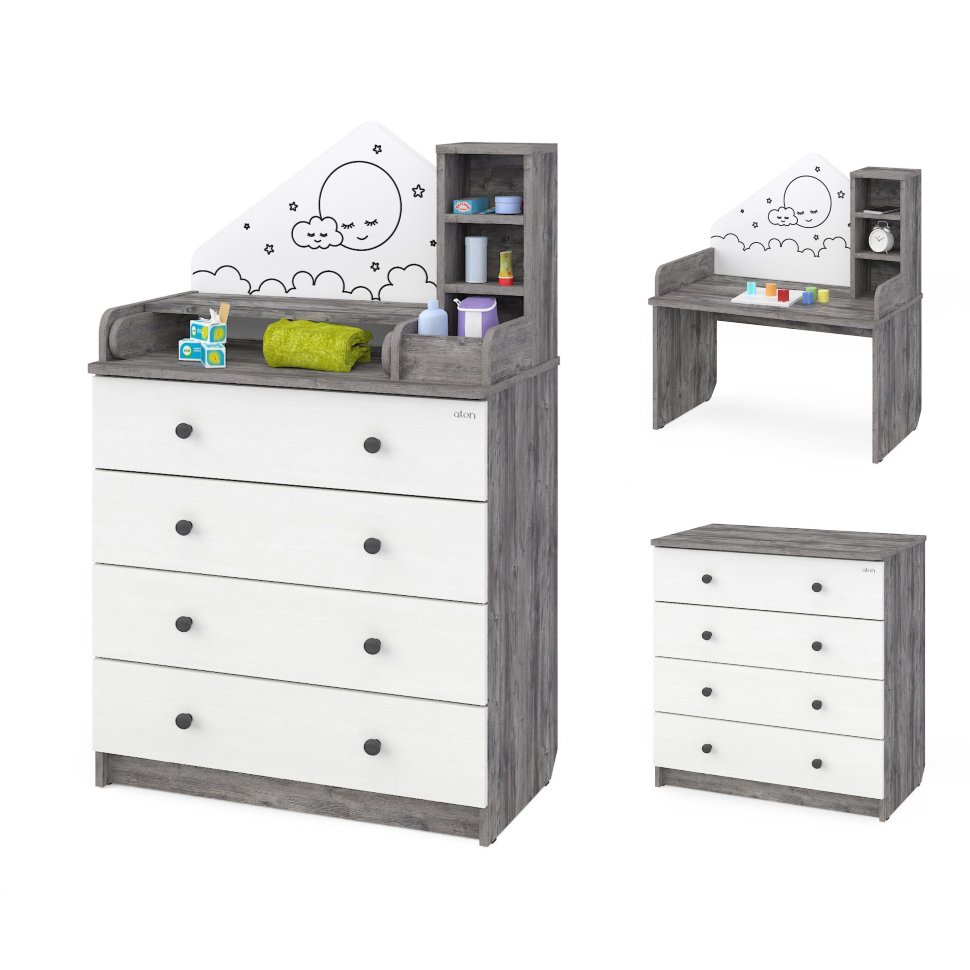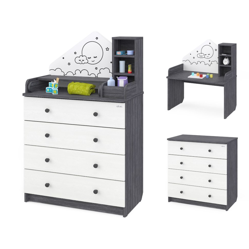 Комод трансформер АТОН Сириус ALF WOOD ЛДСП (альф вуд) - пеленальный комод с возможностью трансформации сразу в 2 предмета для ребенка постарше: стол и вещевой комод. Еще ни когда комод не был так удобен и действительно использовался долгий период времени. Вместительные ящики комода оборудованы шариковыми направляющими полного выдвижения. Специально для данного комода подобраны черные матовые ручки-кнопки из металла. Полочки и вместительное отделение рядом с пеленальным столиком позволит разместить все принадлежности по уходу за ребенком в быстром доступе. Верхняя полочка имеет 3 положения по высоте, либо её можно совсем убрать. У столешницы и пеленального столика комода скругленные углы для безопасности. Пеленальный столик оборудован скрытым и надежным механизмом раскладывания . Покрытие корпуса имитирует текстуру натуральной древесины.
