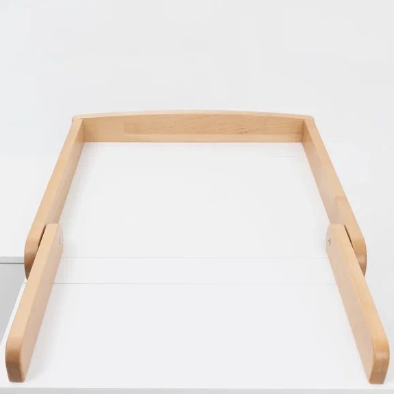 Пеленальная рамка образует на комоде полноценное удобное место для пеленания и переодевания ребенка. Ее можно установить с любой стороны комода, образуя дополнительное место для хранения детских вещей, или посередине. При необходимости "пеленальный столик" складывается или легко снимается, не оставляя следов на комоде.