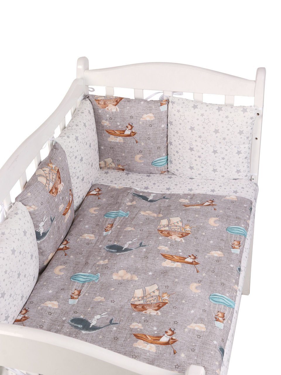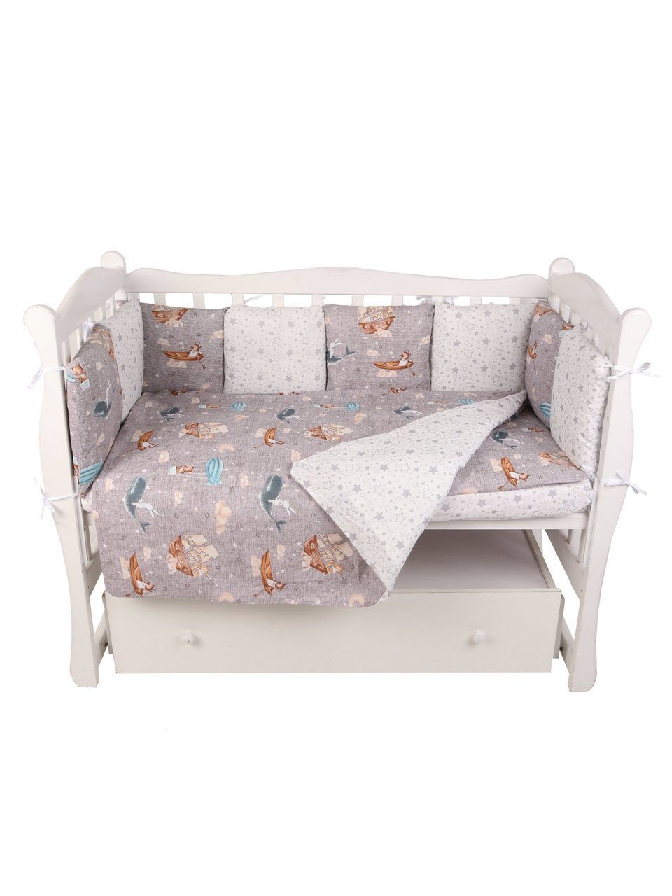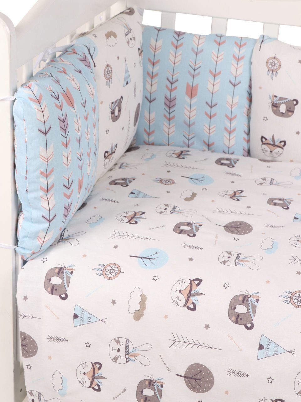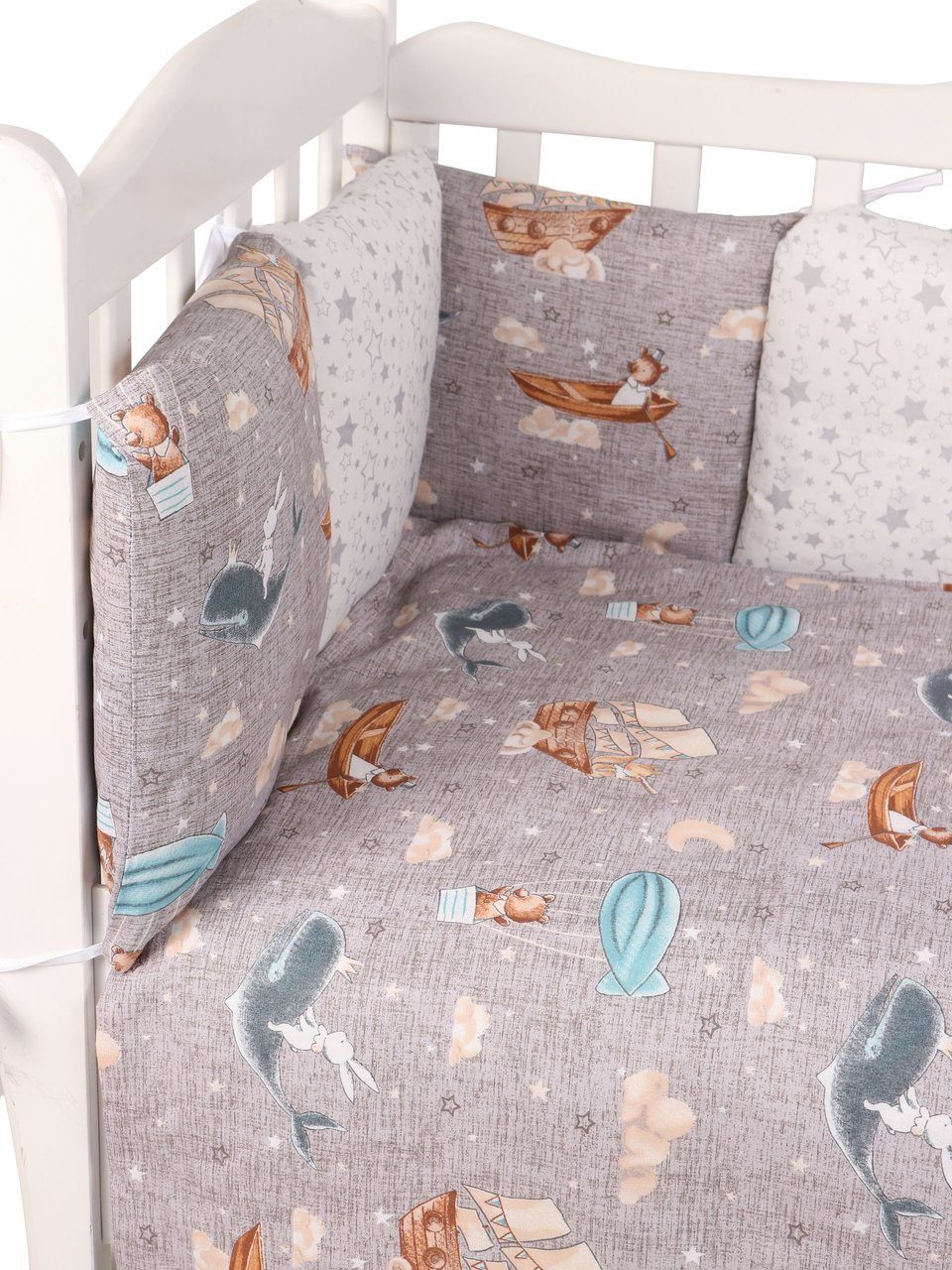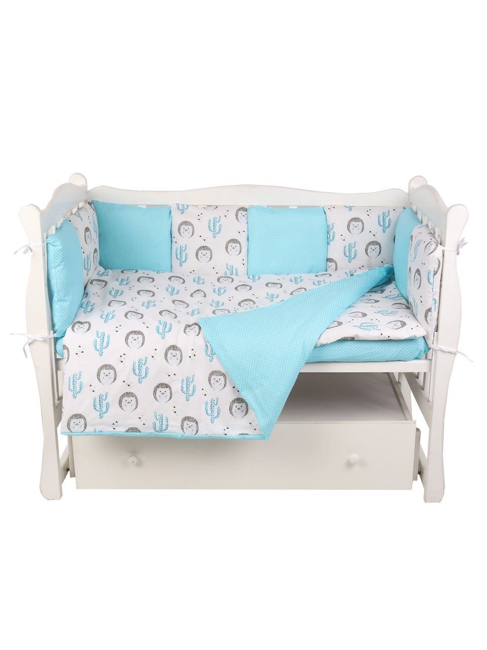 Бортик комплекта постельного белья представлен в виде 12ти подушек на завязках, наволочки на бортиках съёмные, на молнии. Мягкий наполнитель бортиков детского комплекта постельного белья обезопасит сон вашего малыша.
