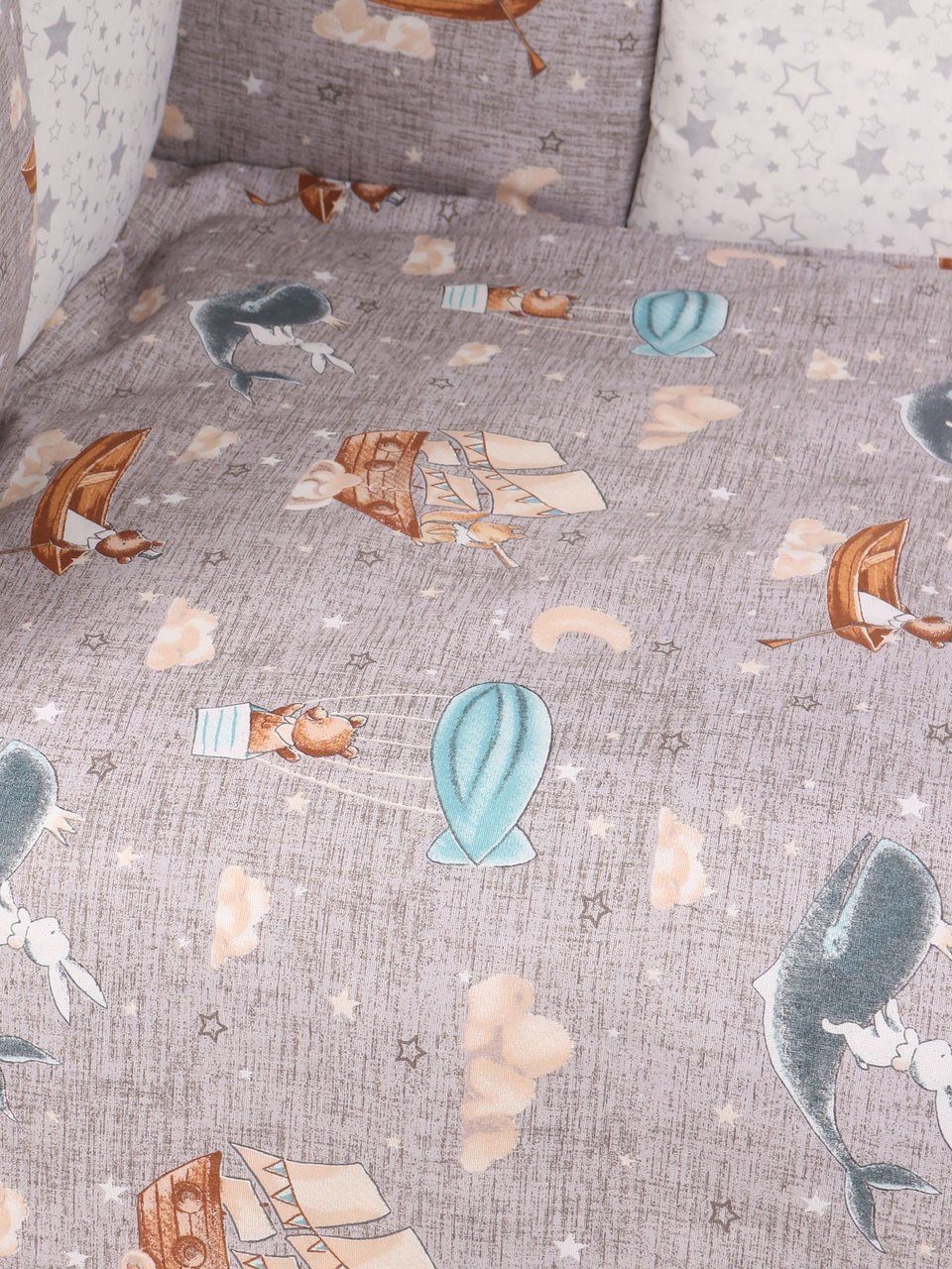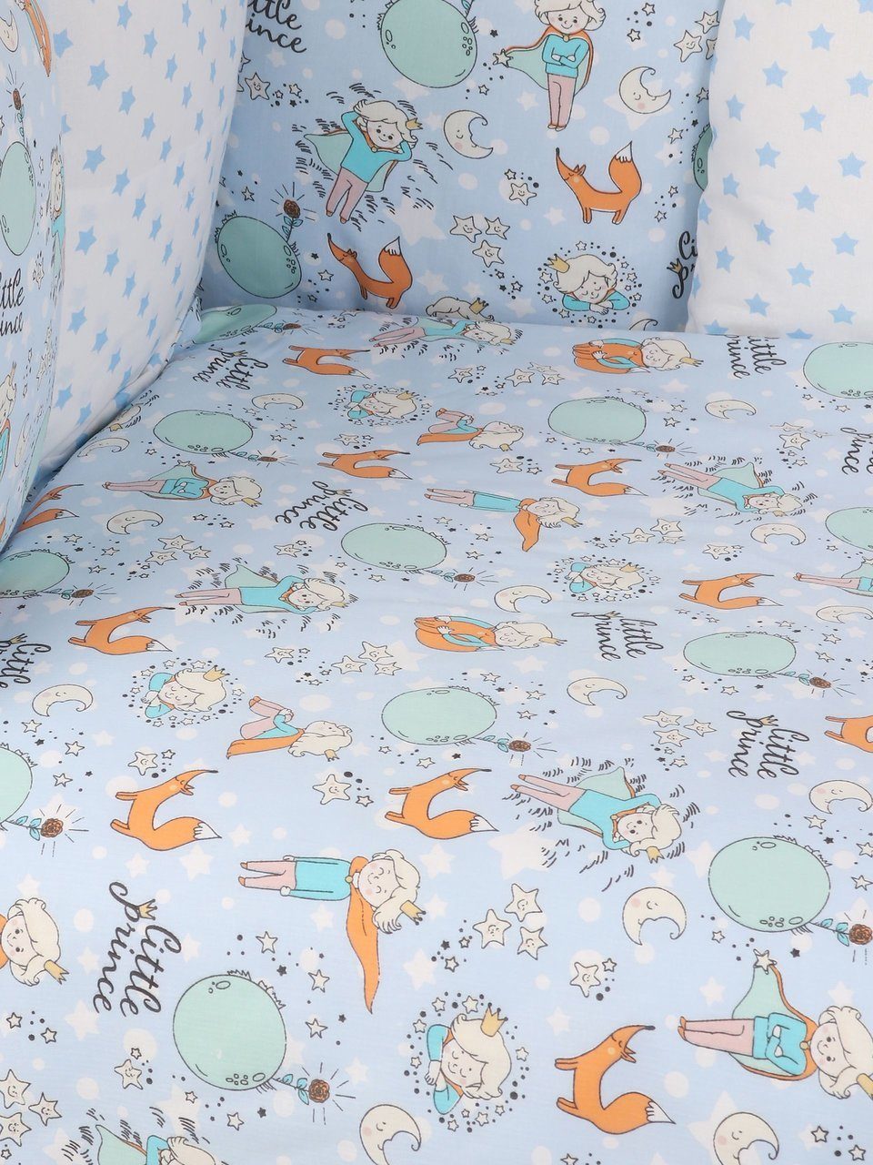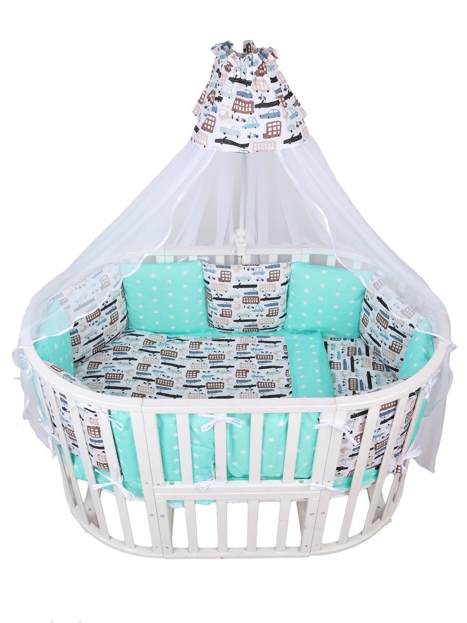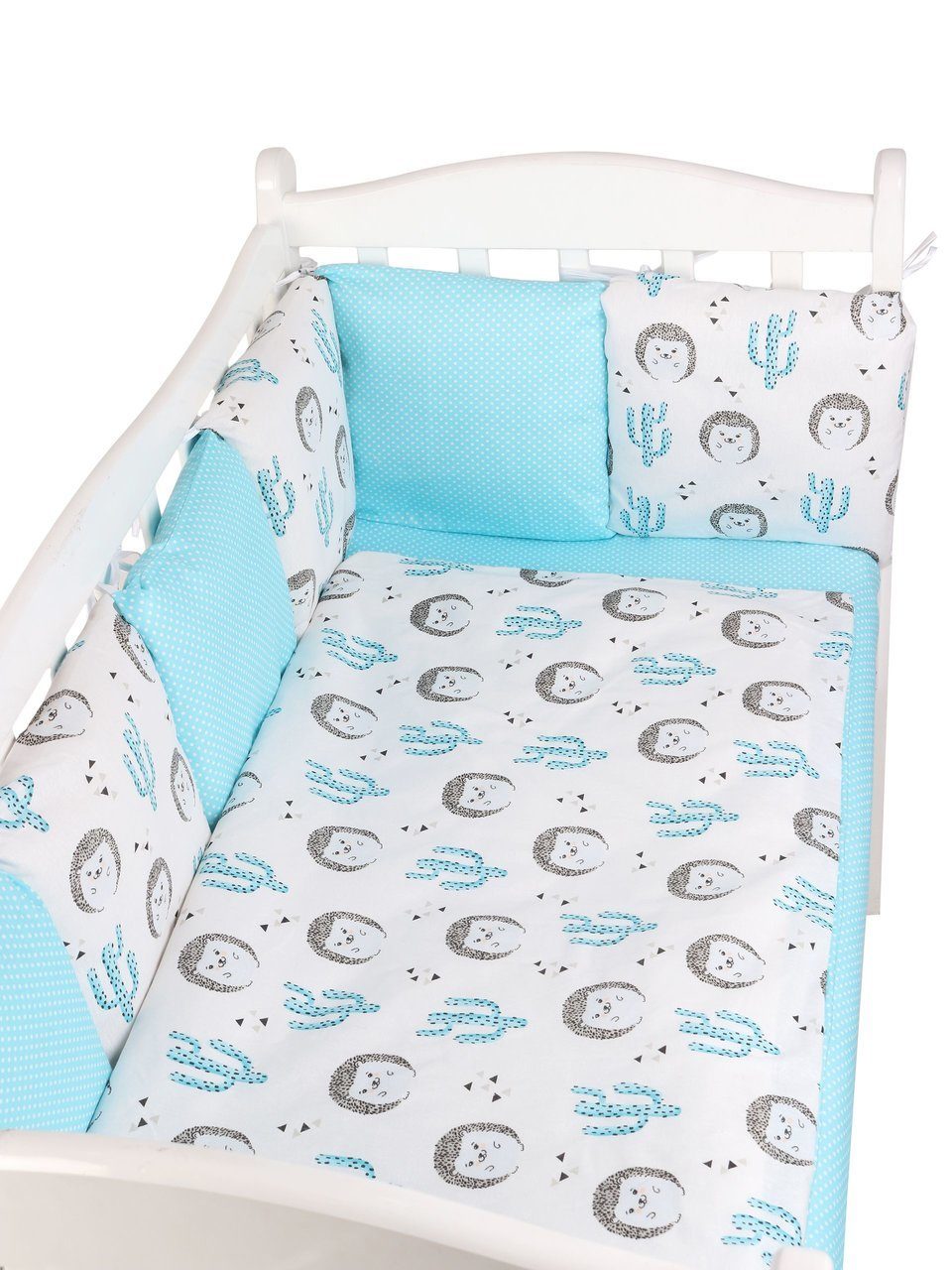 Бортик комплекта постельного белья представлен в виде 12ти подушек на завязках, наволочки на бортиках съёмные, на молнии. Мягкий наполнитель бортиков детского комплекта постельного белья обезопасит сон вашего малыша.