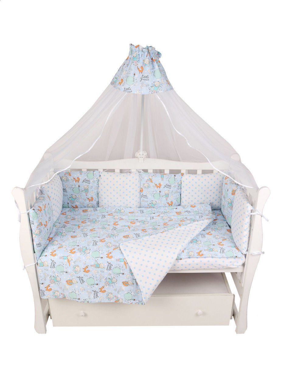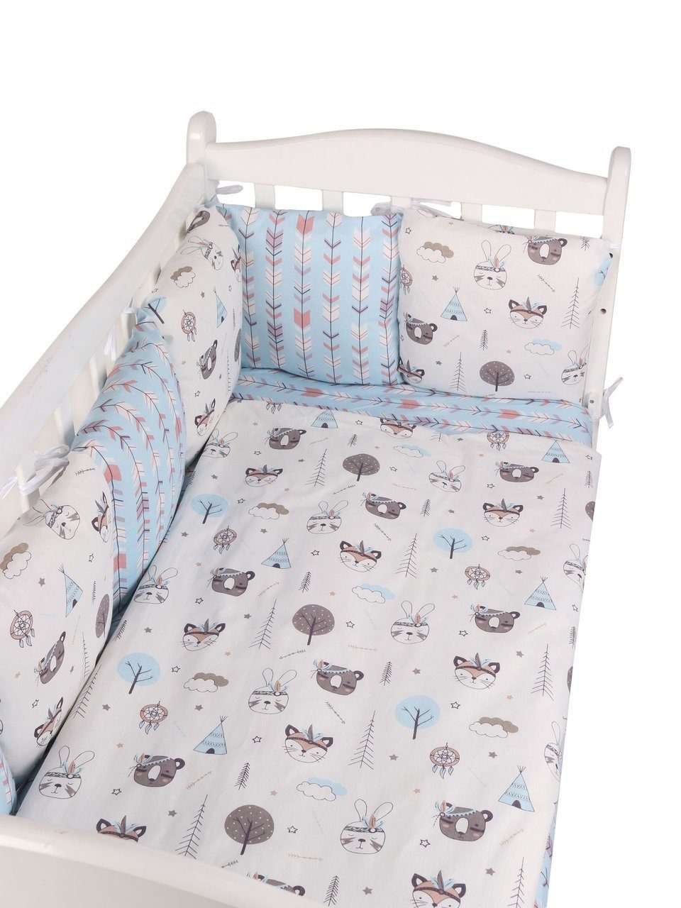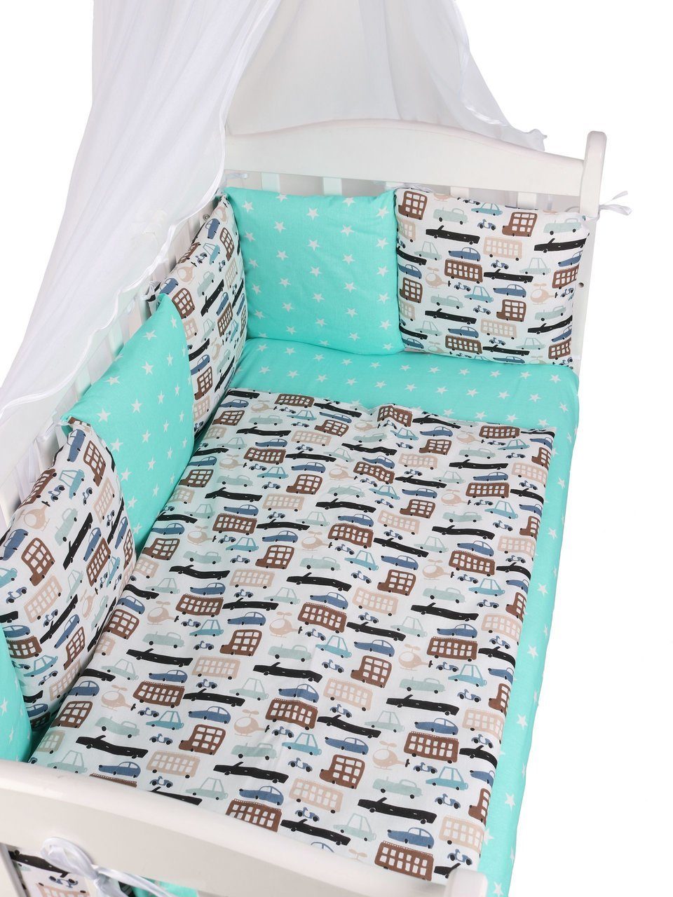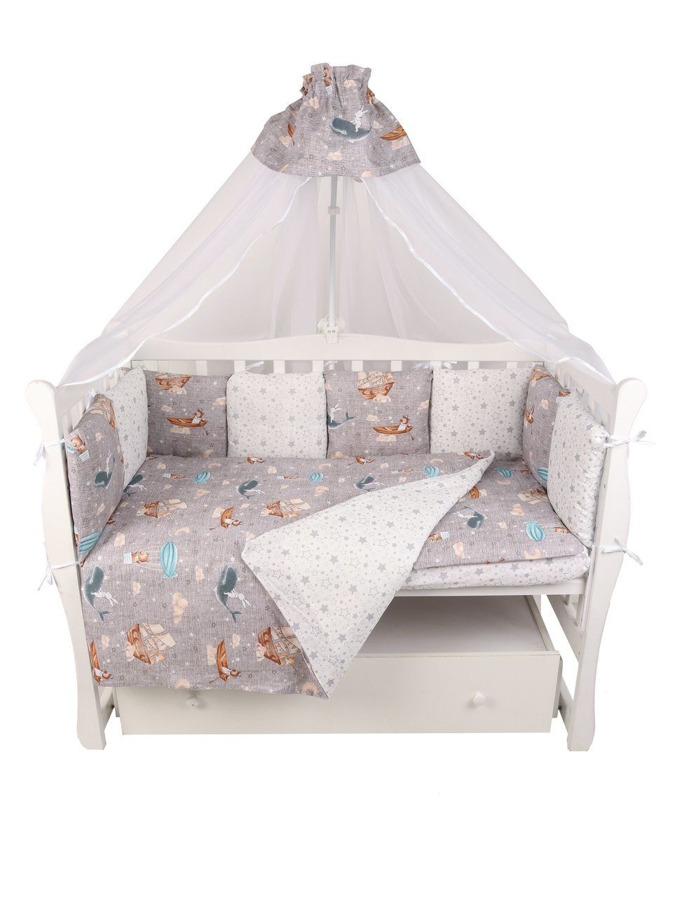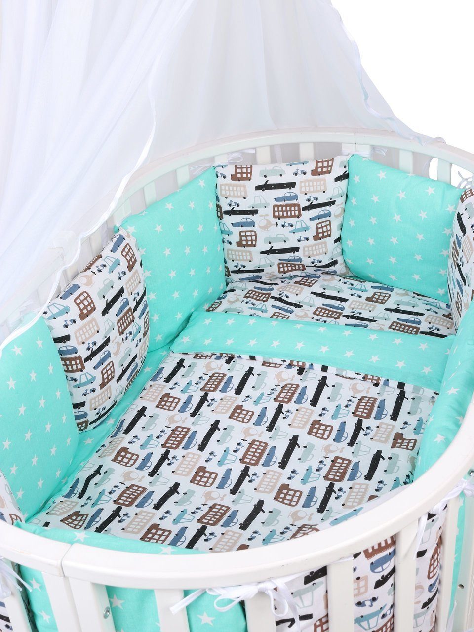 Бортик комплекта постельного белья представлен в виде 12ти подушек на завязках, наволочки на бортиках съёмные, на молнии. Мягкий наполнитель бортиков детского комплекта постельного белья обезопасит сон вашего малыша.