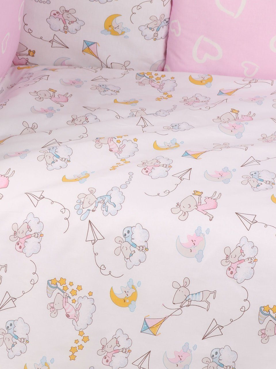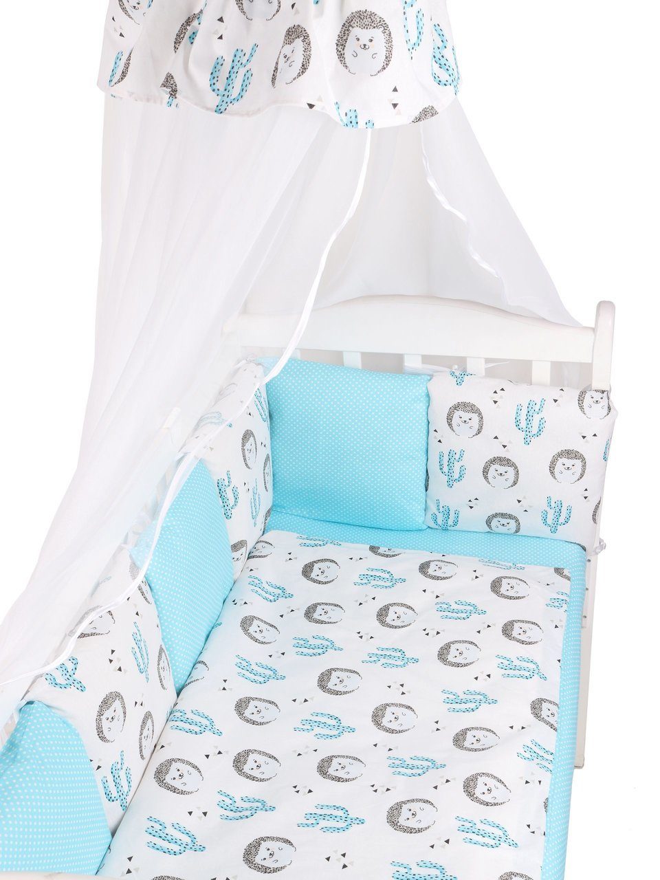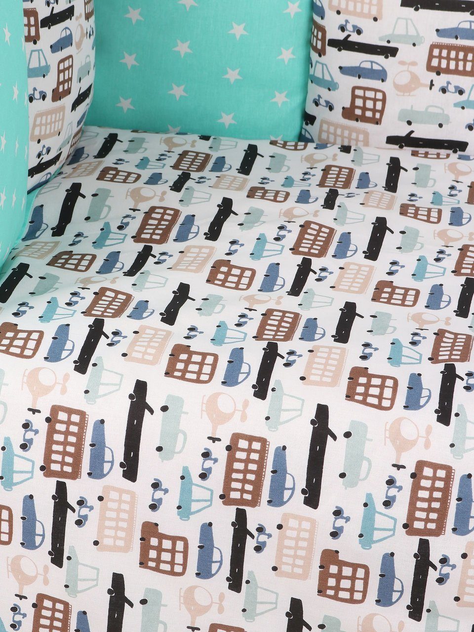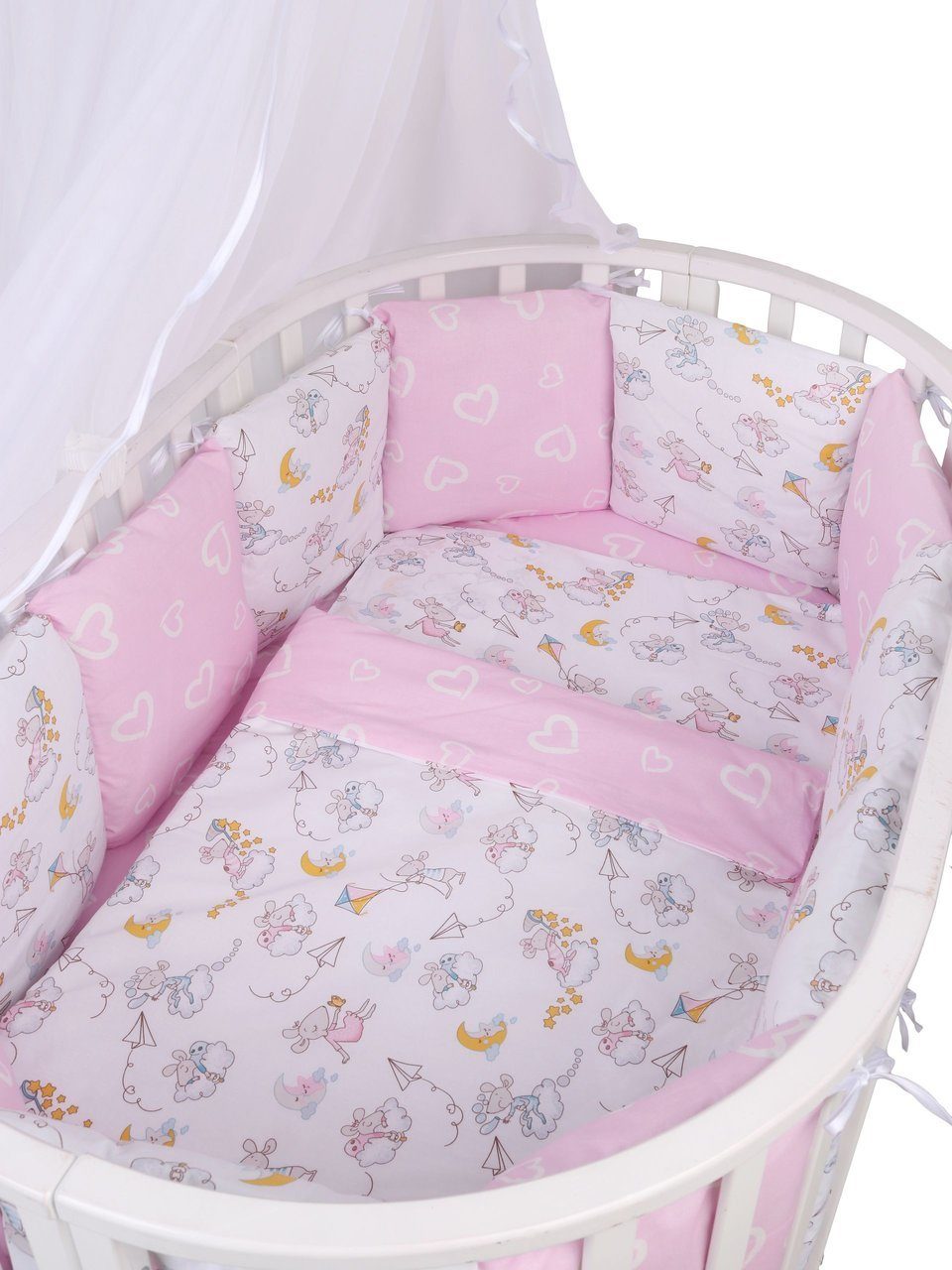 Бортик комплекта постельного белья представлен в виде 12ти подушек на завязках, наволочки на бортиках съёмные, на молнии. Мягкий наполнитель бортиков детского комплекта постельного белья обезопасит сон вашего малыша.