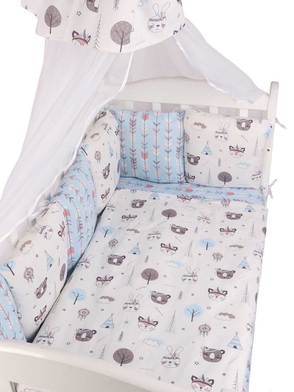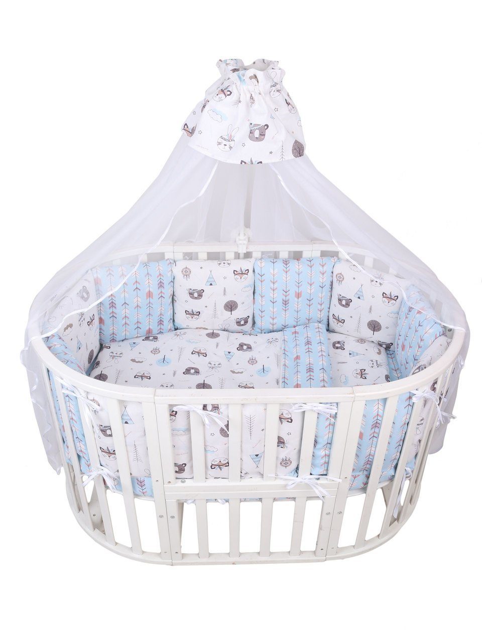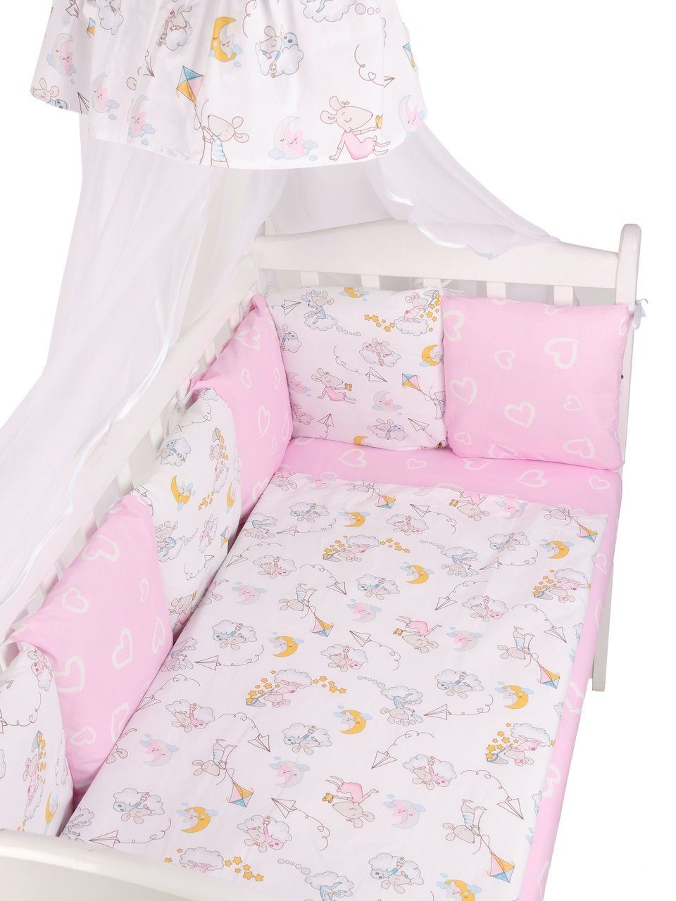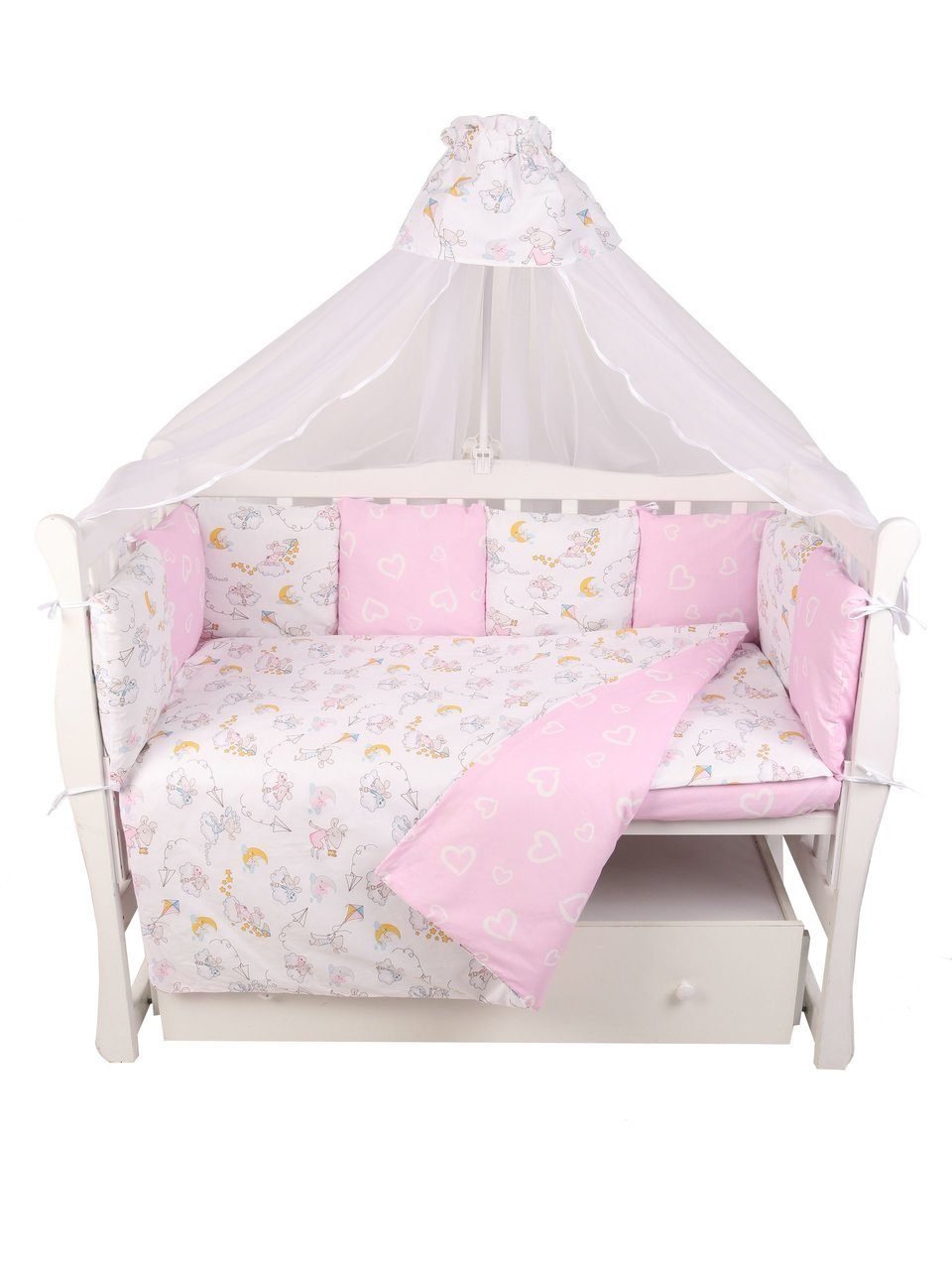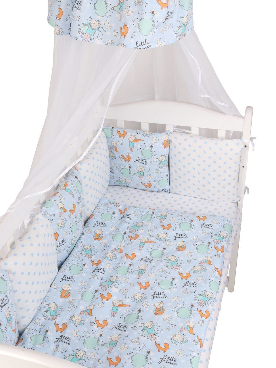 Бортик комплекта постельного белья представлен в виде 12ти подушек на завязках, наволочки на бортиках съёмные, на молнии. Мягкий наполнитель бортиков детского комплекта постельного белья обезопасит сон вашего малыша.