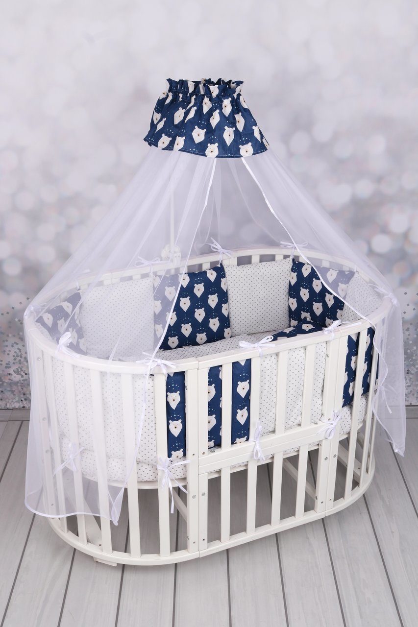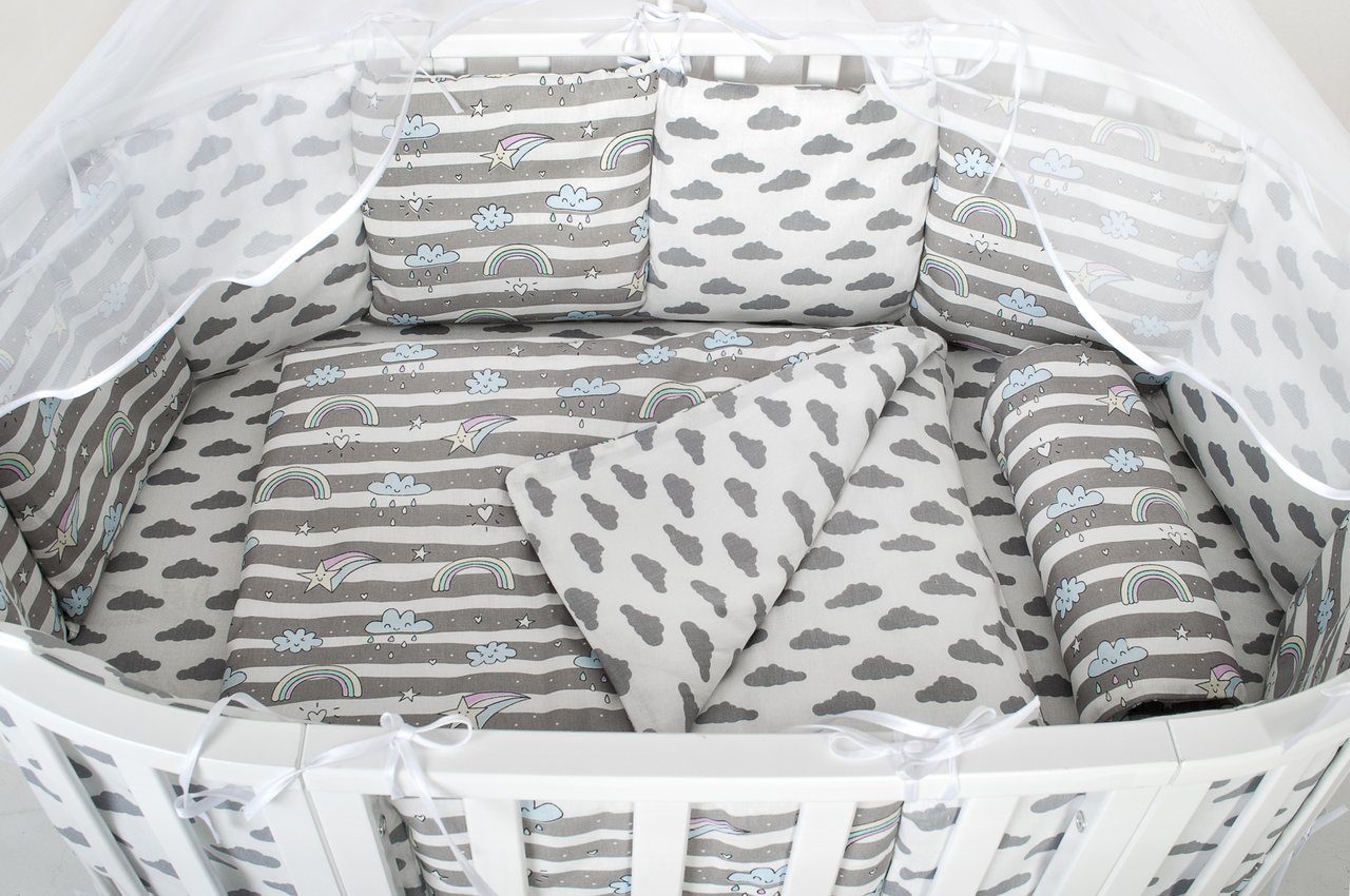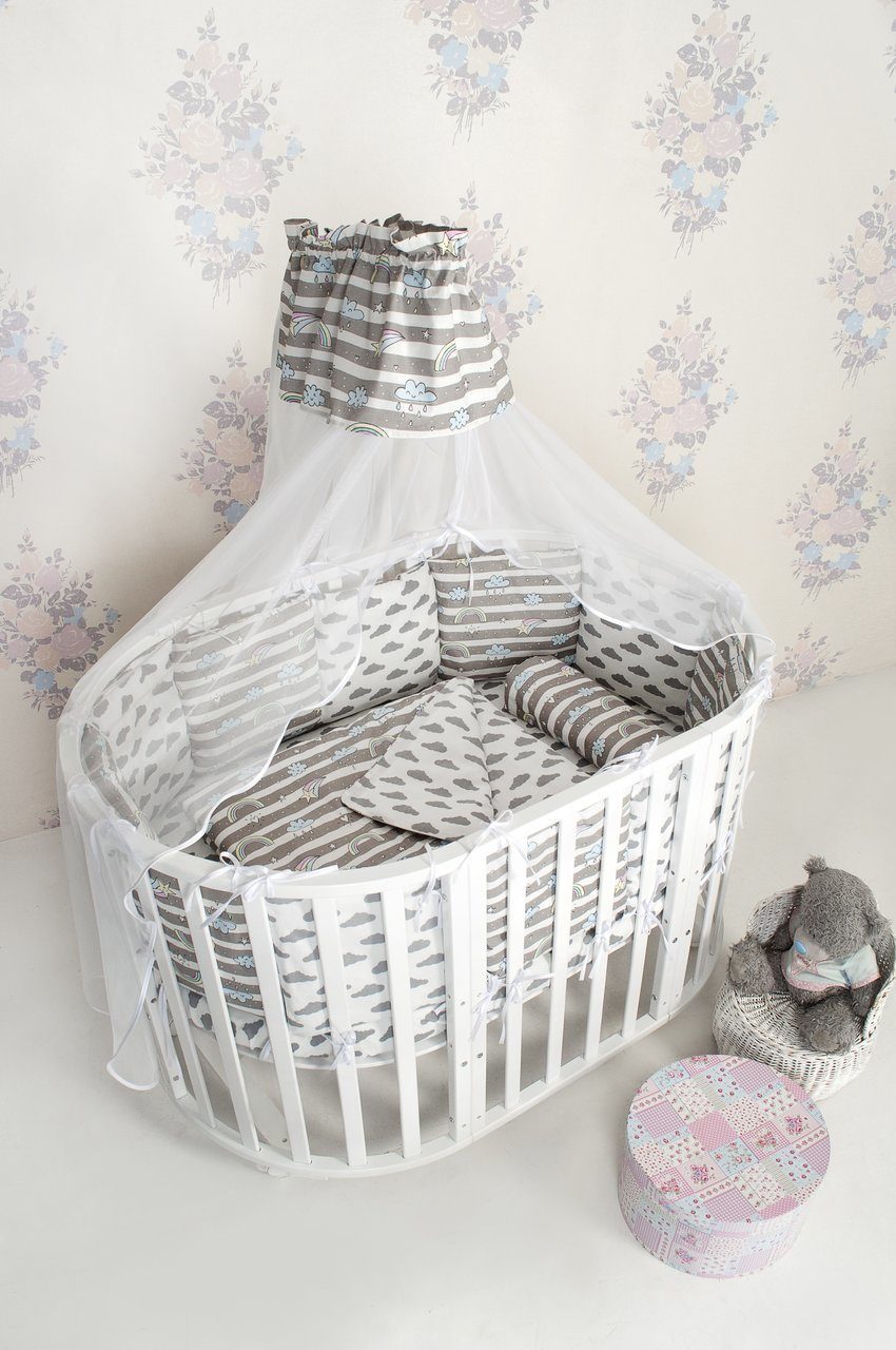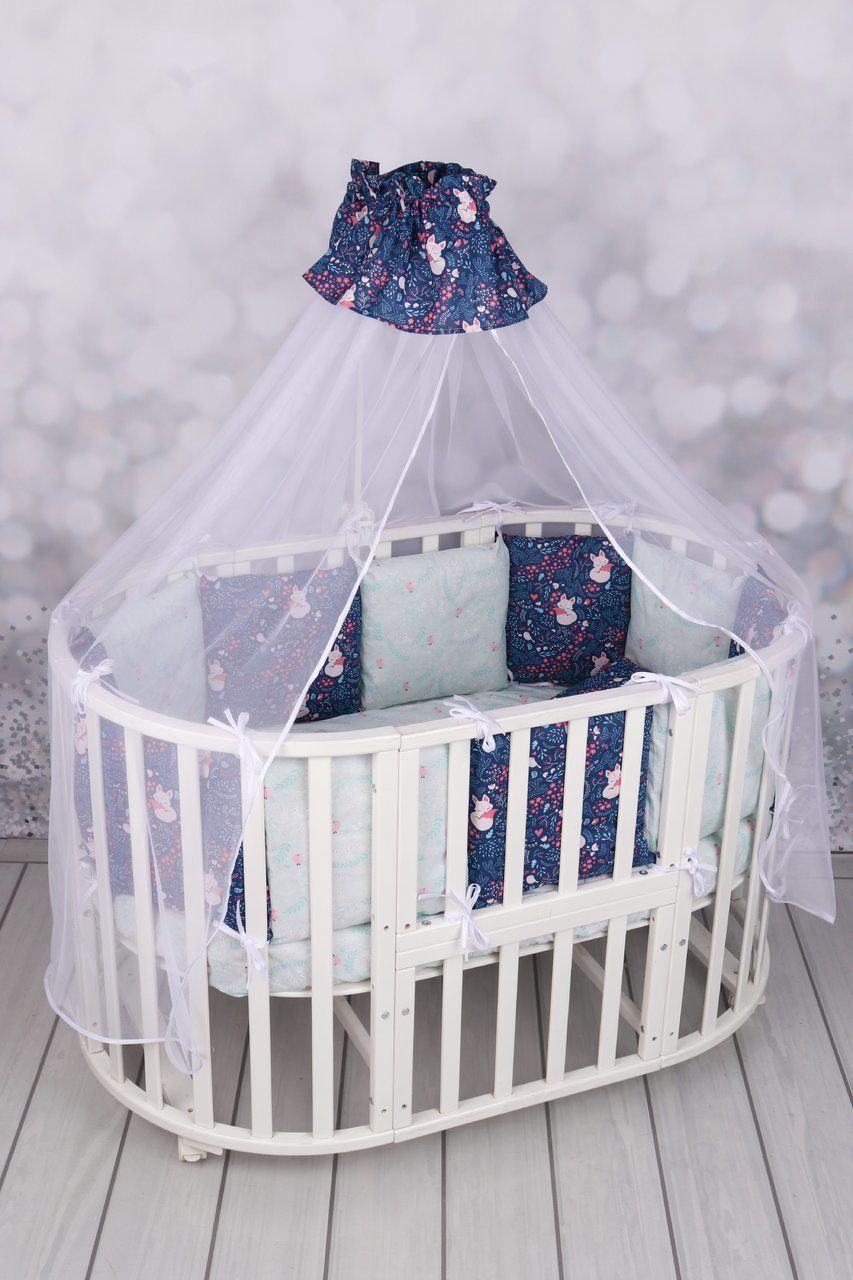 Комплект в кроватку от AmaroBaby имеет универсальную простыня на резинке, подходящую как на овальный, так и на прямоугольный матрас, а также простыня можно использовать и для круглого матраса.