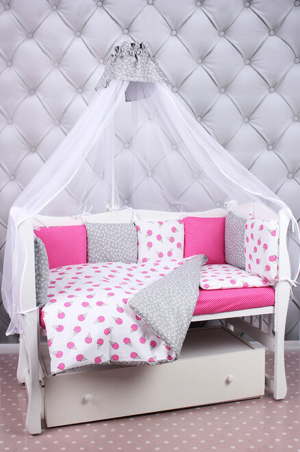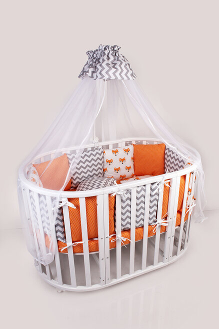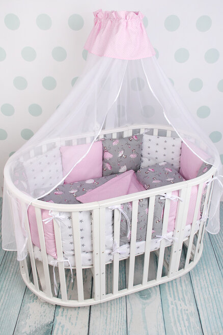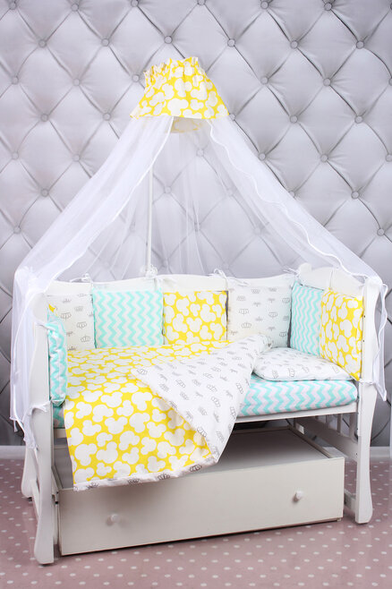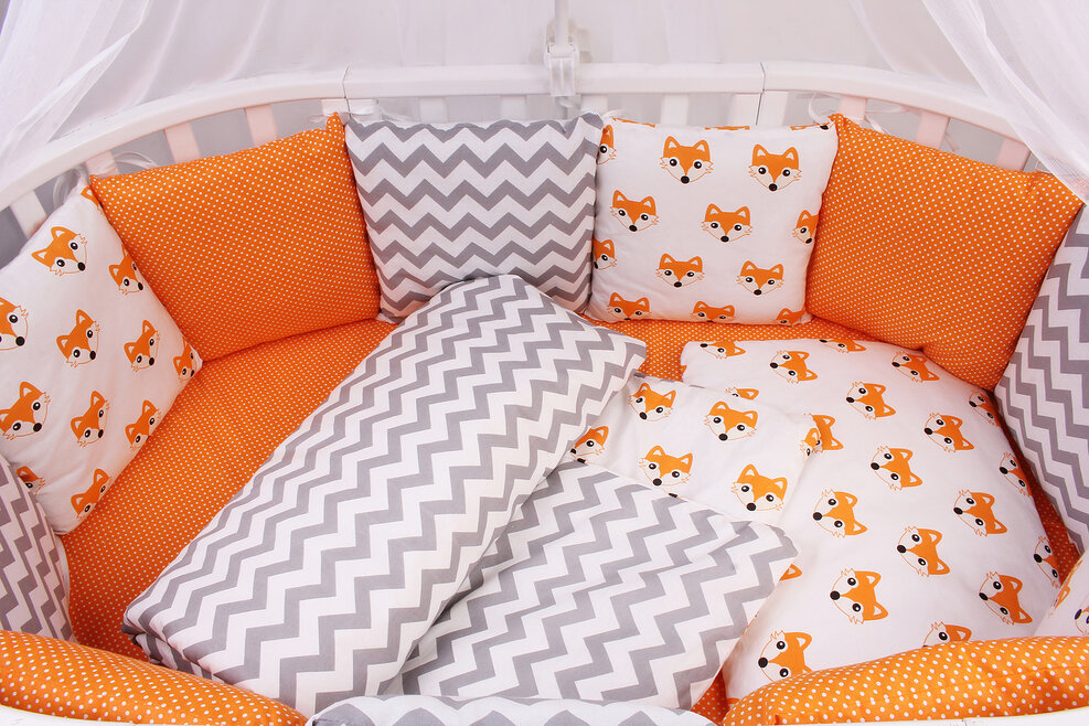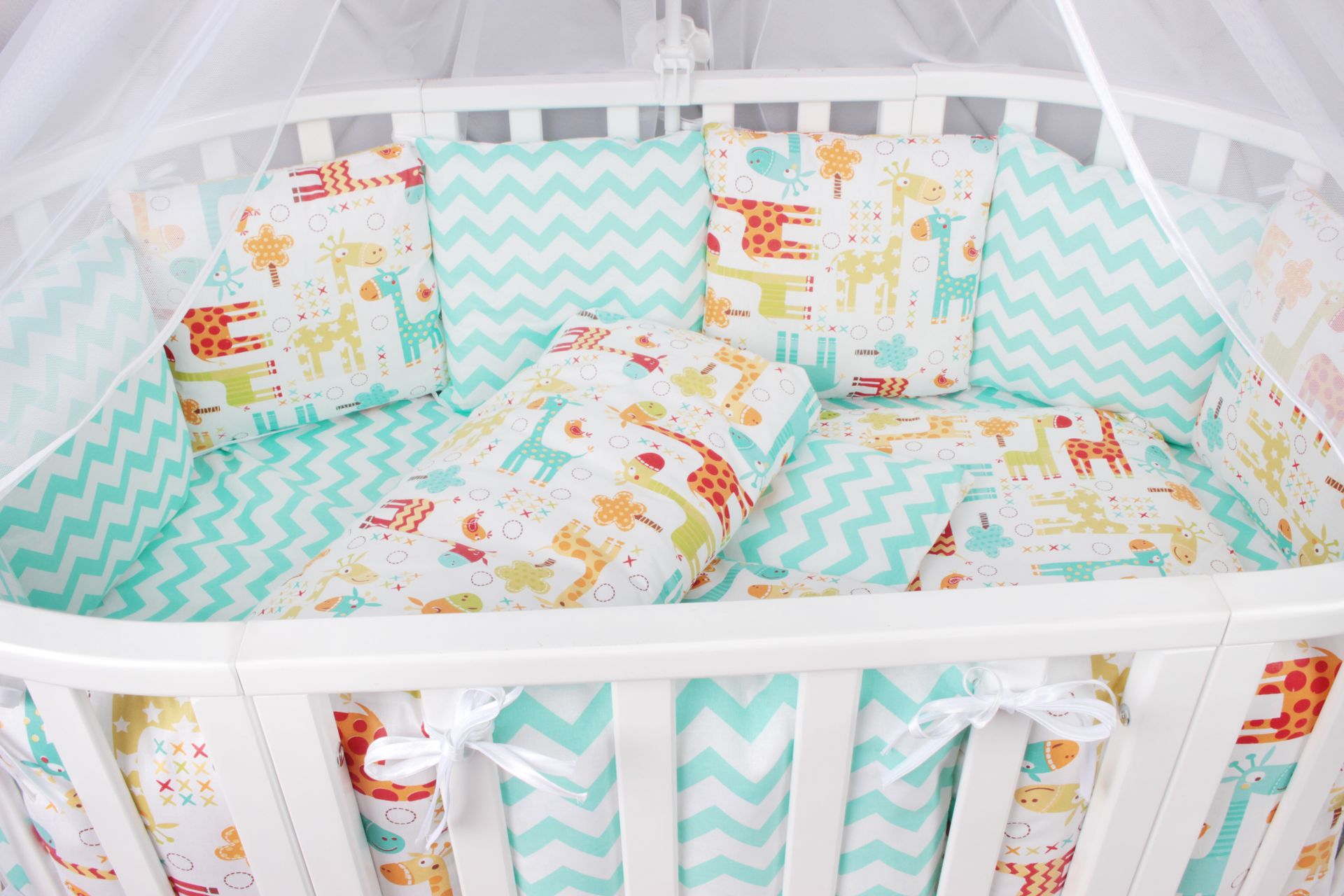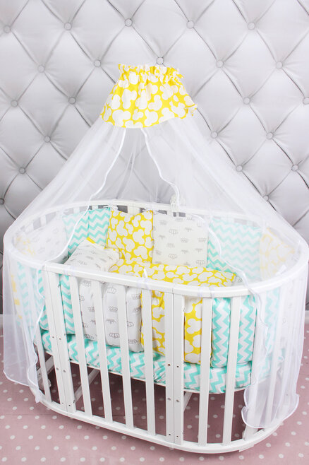 Поэтому эти комплекты идеально подходят на все виды кроваток!!! Особенно удобен комплект для использования в круглой кроватке, так как простыни уже адаптированы под ее нестандартную форму. Бортики представлены в виде 12 декоративных подушек на завязках, можно комбинировать по настроению.
