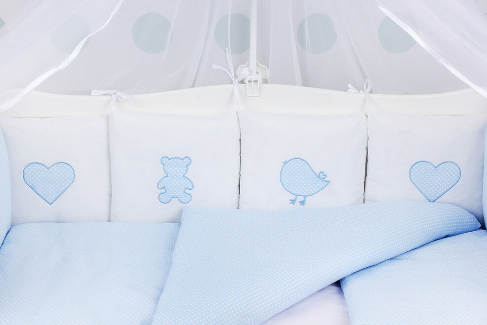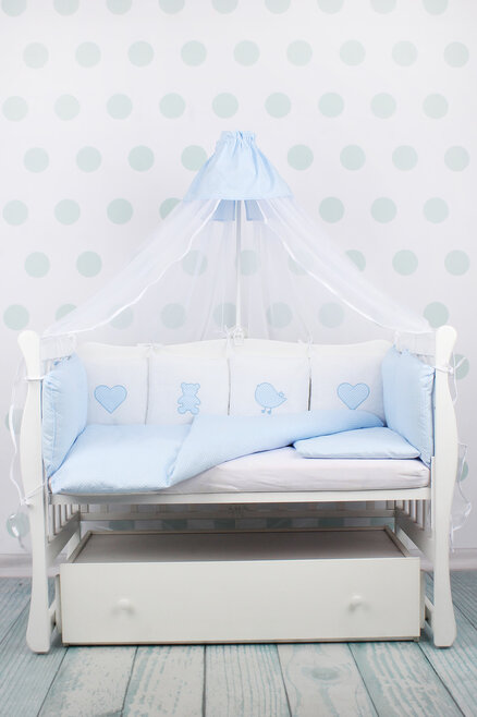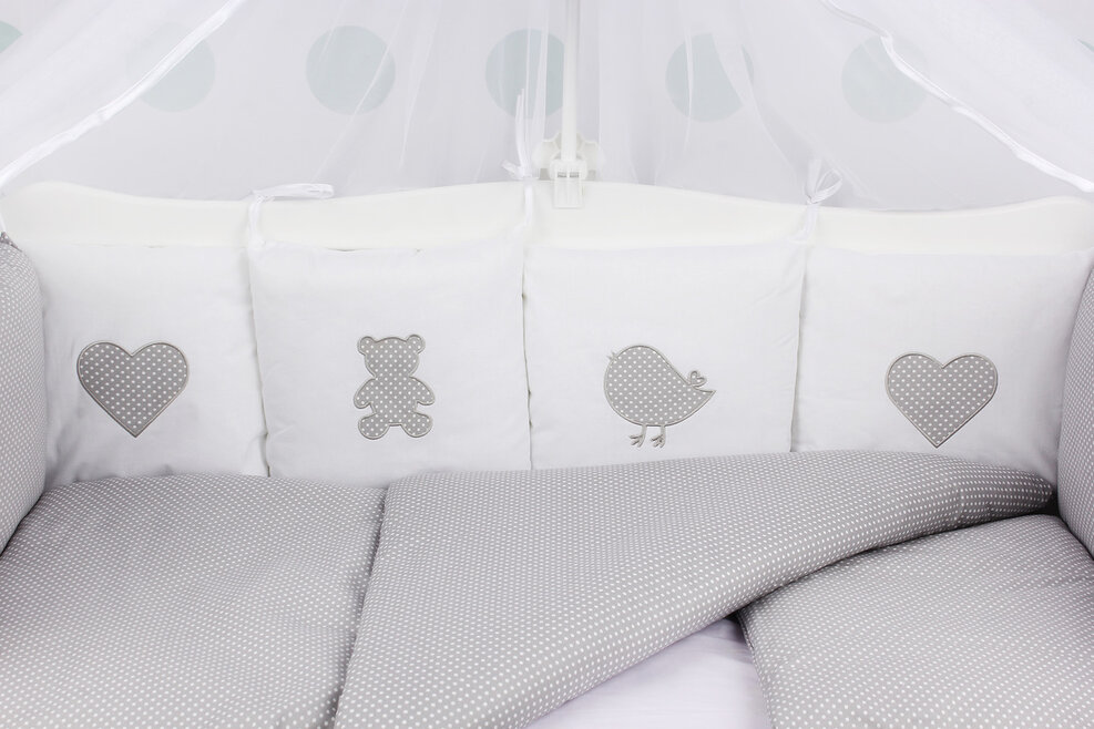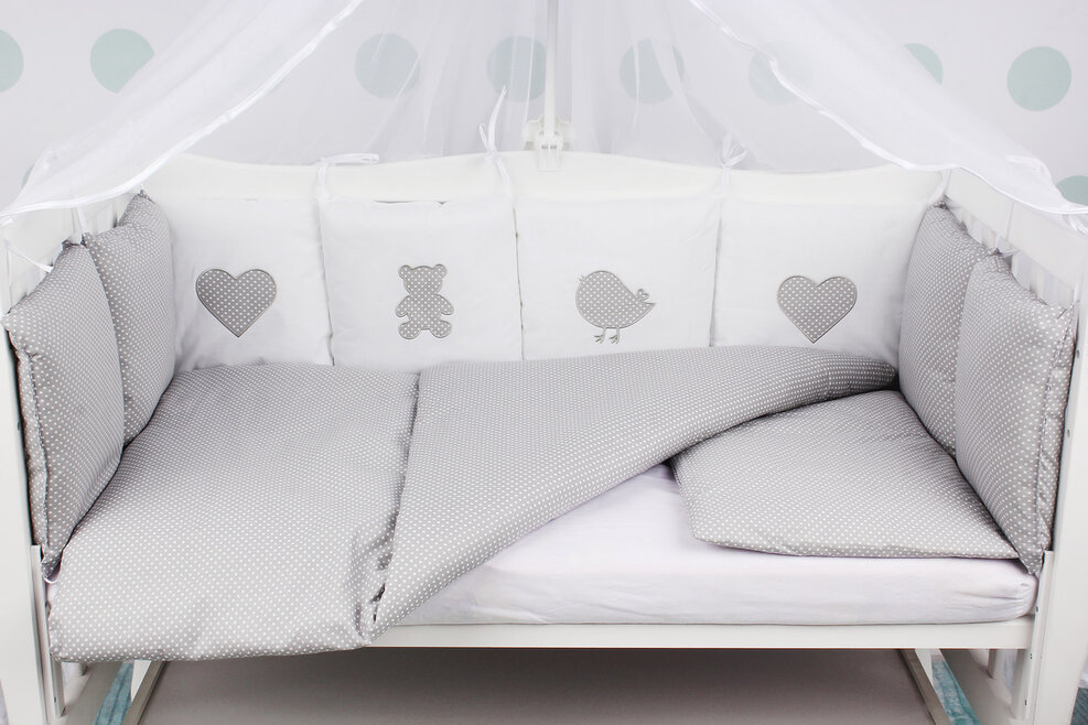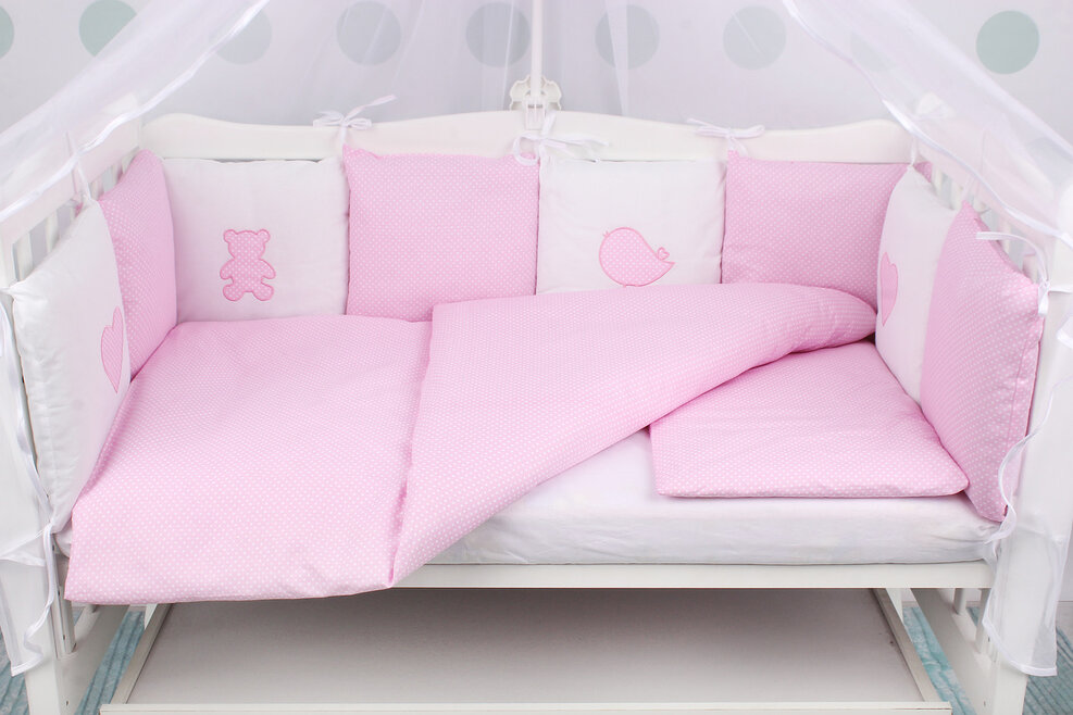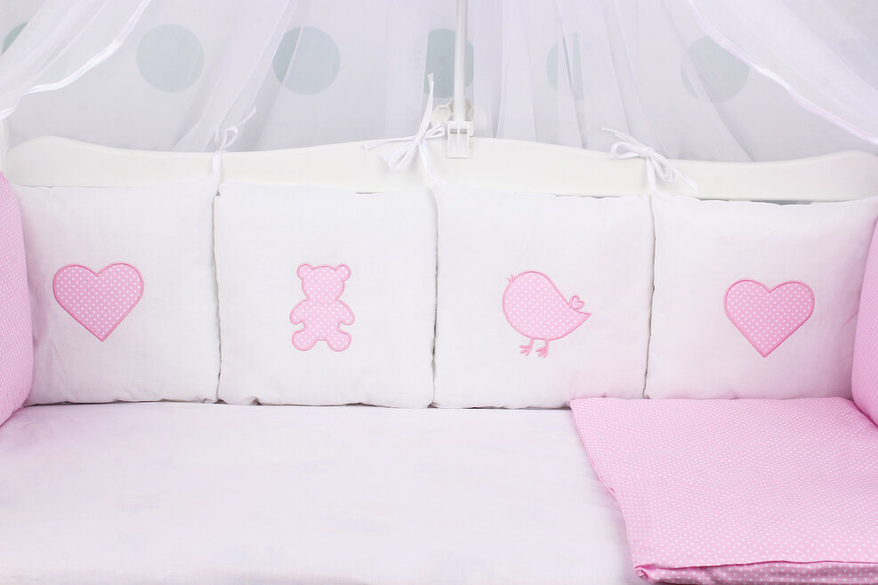 - Бампер: подушки – 12 шт – 30*30 см. Из них 6 подушек с оригинальной вышивкой (3 вида картинок вышивки: медвежонок, птичка, сердечко)