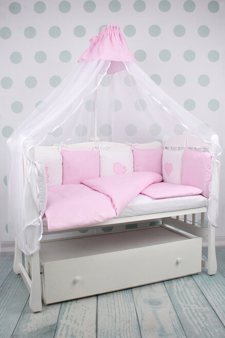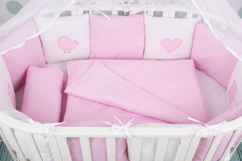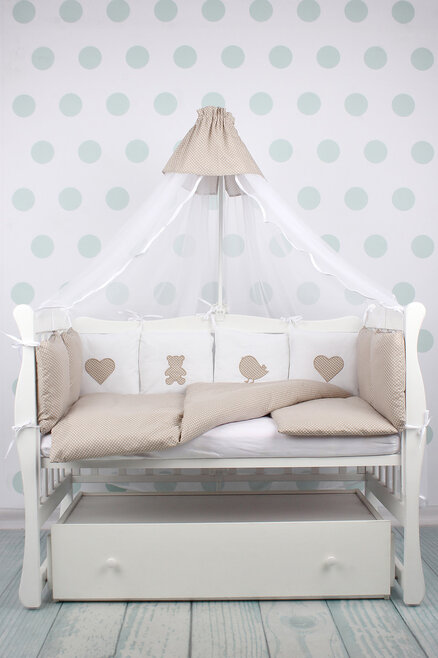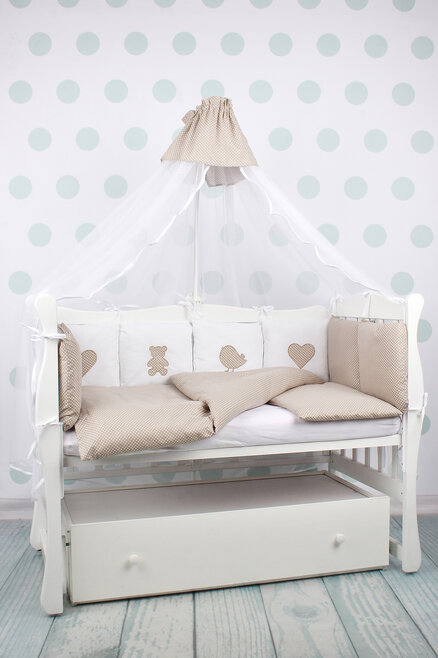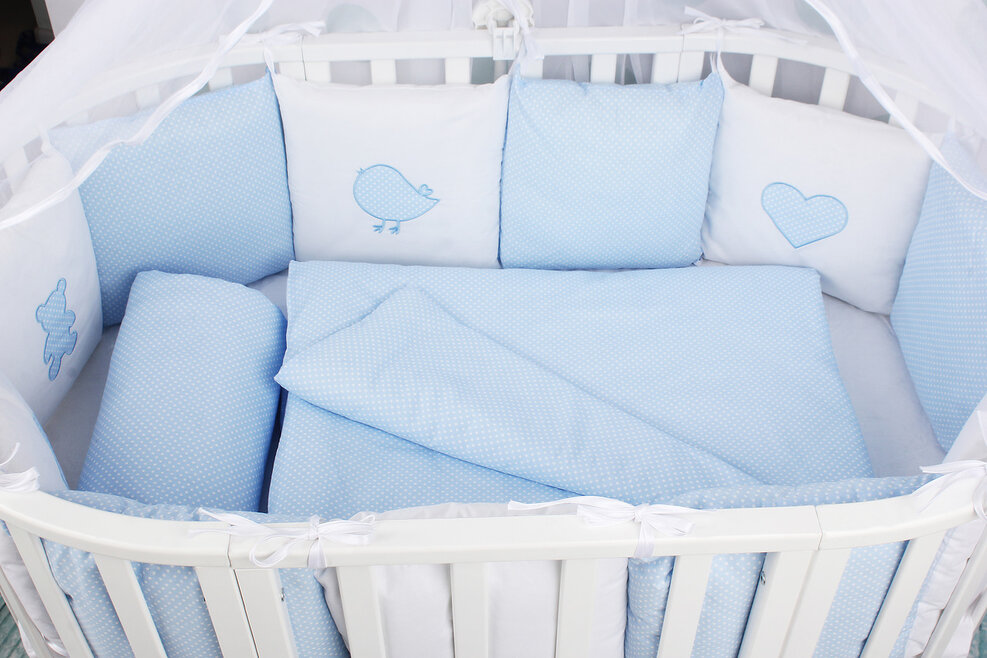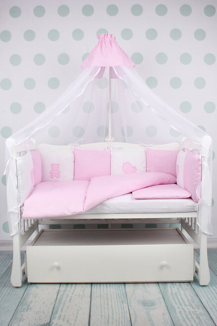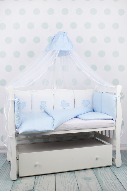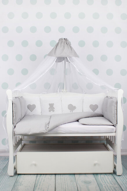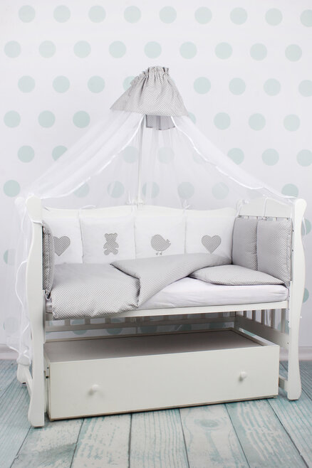 - Бампер: подушки – 12 шт – 30*30 см. Из них 6 подушек с оригинальной вышивкой (3 вида картинок вышивки: медвежонок, птичка, сердечко)
