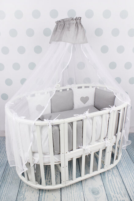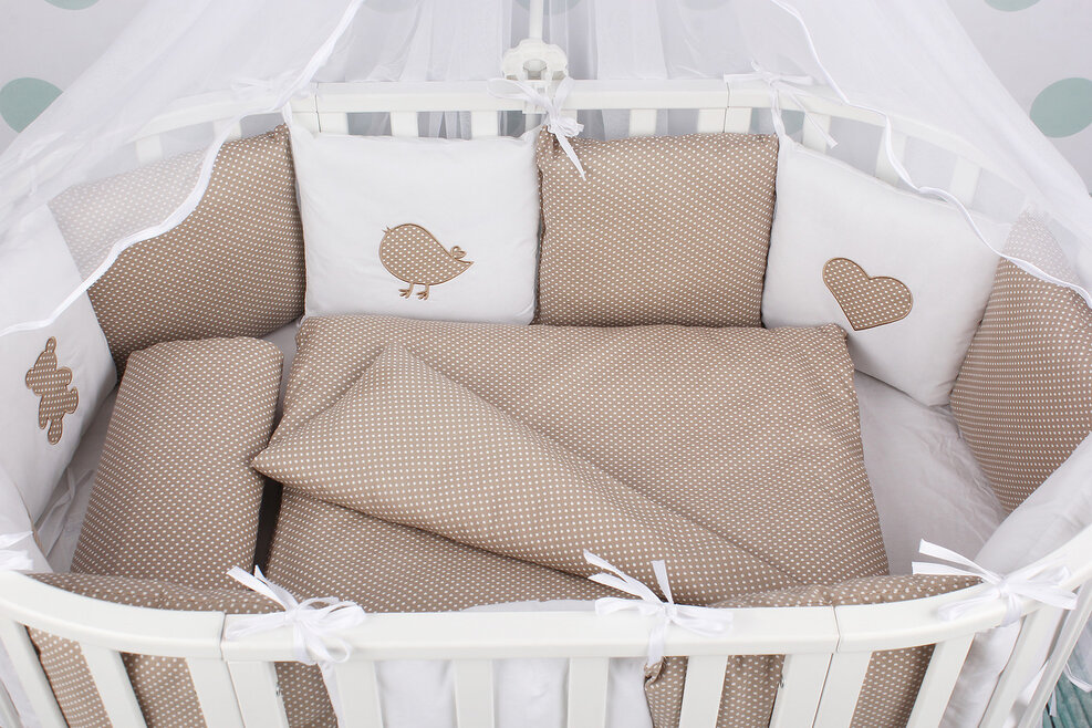 Комплект имеет универсальную простынь на резинке, подходящую как на овальный, так и на прямоугольный матрас, а также простынь можно использовать и для круглого матраса. Бортики представлены в виде 12 подушек на завязках, из них 6 подушек с оригинальной вышивкой (3 вида картинок вышивки: медвежонок, птичка, сердечко). Постельное белье не требует особого ухода и долго сохраняет первоначальный внешний вид.