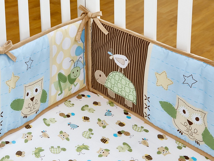 4 бортика, простынь на резинке, юбка на низ кроватки, одеялко-плед.