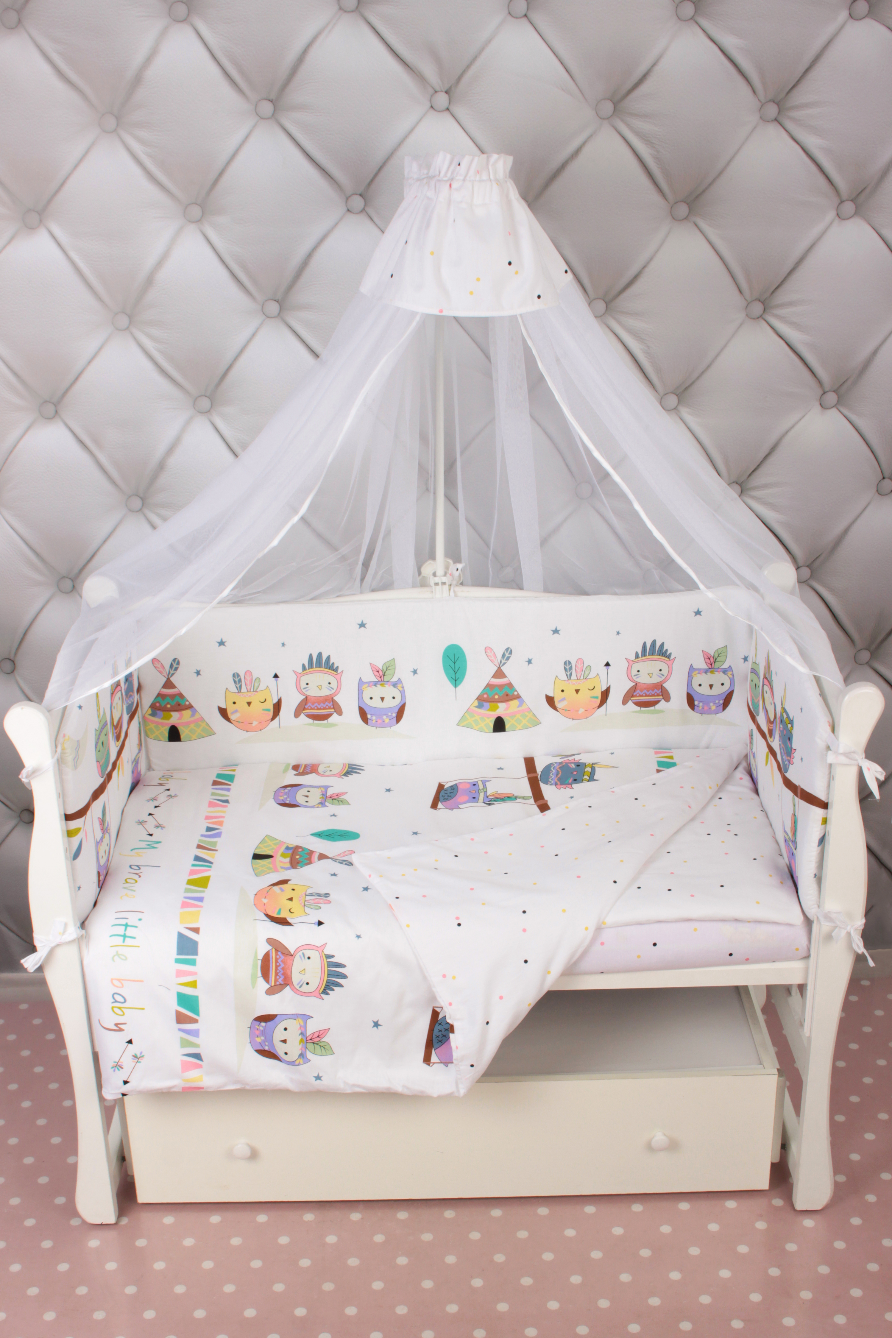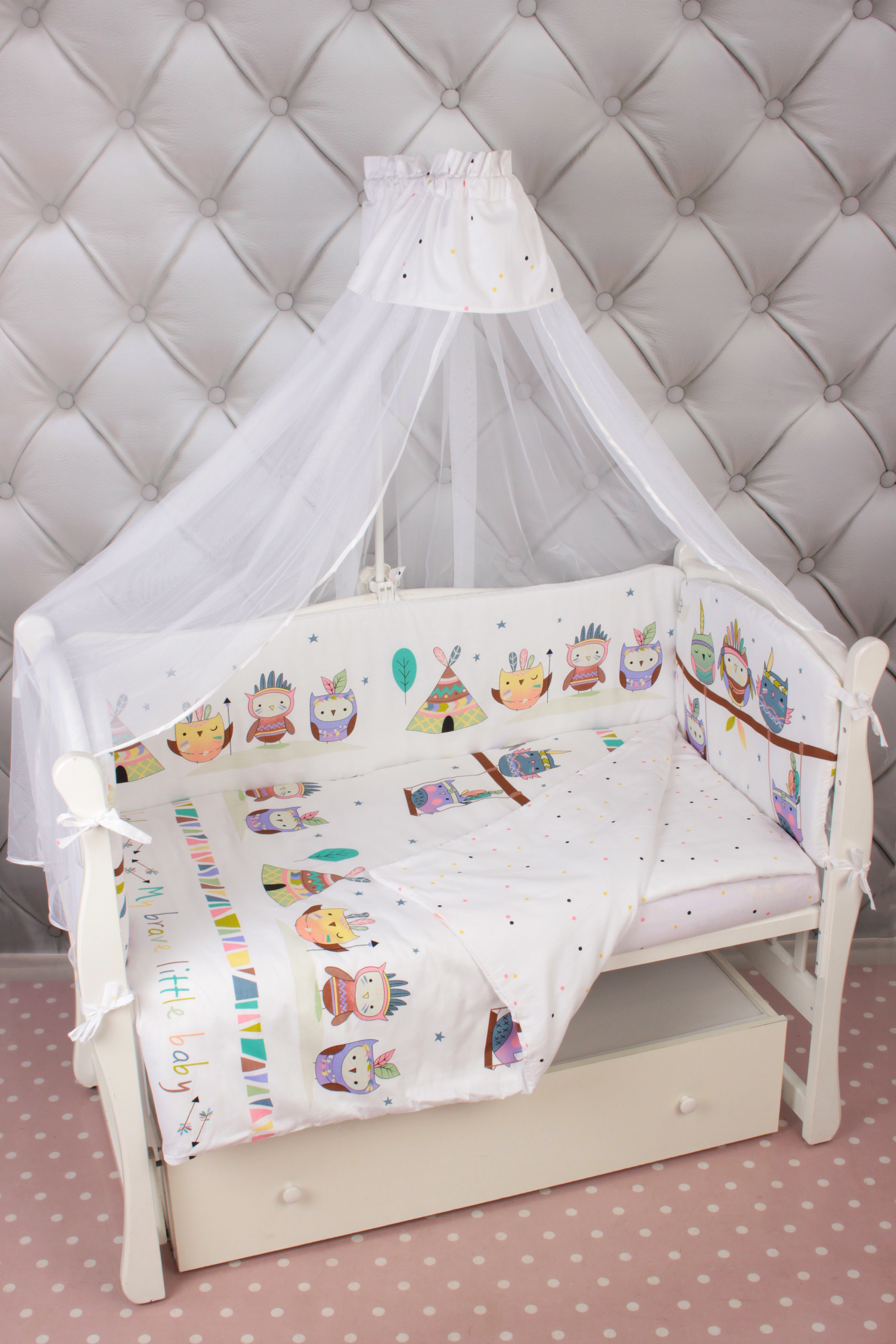 Бортик представлен в виде 4 подушек на завязках, верхние края которого имеют полукруглую форму у изголовья и у ножек ребенка. Мягкий наполнитель бортика обезопасит сон вашего малыша.
