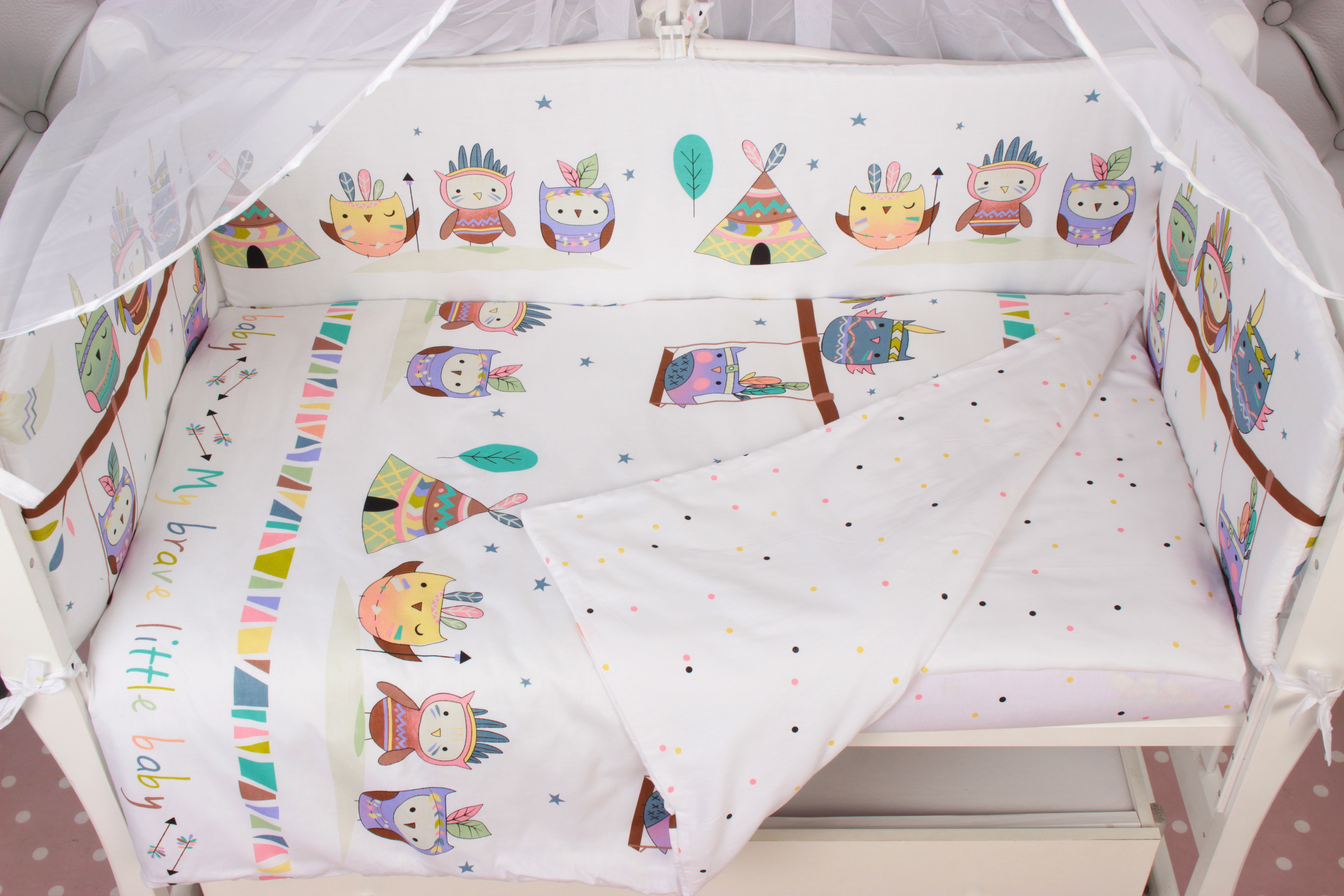 Комплект ПТЕНЧИК представлен в стильном и веселом дизайне: оригинальные принты с птенцами-индейцами и разнообразные цветовые решения! Комплект детского постельного белья ПТЕНЧИК от AmaroBaby придется по душе каждой маме!