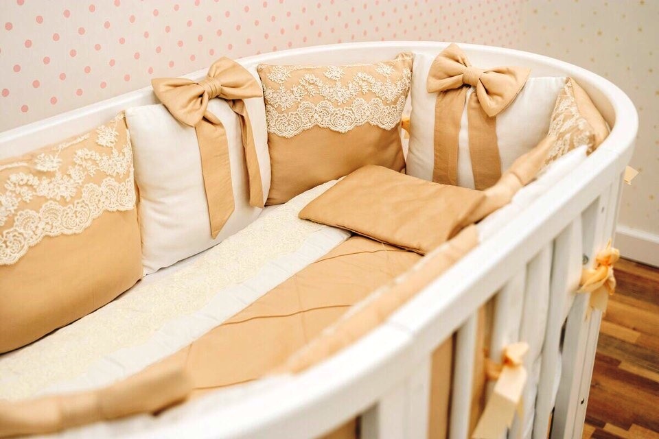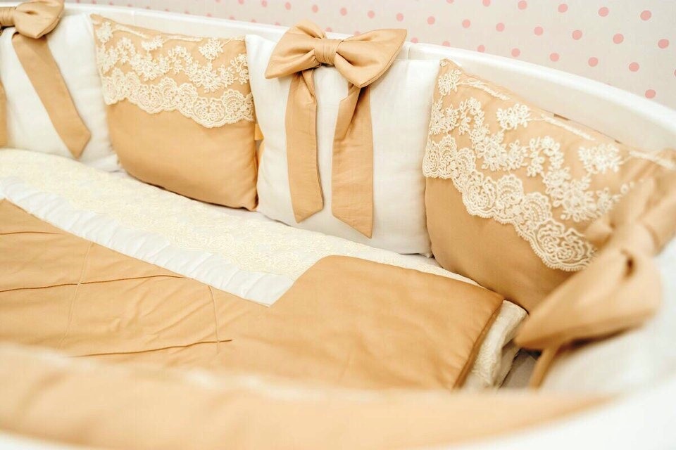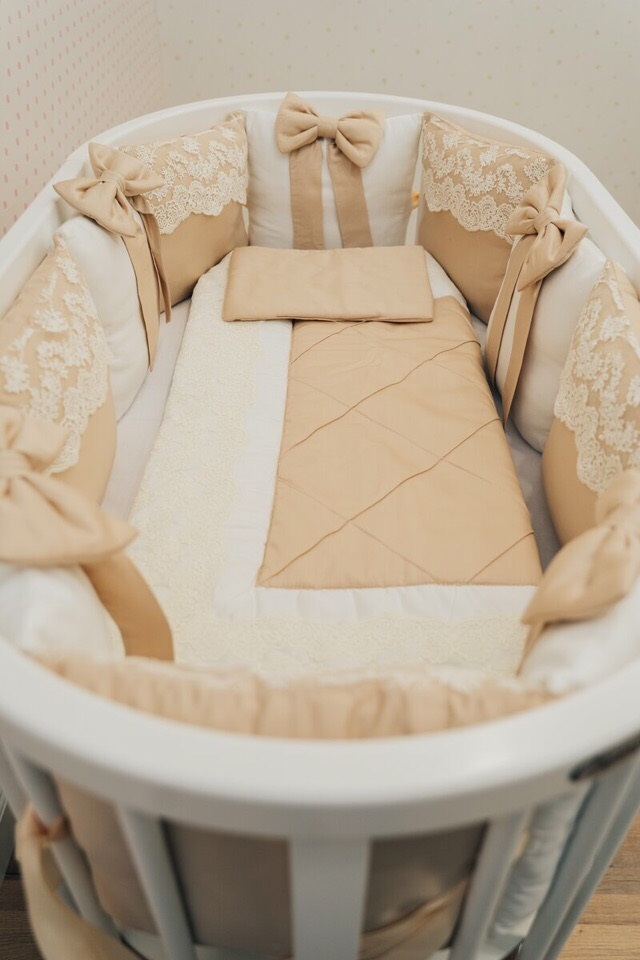 Настоящая роскошь с рождения – комплект «Крем-брюле» - шикарное кружево, качественная ткань класса люкс, нежные банты. Данный комплект бортов имеет съёмные чехлы на молнии, что очень практично в эксплуатации.
