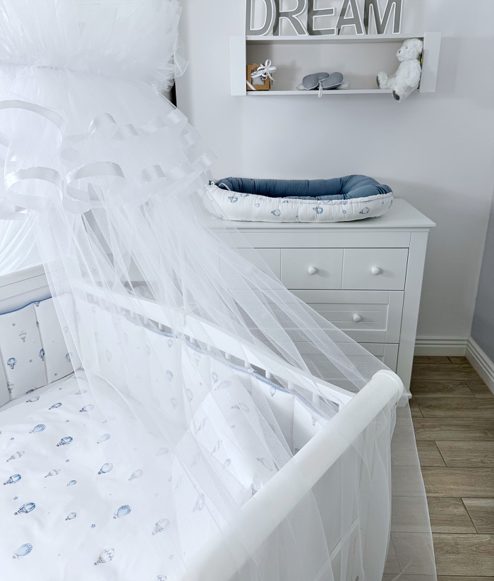 - Пододеяльник с молнией — 135×100 см. Лицевая сторона — с принтом. Обратная сторона — из голубого муслина. Скрытая молния: не видна снаружи и не мешает ребёнку во время сна.