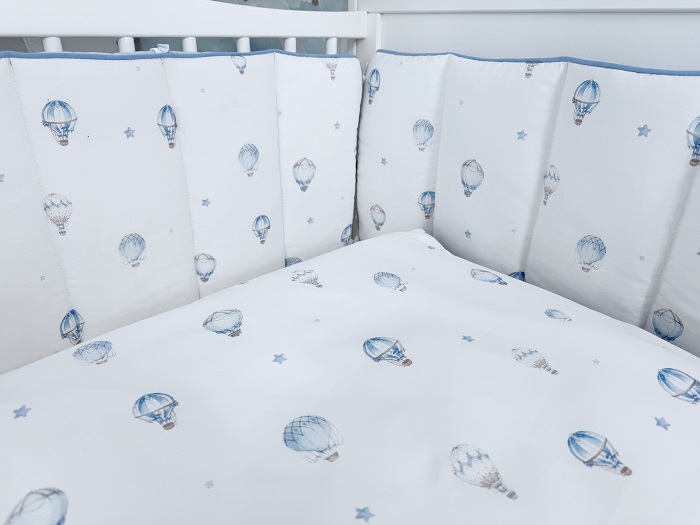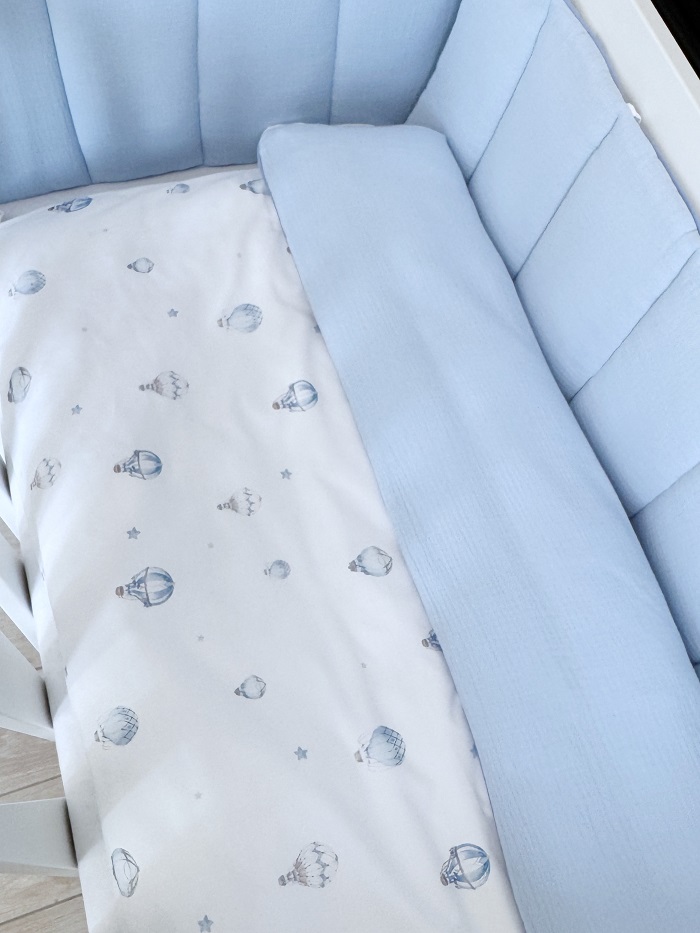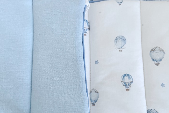 - Стёганый бампер. Дизайн: С одной стороны — принт, с другой — однотонный, из голубого муслина. По краю — голубой кант. Состоит из: 4 частей (изголовье, изножье и 2 боковины по 2 секции каждая). Высота: 30 см. Крепление: мягкие текстильные завязки. Молния: отсутствует