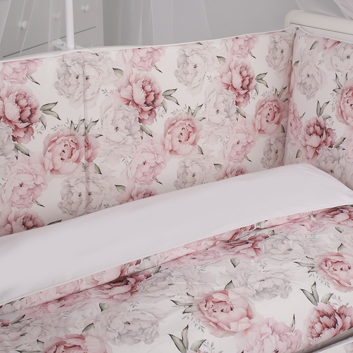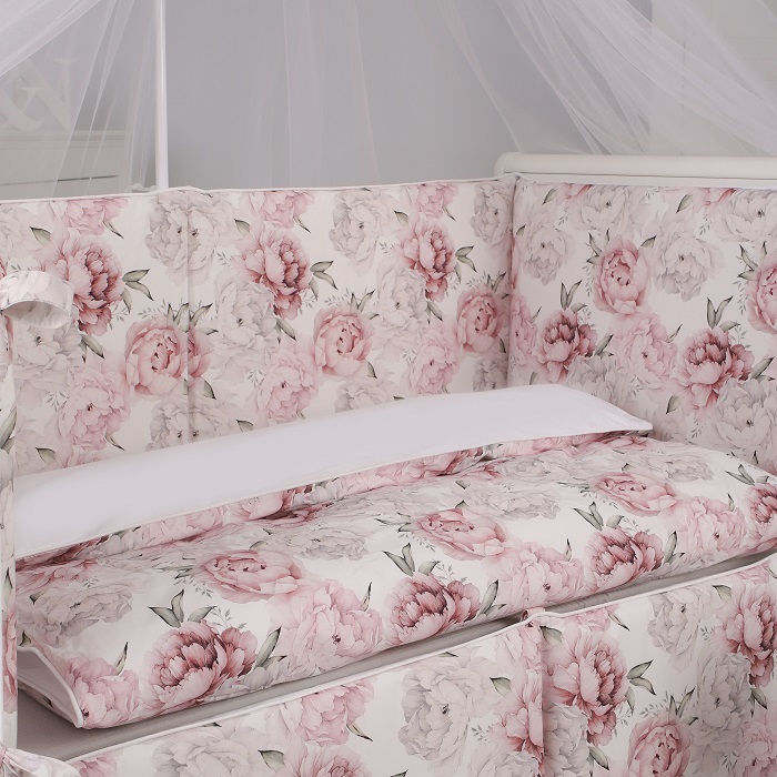 КПБ Lovely Roses совместим со спальными местами и матрасиками размера — 120x60 см и 125x65 см. Чехлы на бортиках снимаются для стирки, застегиваются на молнию. В наборе есть легкое гипоаллергенное одеяло.