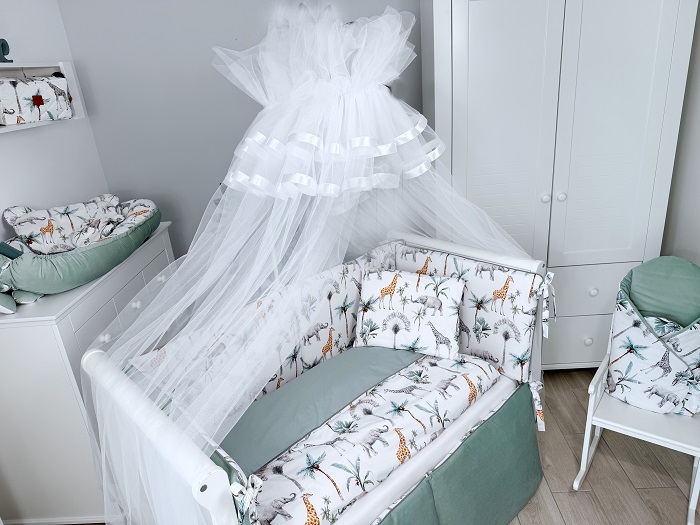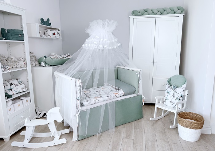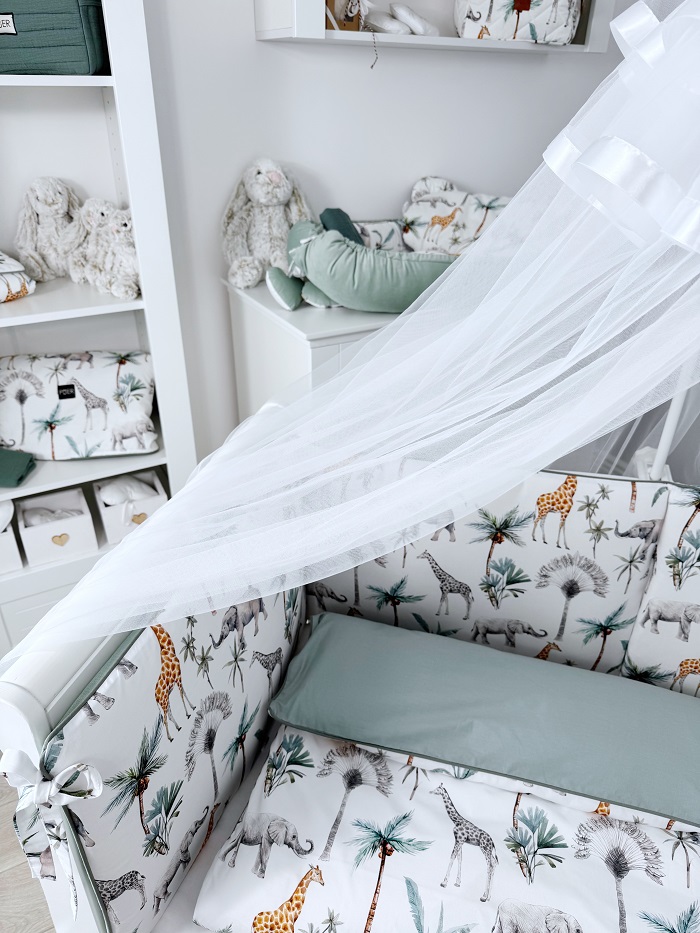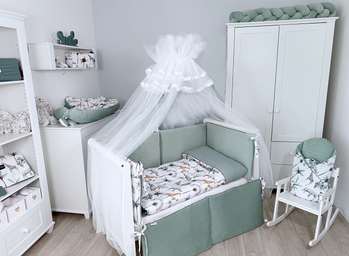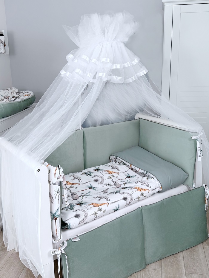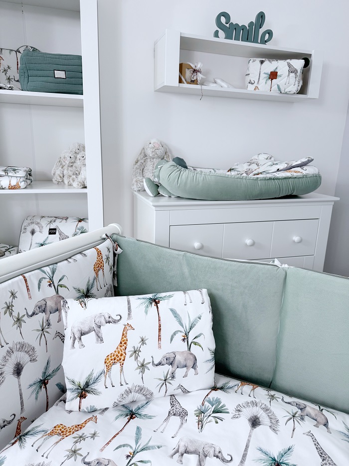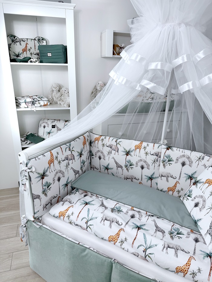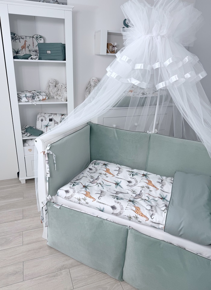 - Бампер. С одной стороны — с принтом по всей поверхности, с другой — вельвет мятного цвета. По краю — серый кант. Состоит из: 4 частей (изголовье, изножье и 2 боковины по 2 секции каждая). Высота: 40 см. Крепление: мягкие текстильные завязки. Молния: предусмотрена для удобства ухода и стирки