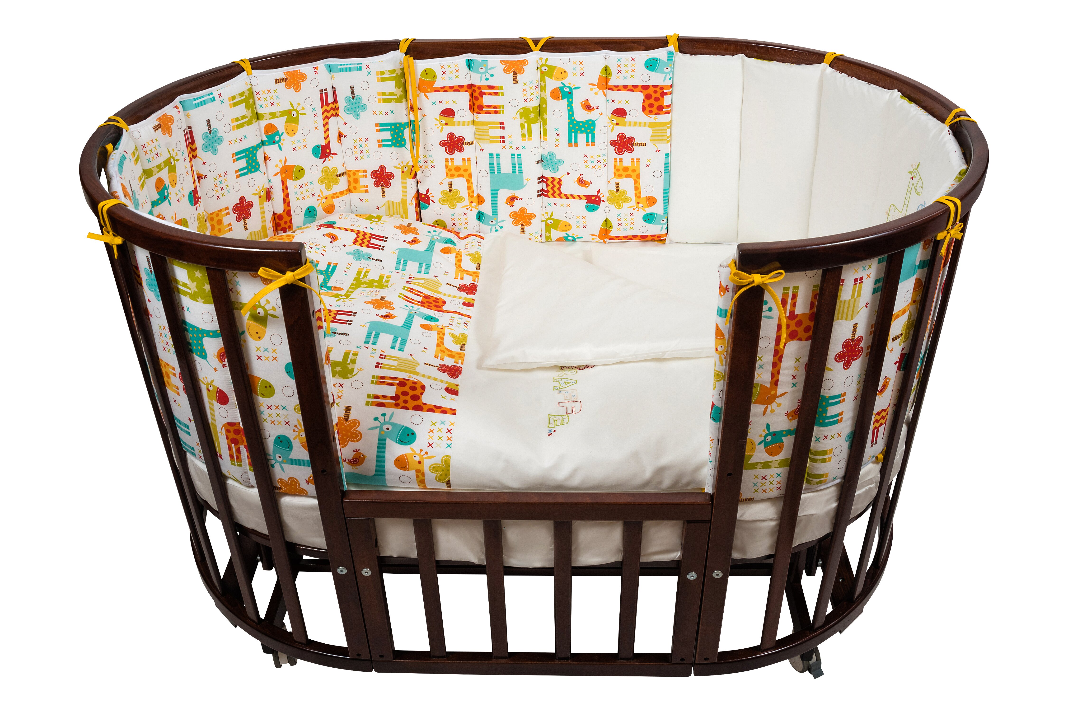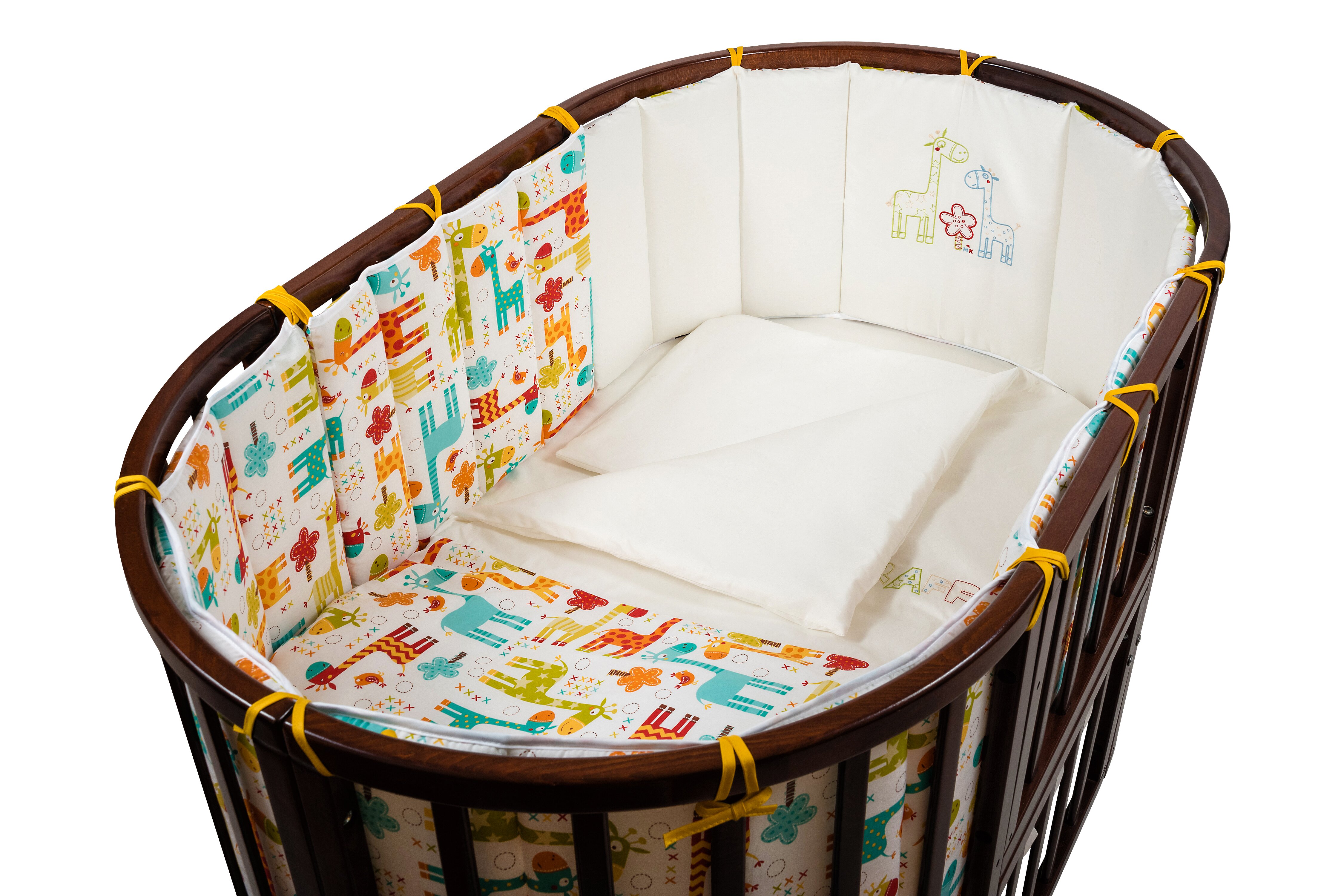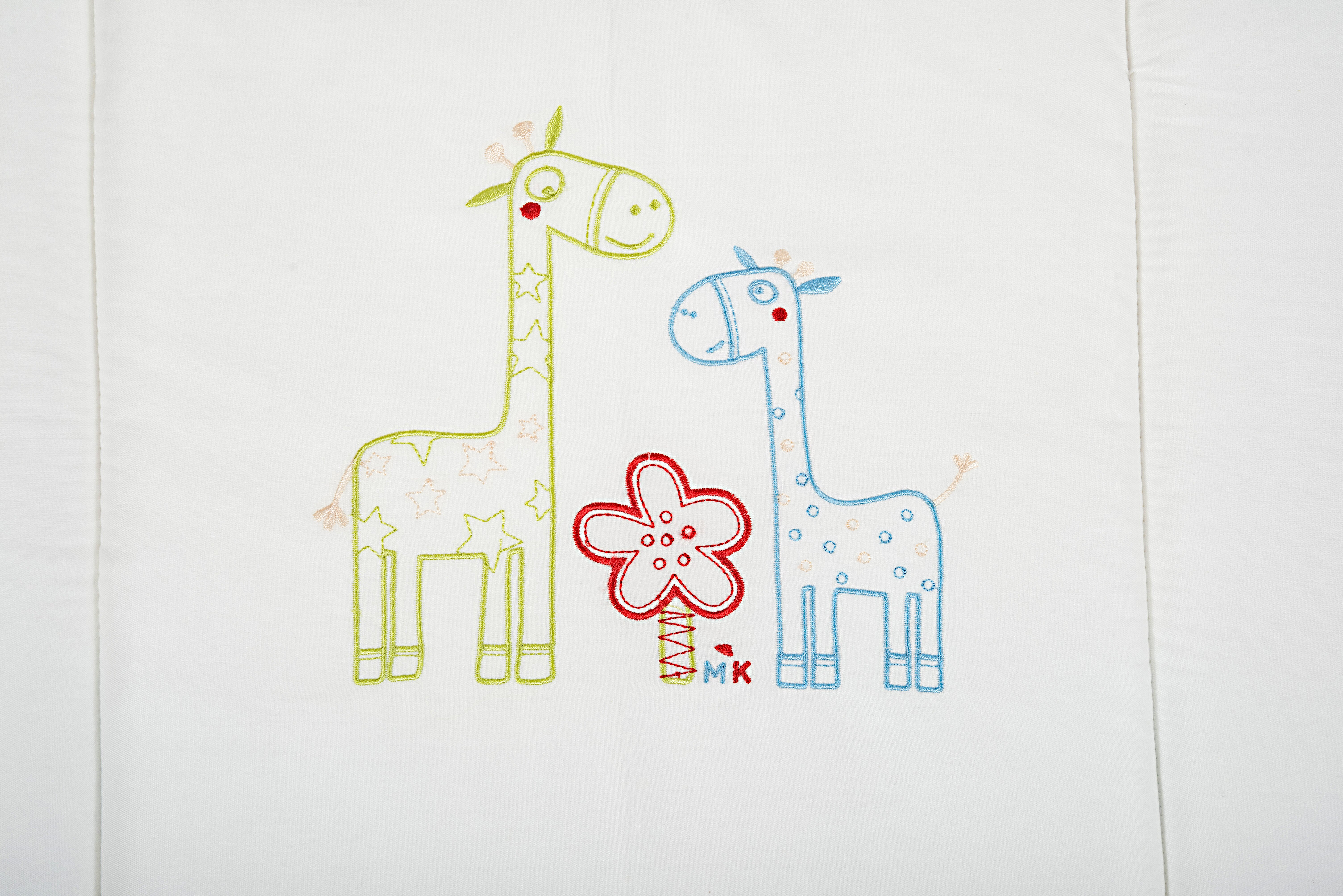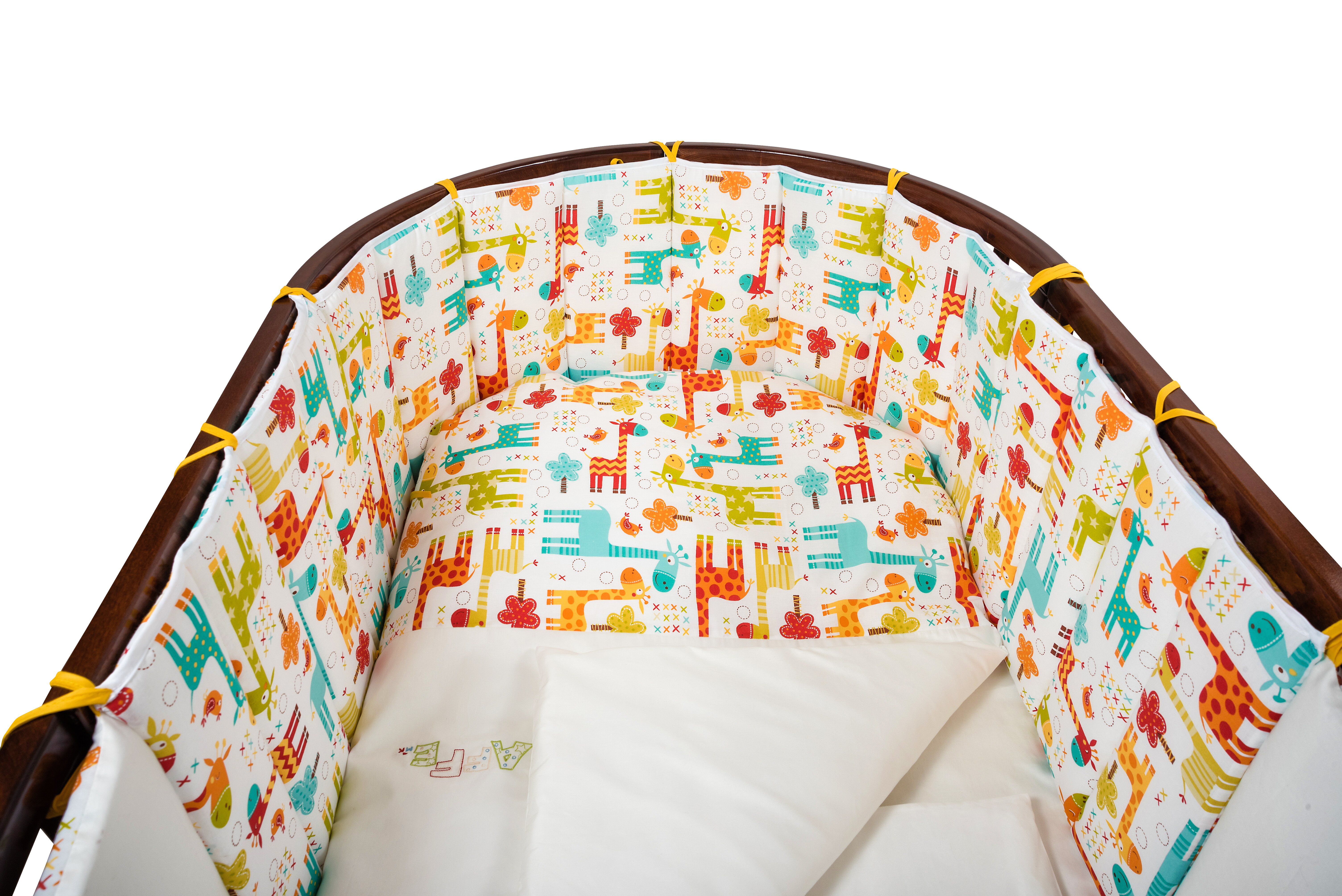 Комплект в кровать Nuovita Giraffe (нуовита жираф) - это яркий и красочный комплект белья в кроватку для новорожденного. Комплект состоит из бортиков и набора постельного белья, отличается высоким качеством и натуральным составом тканей. Бортики состоят из 4 частей, часть из которых выполнена в спокойных светлых тонах, а другая часть в ярких, жизнерадостных расцветках. При этом мотив рисунка повторяется на всех бортиках и одеяле.
