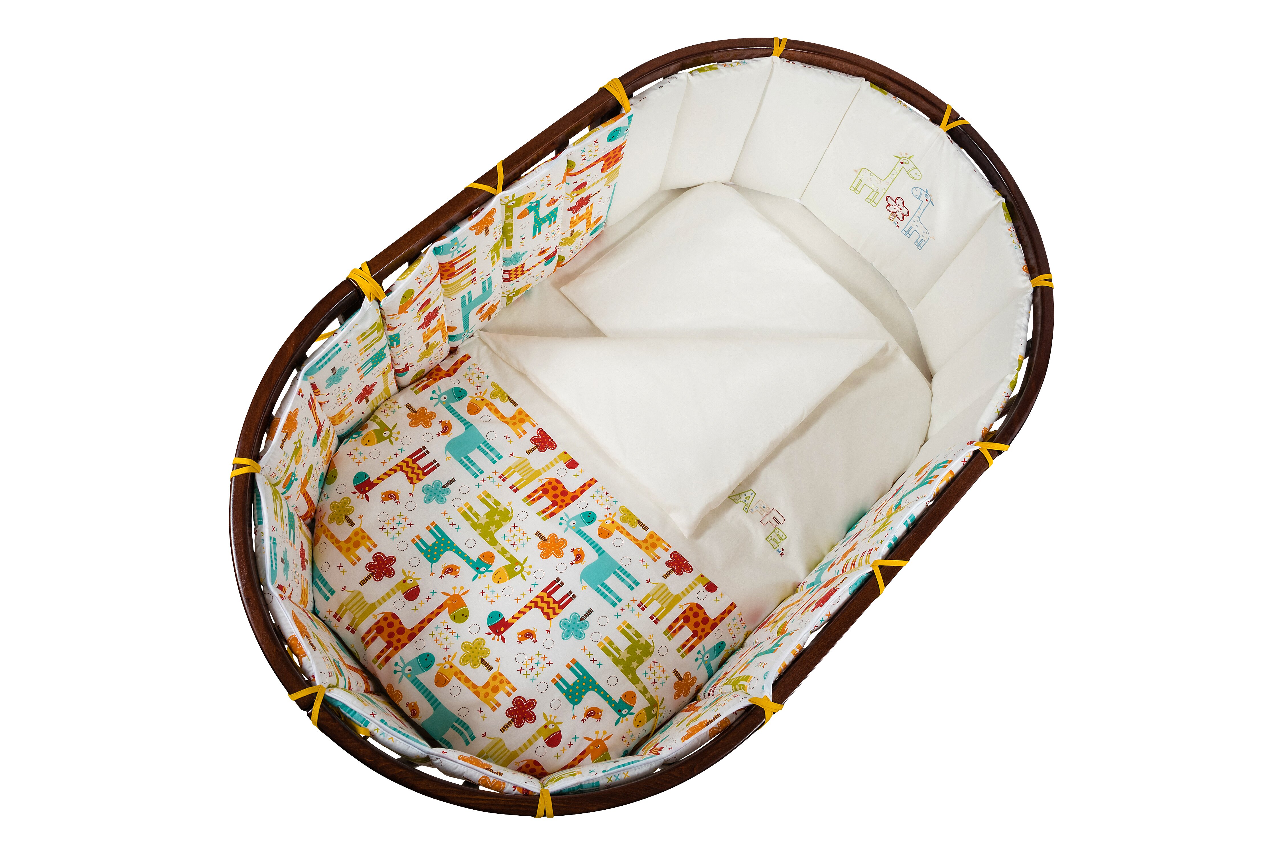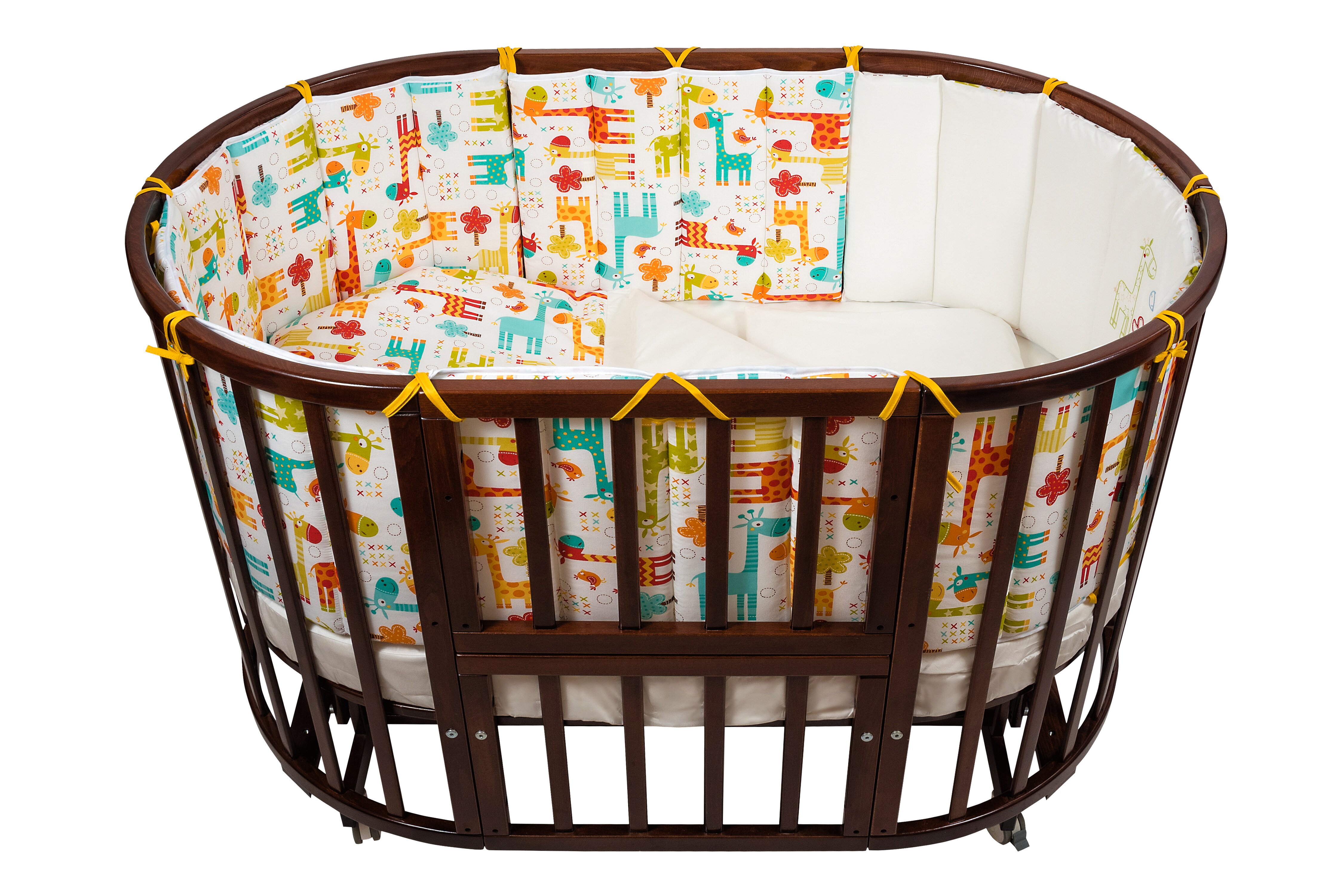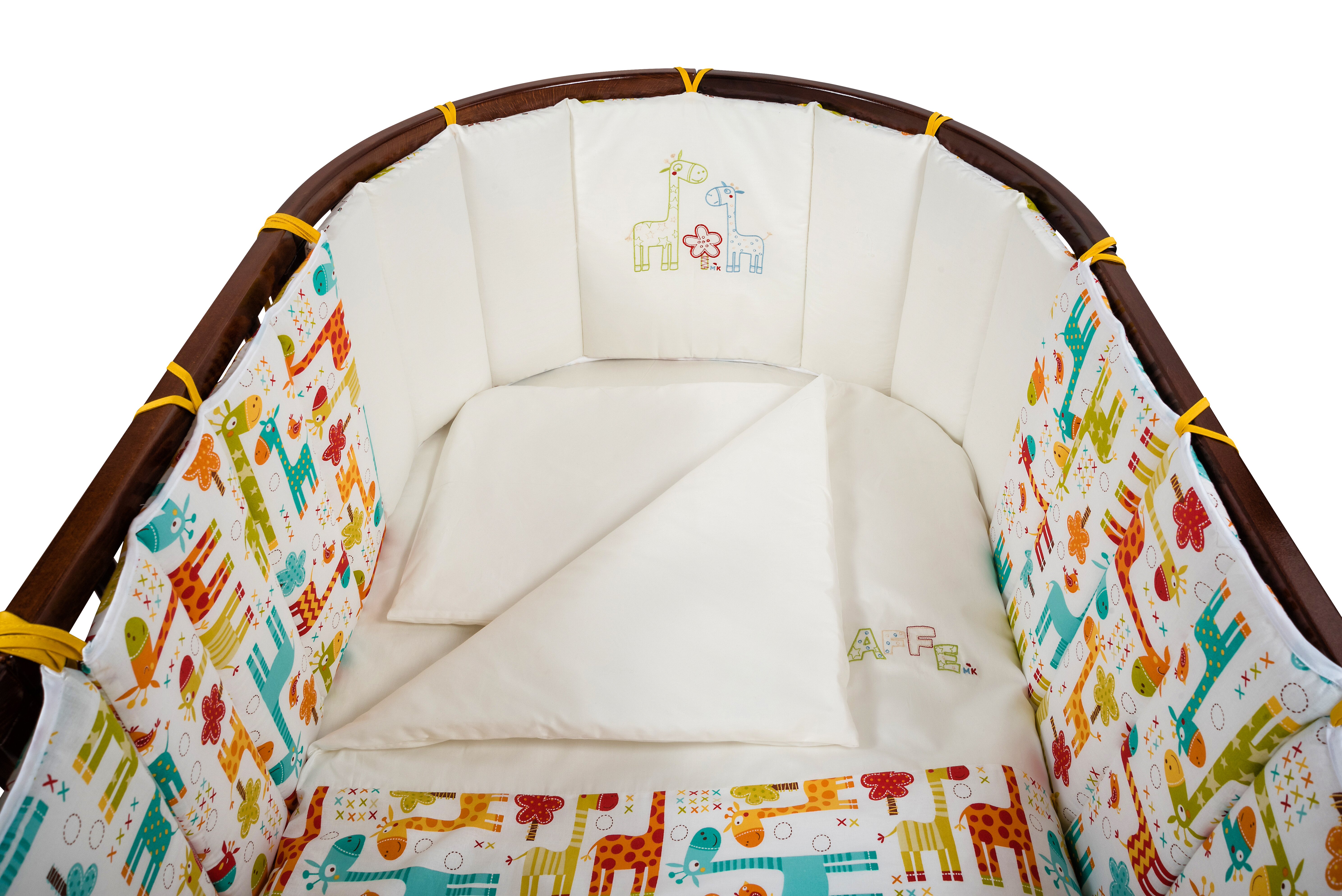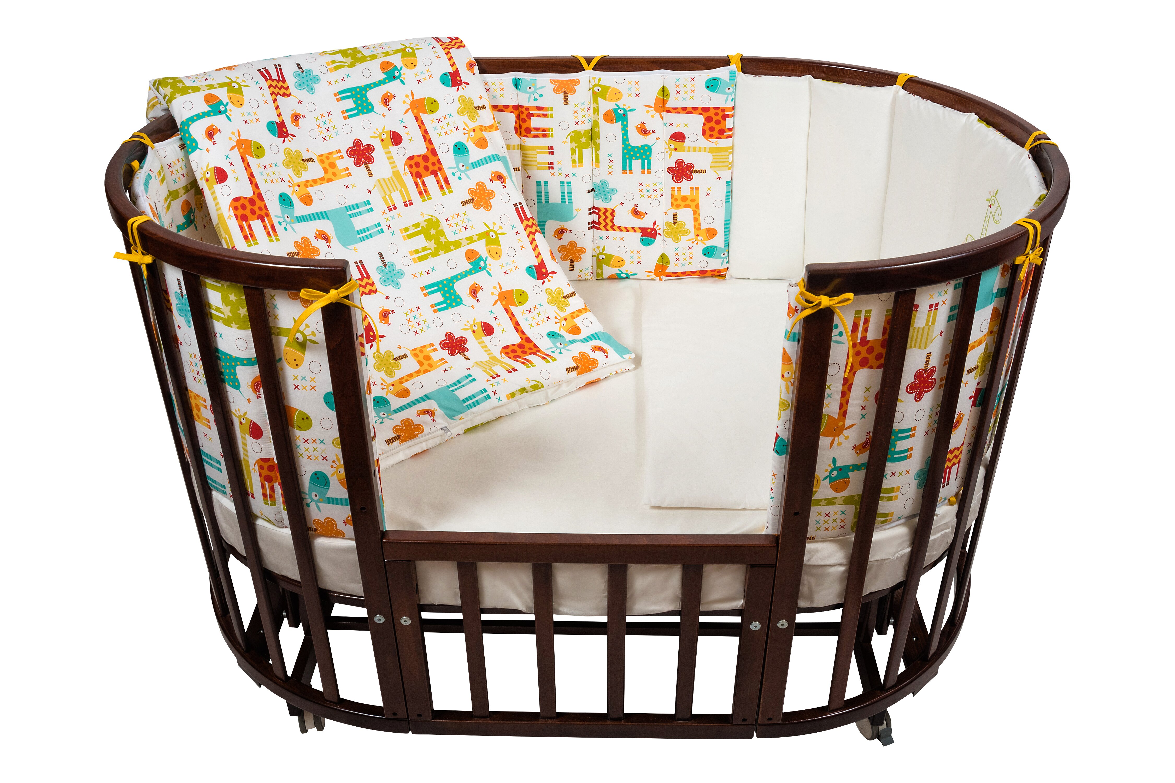Комплект в кровать Nuovita Giraffe (нуовита жираф) - это яркий и красочный комплект белья в кроватку для новорожденного. Комплект состоит из бортиков и набора постельного белья, отличается высоким качеством и натуральным составом тканей. Бортики состоят из 4 частей, часть из которых выполнена в спокойных светлых тонах, а другая часть в ярких, жизнерадостных расцветках. При этом мотив рисунка повторяется на всех бортиках и одеяле.