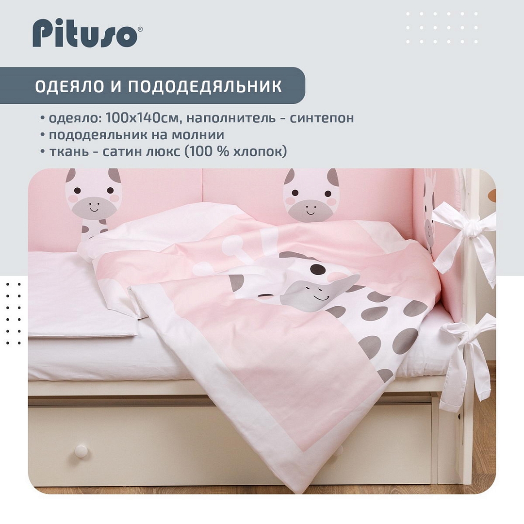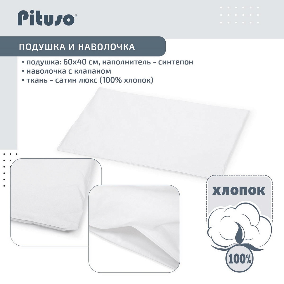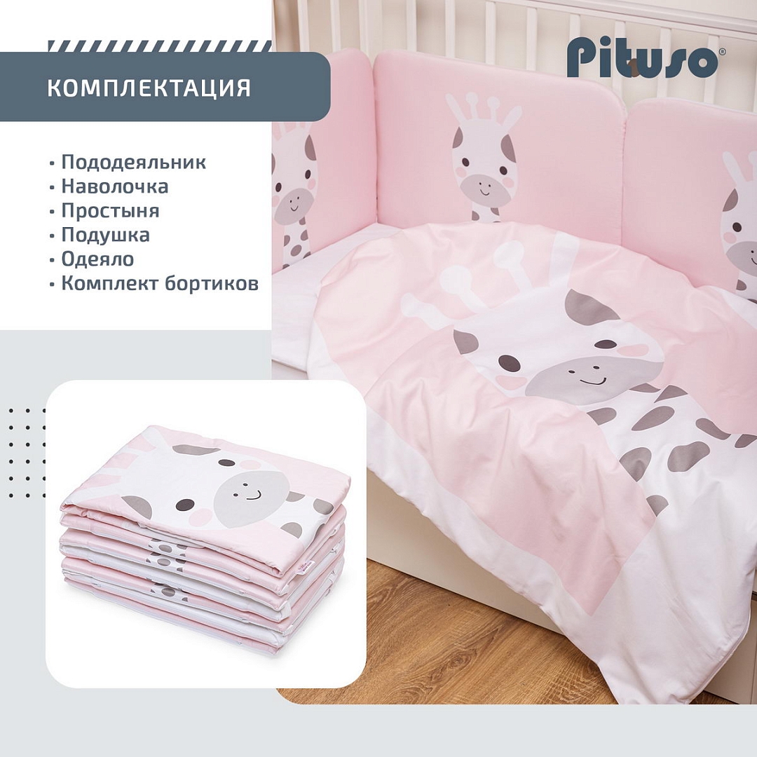 Комплект в кроватку 6 предметов PITUSO PT - качественный комплект в детскую кроватку размерами 120х60 см и 125х65 см. Комплект состоит из 6 предметов и включает в себя самые необходимые предметы для комфортного сна ребенка. Комплект выполнен из высококачественного сатина-люкс, который особенно подходит для деток с чувствительной кожей.