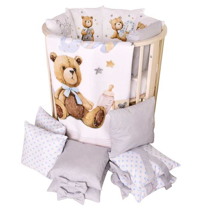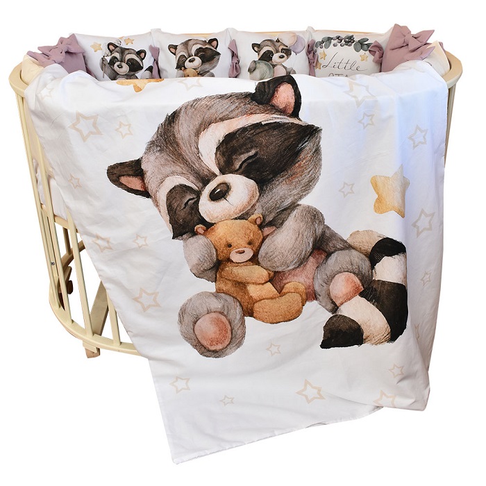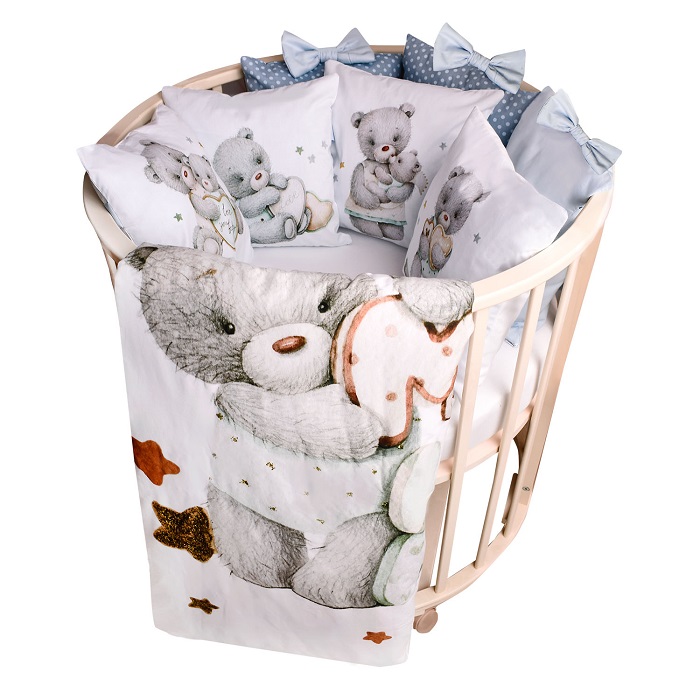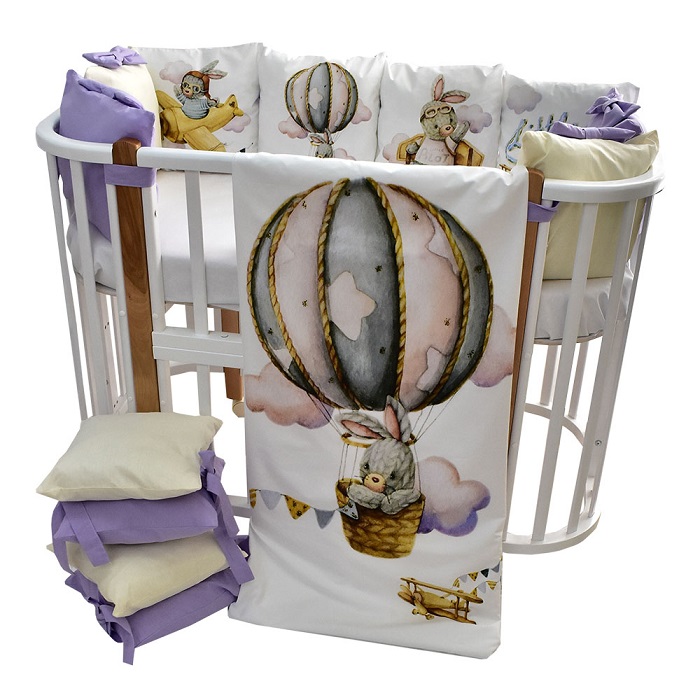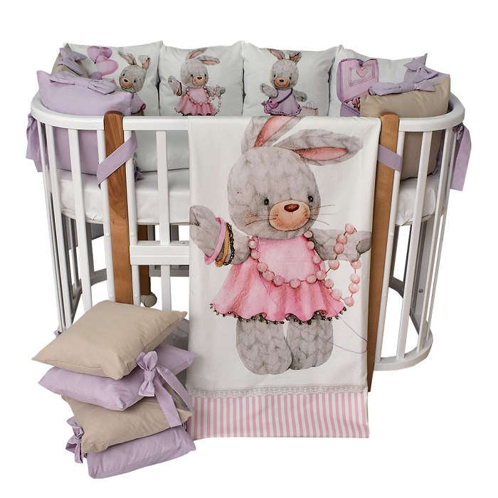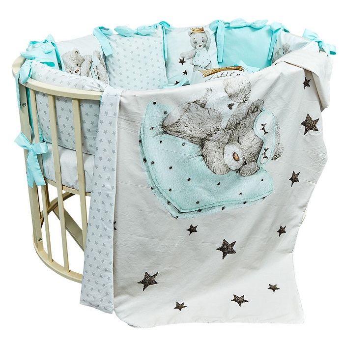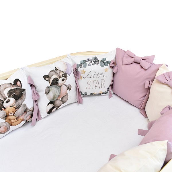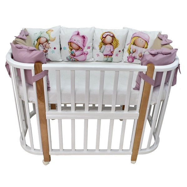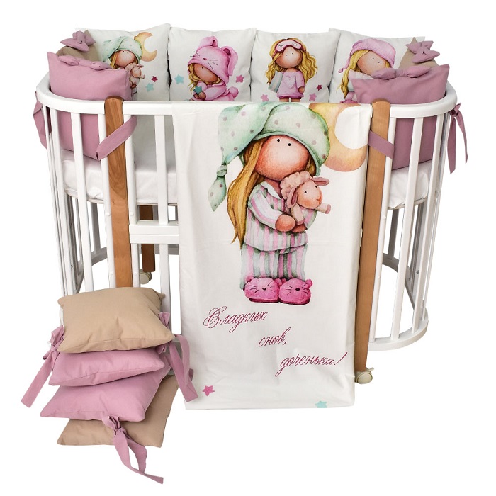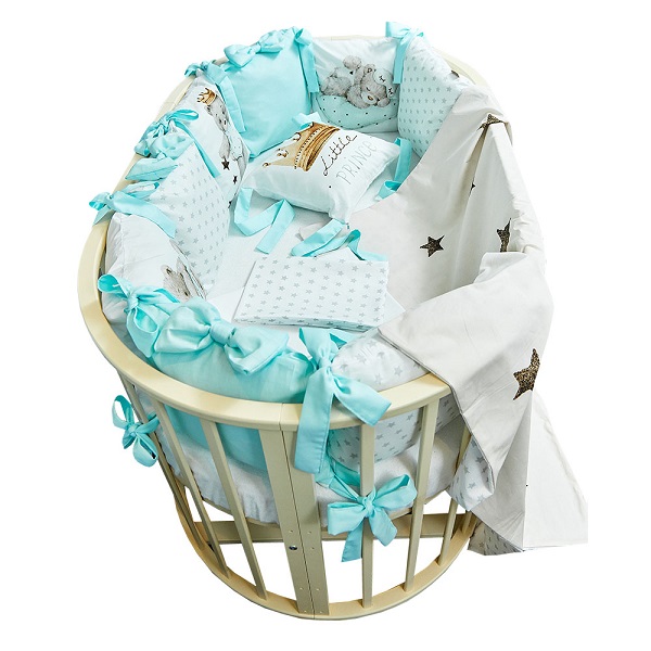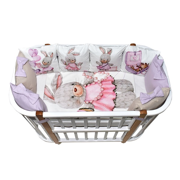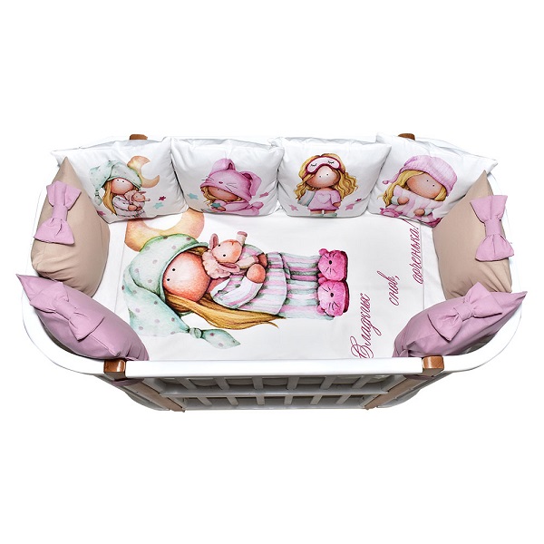 В комплект входит: пододеяльник, простынь, наволочка, бортики и подушка. Комплект выполнен из премиум сатина и отличается невероятной мягкостью и нежностью.