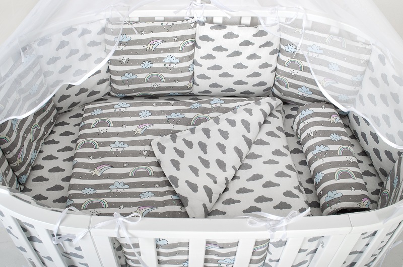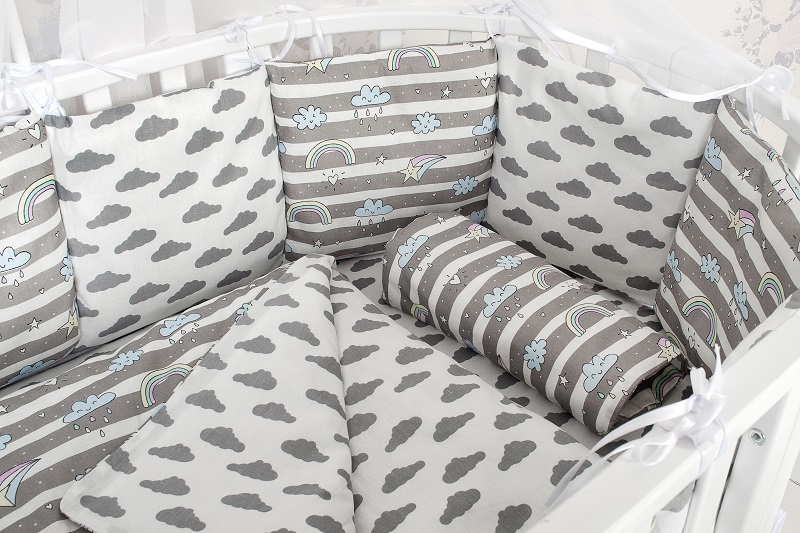 Бортик представлен в виде 12 подушек на завязочках, что позволяет использовать бортик по всему периметру кроватки ( 360 см.)