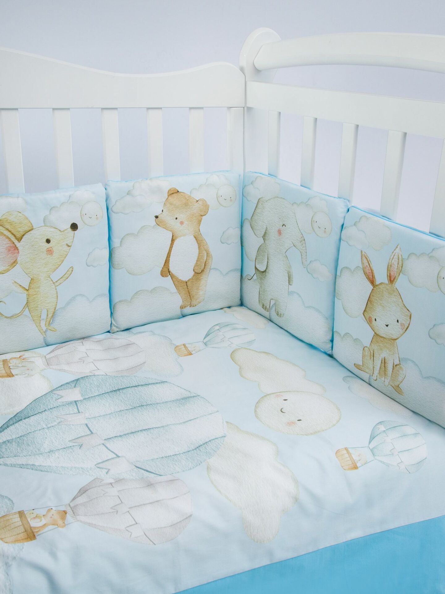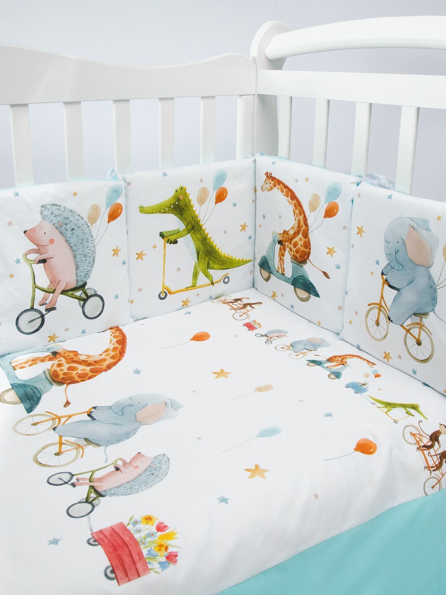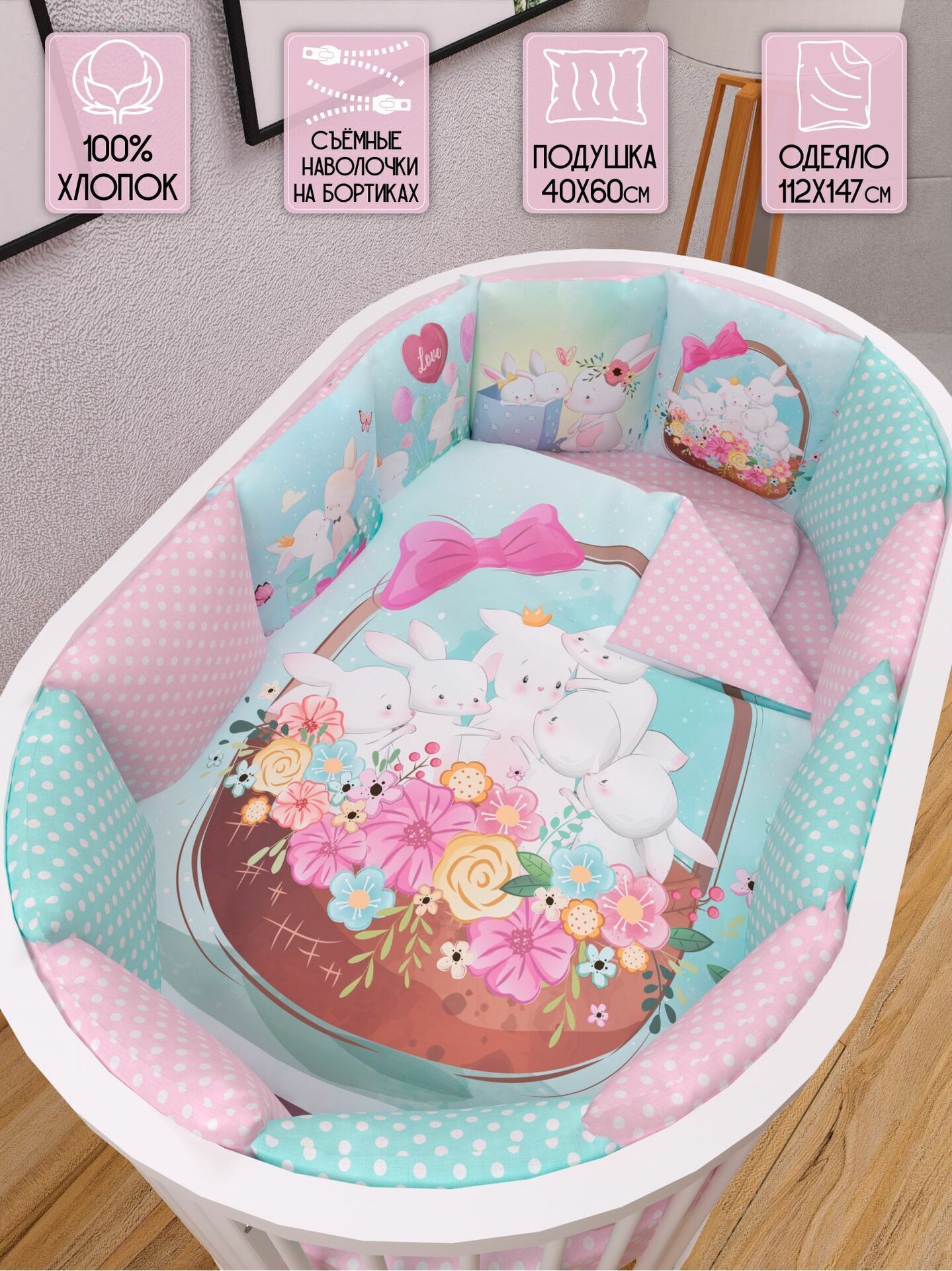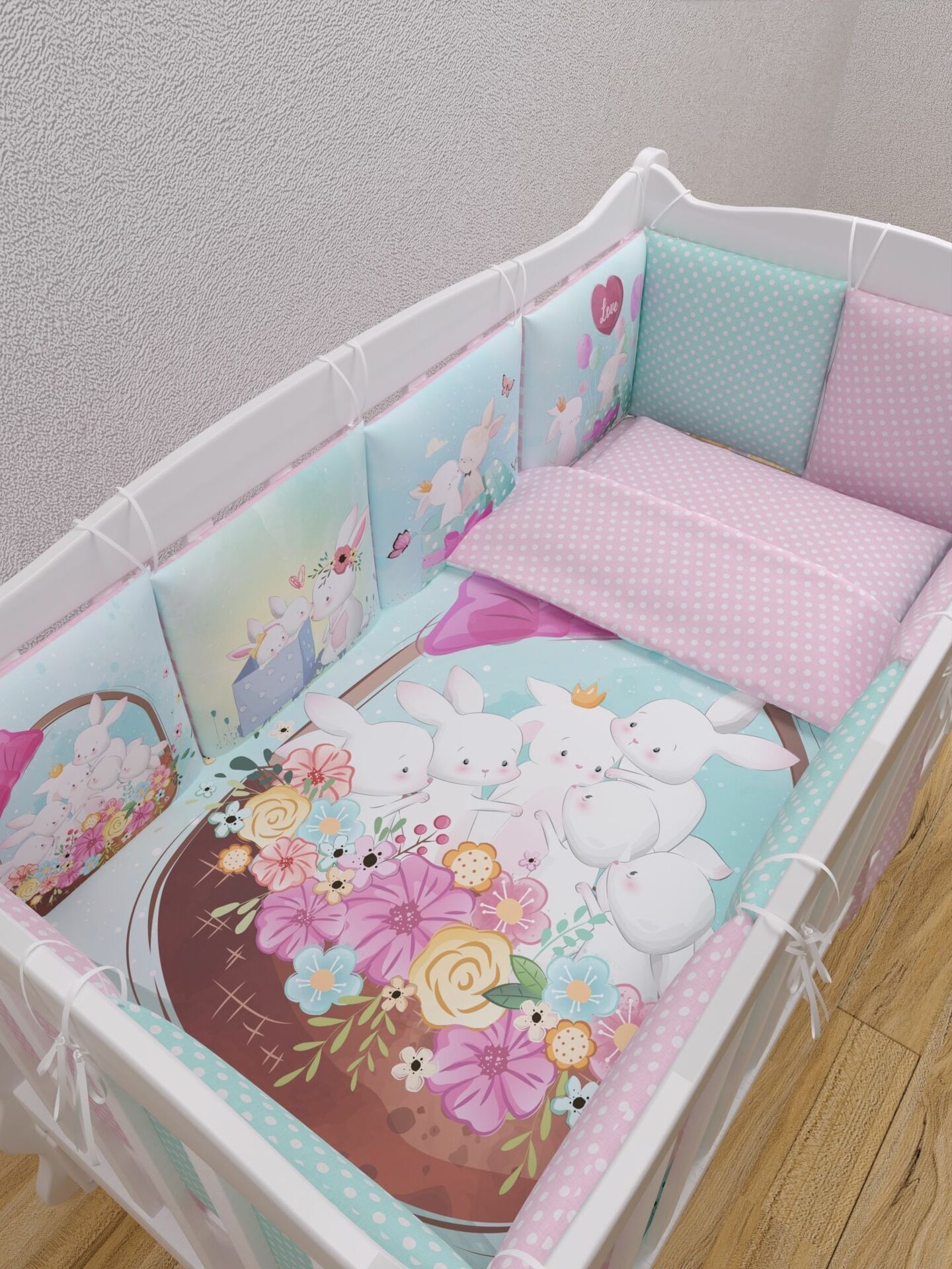 Бортики представлены в виде 12ти подушек на завязках, наволочки на бортиках съёмные. Мягкий наполнитель бортиков обезопасит сон вашего малыша.