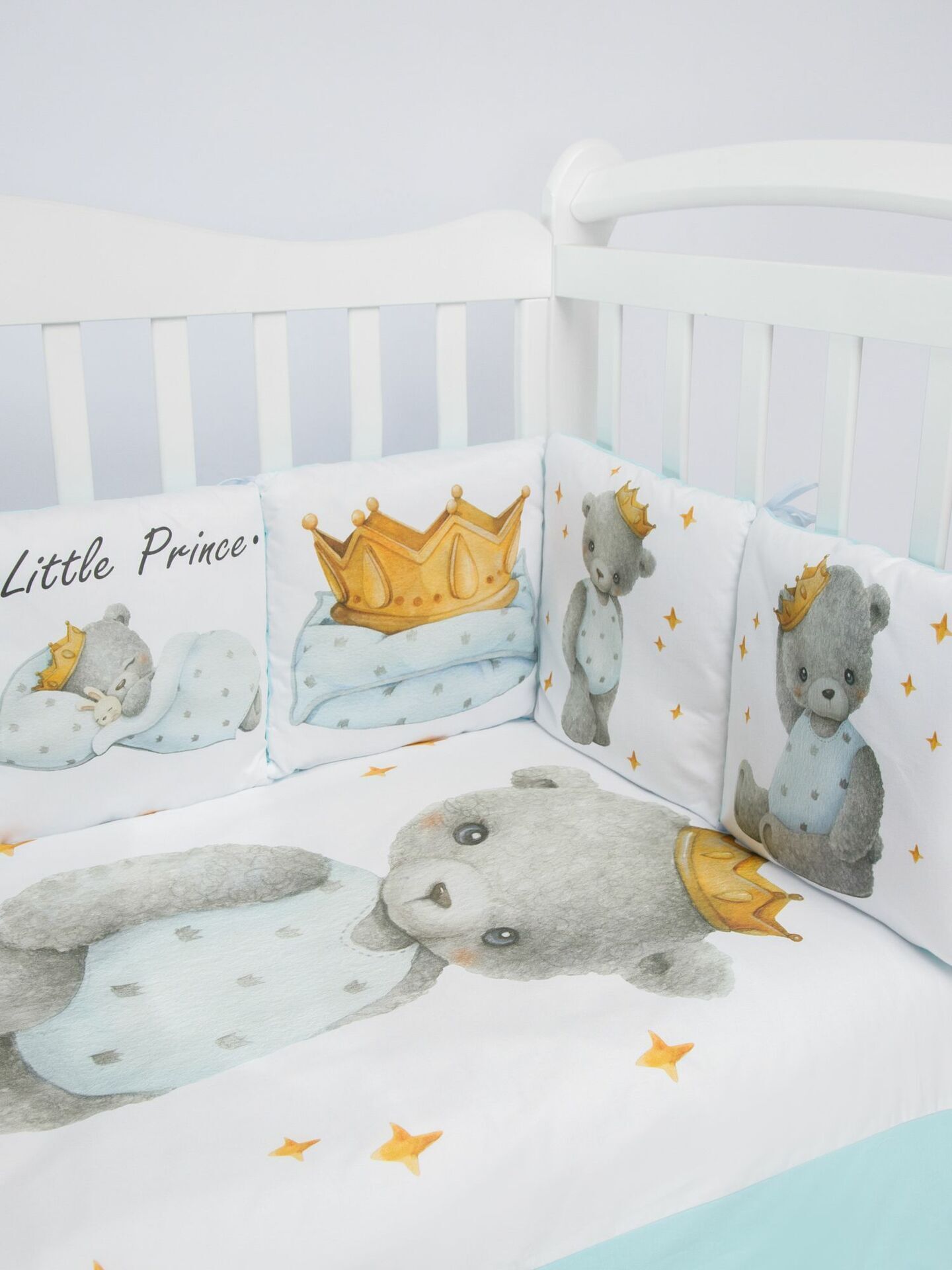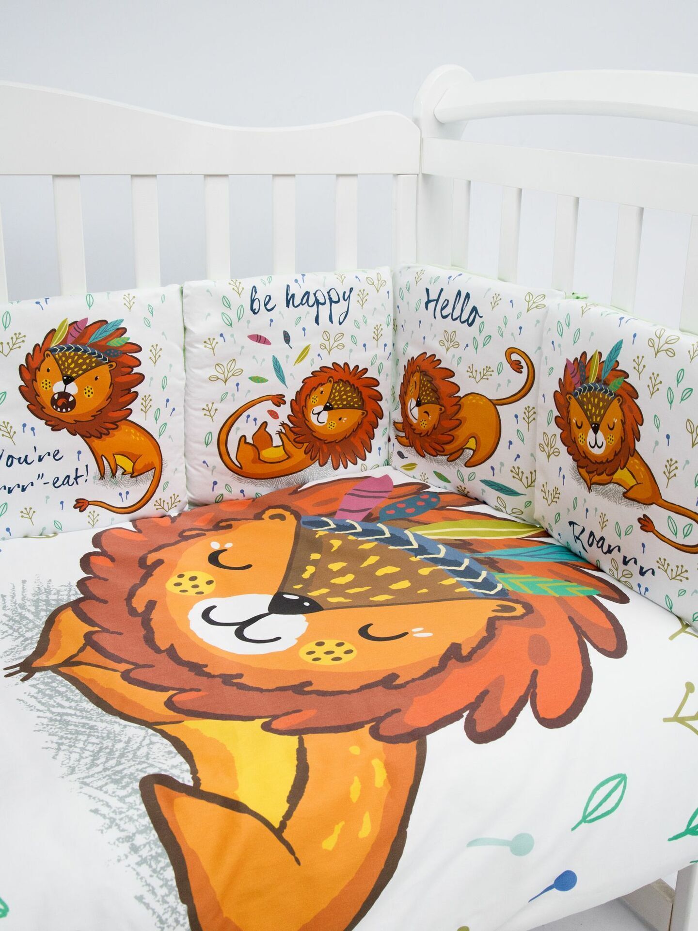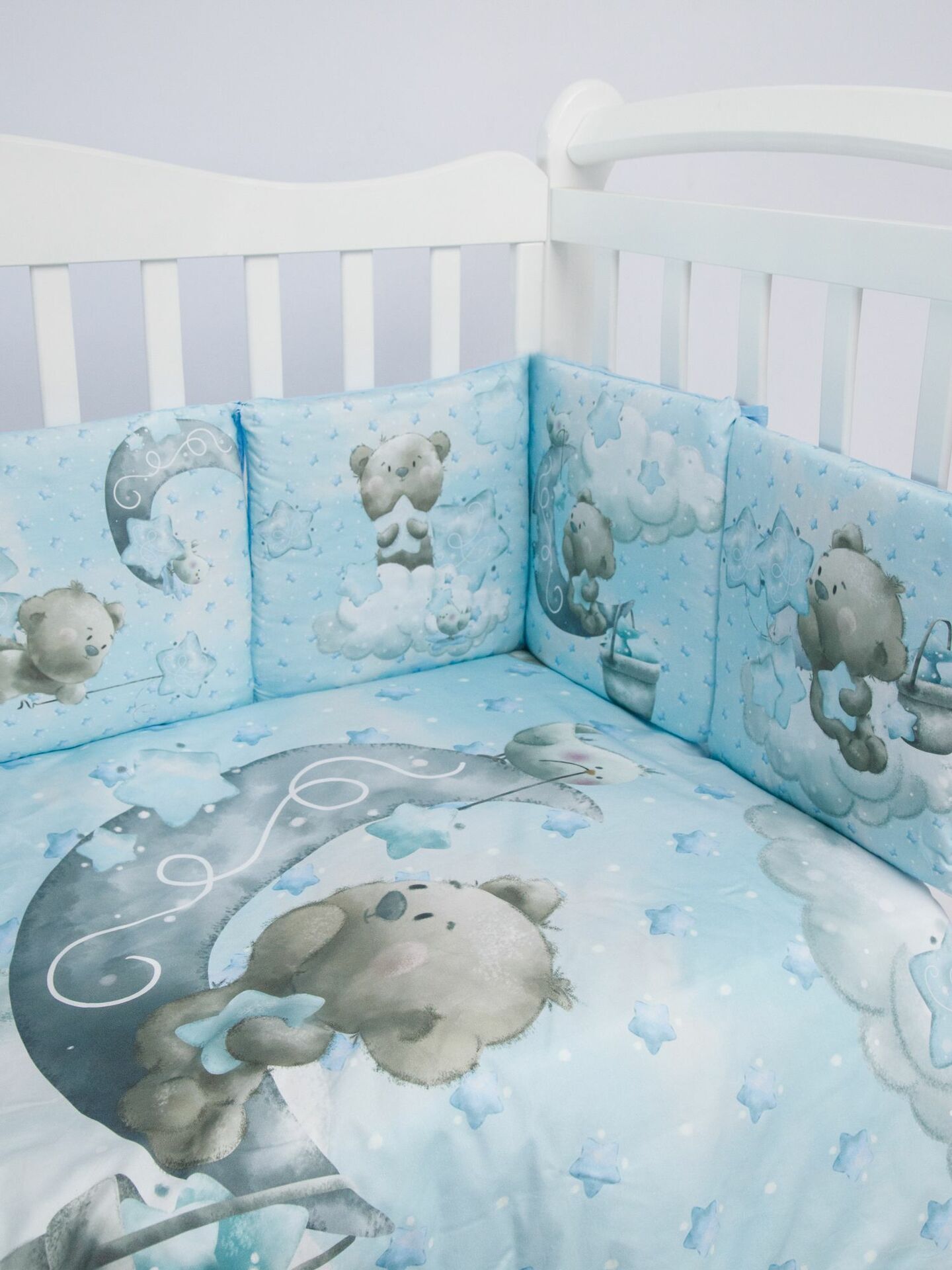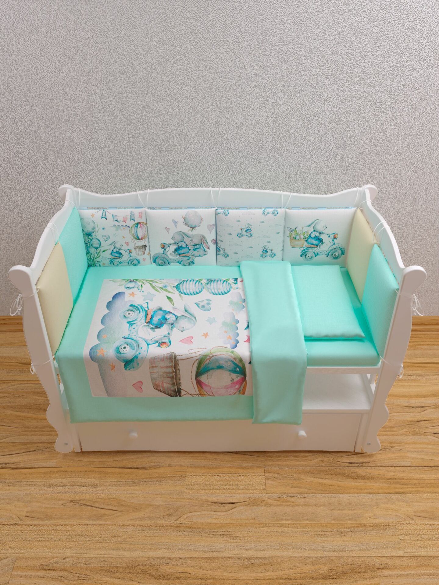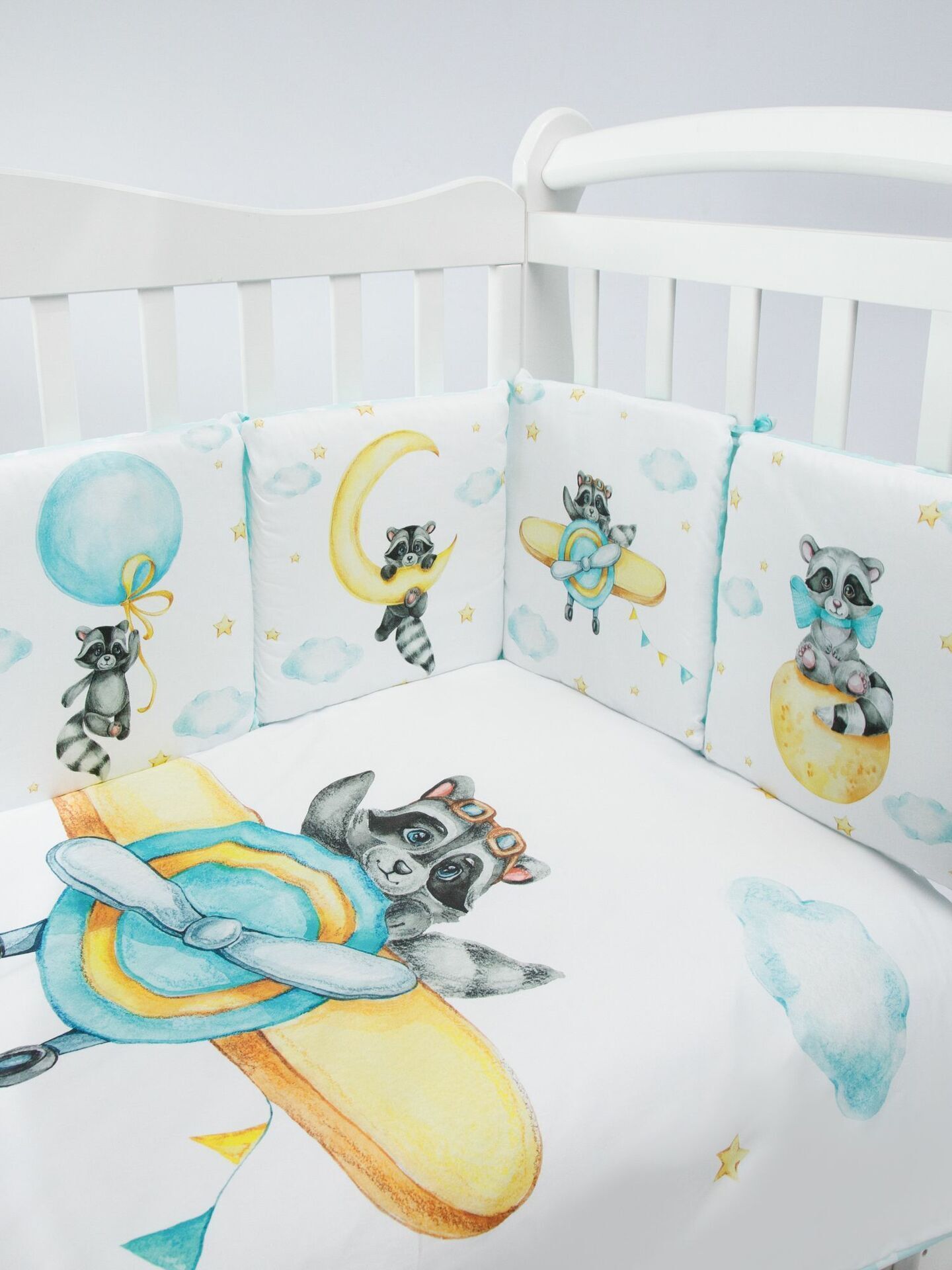 Бортики представлены в виде 12ти подушек на завязках, наволочки на бортиках съёмные. Мягкий наполнитель бортиков обезопасит сон вашего малыша.