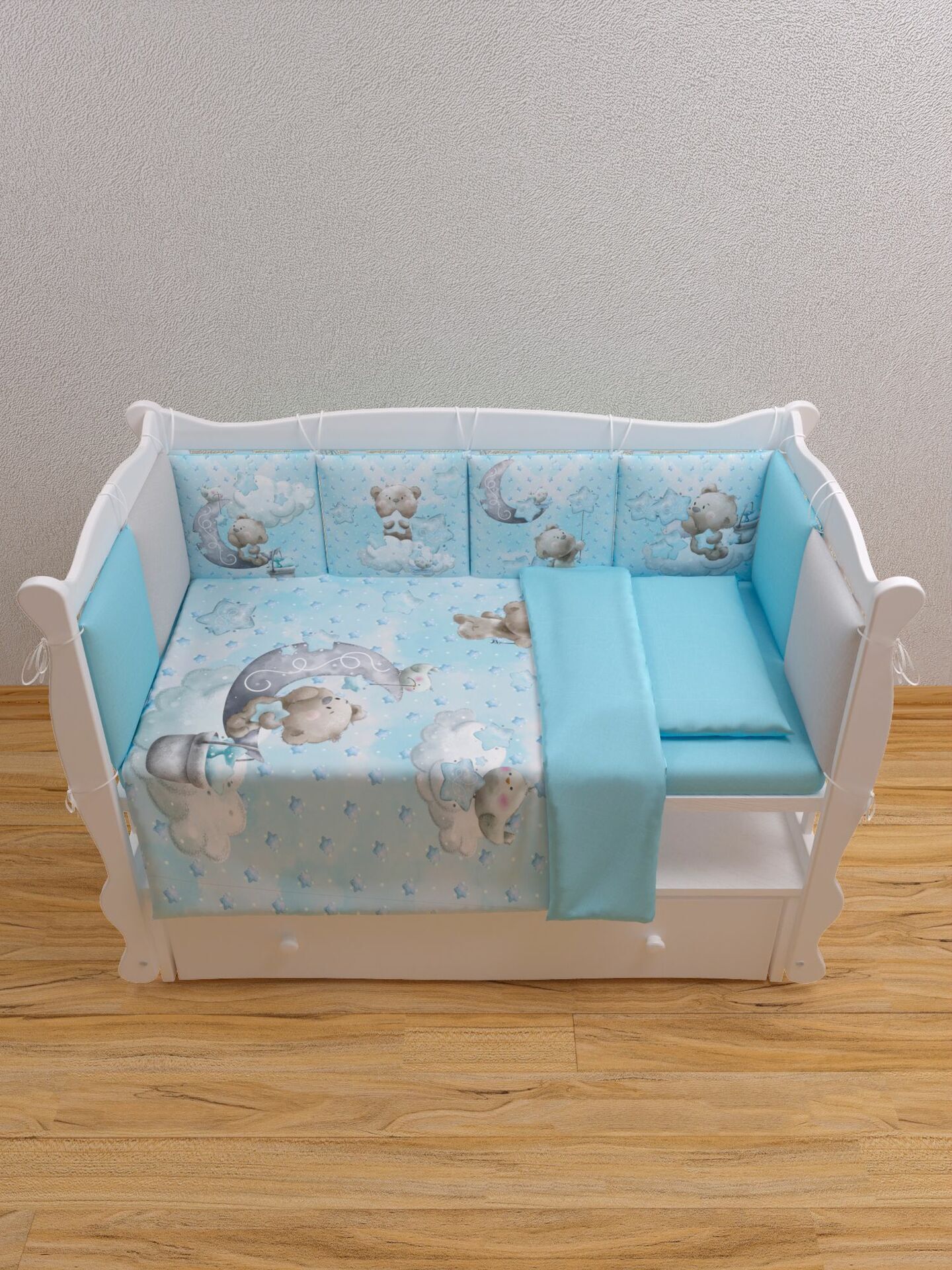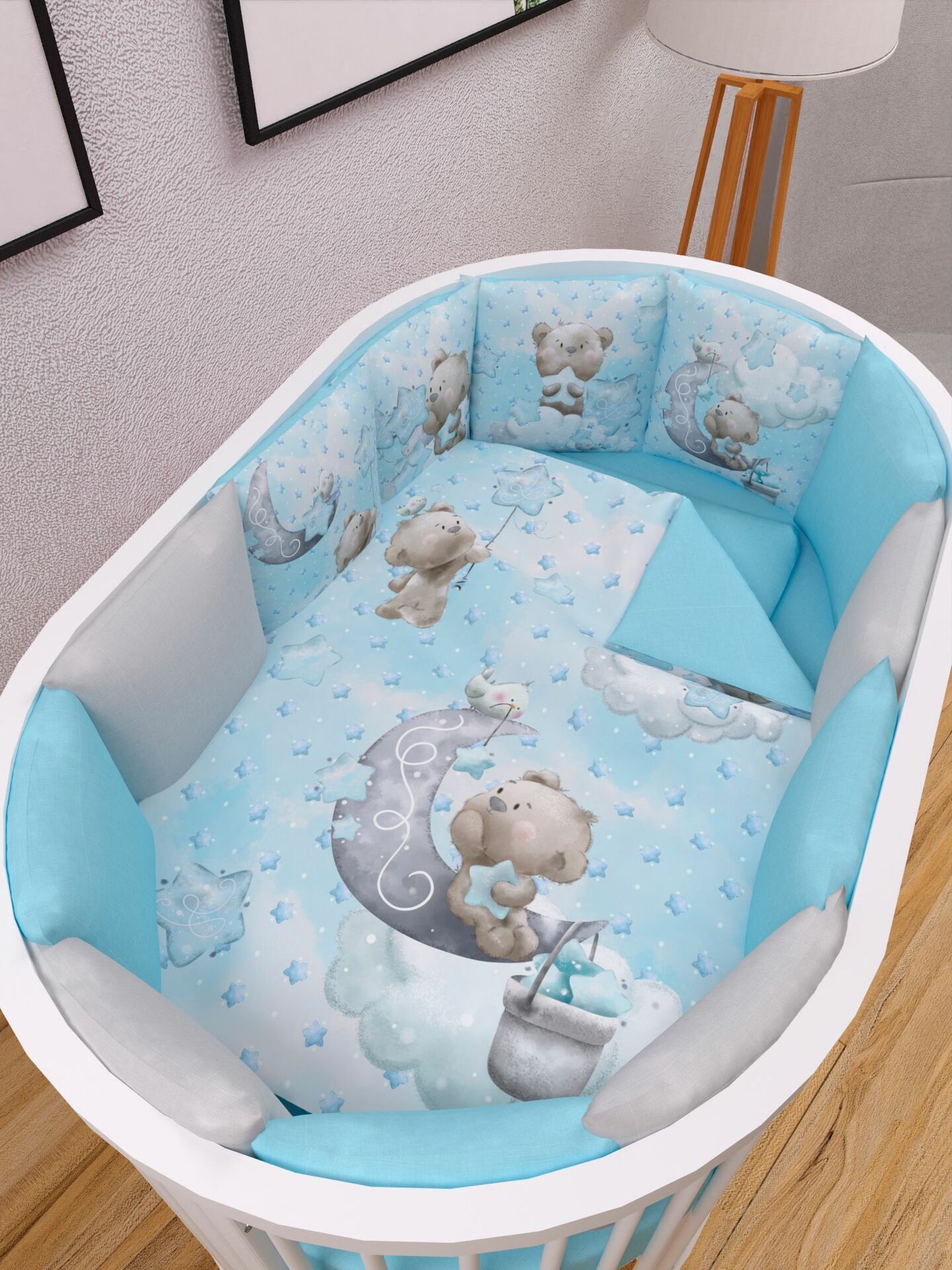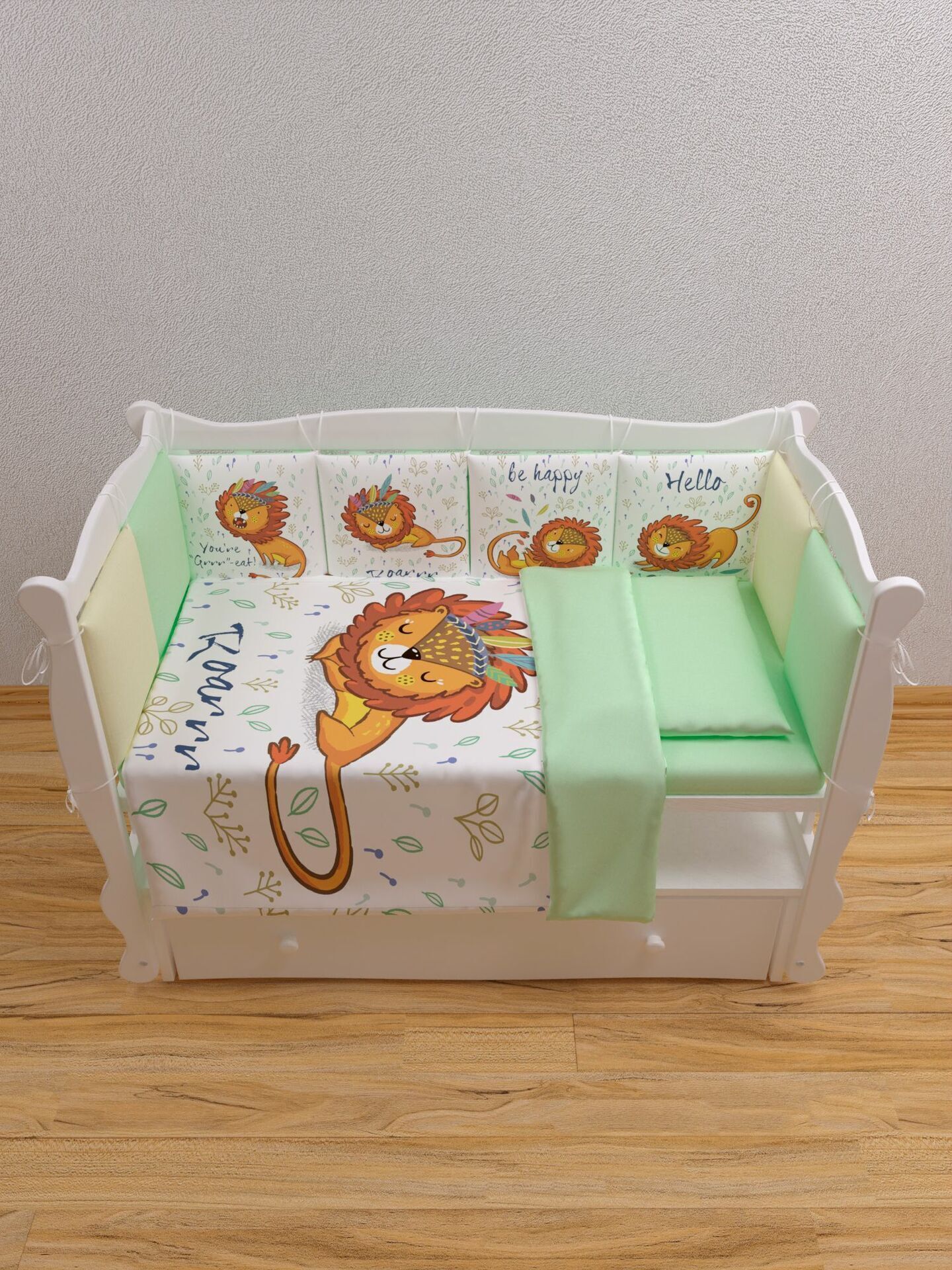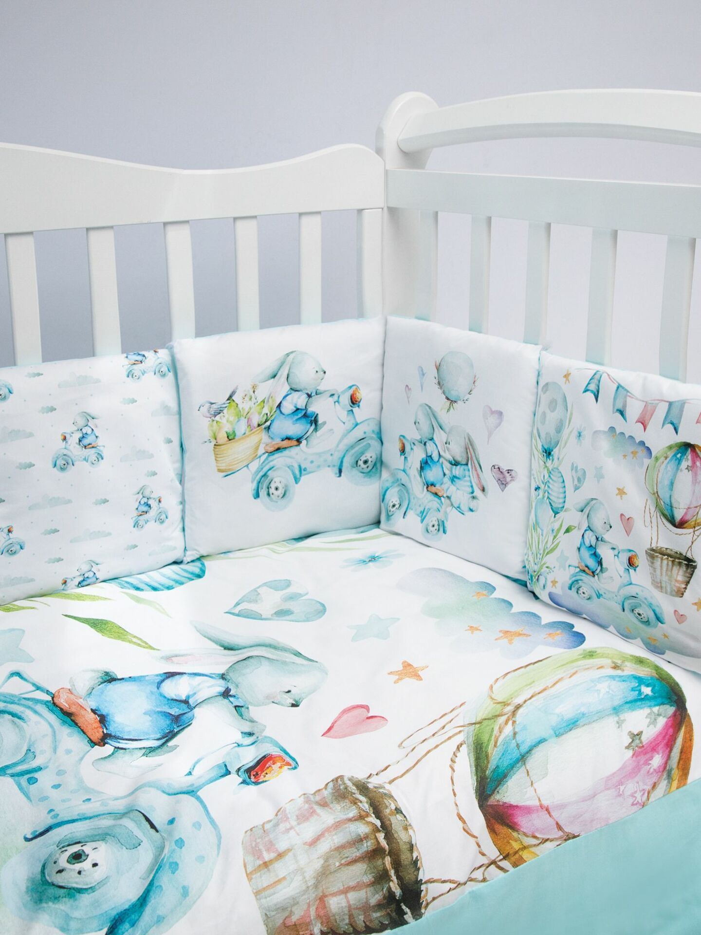 Бортики представлены в виде 12ти подушек на завязках, наволочки на бортиках съёмные. Мягкий наполнитель бортиков обезопасит сон вашего малыша.