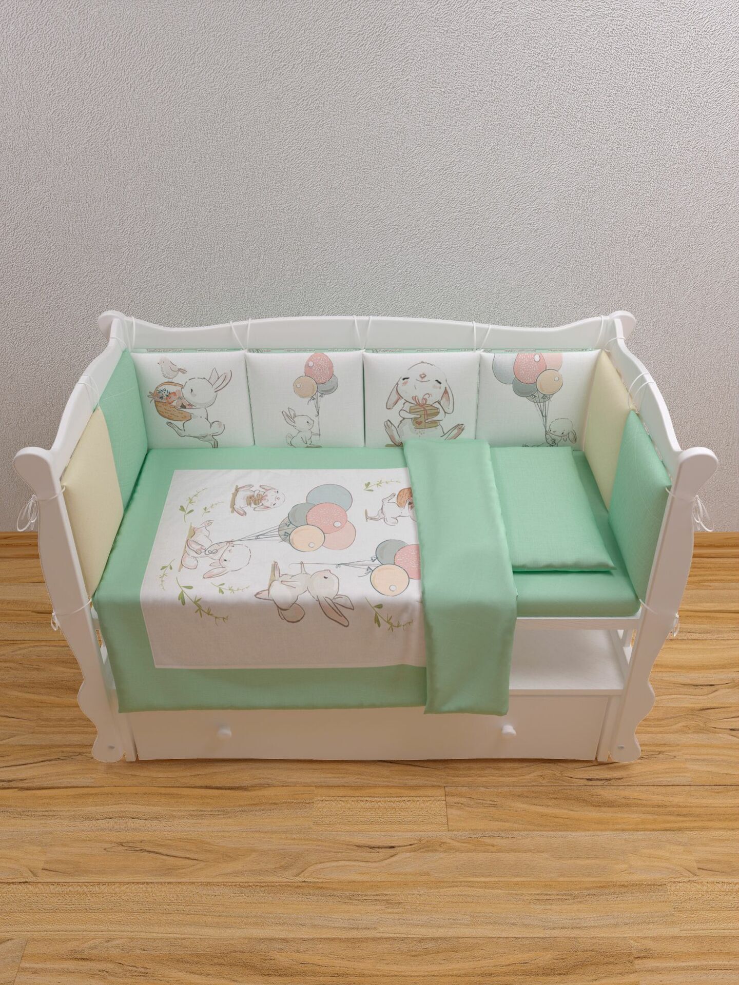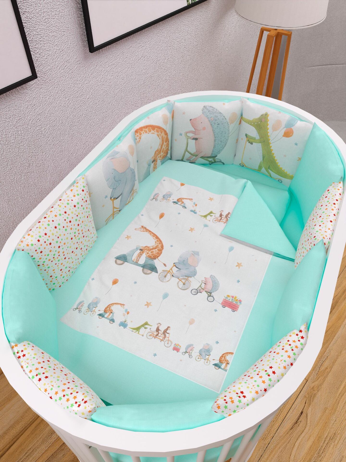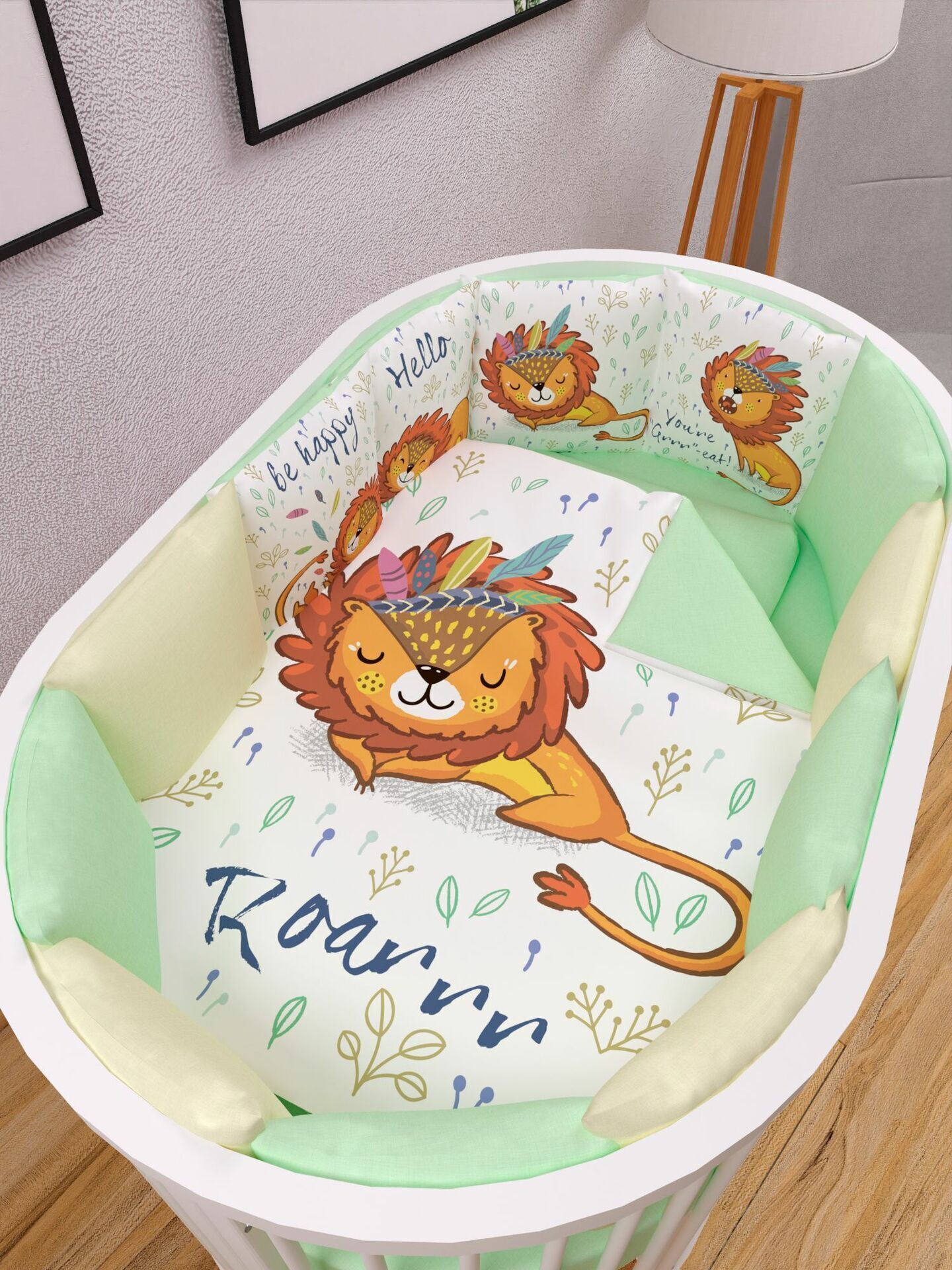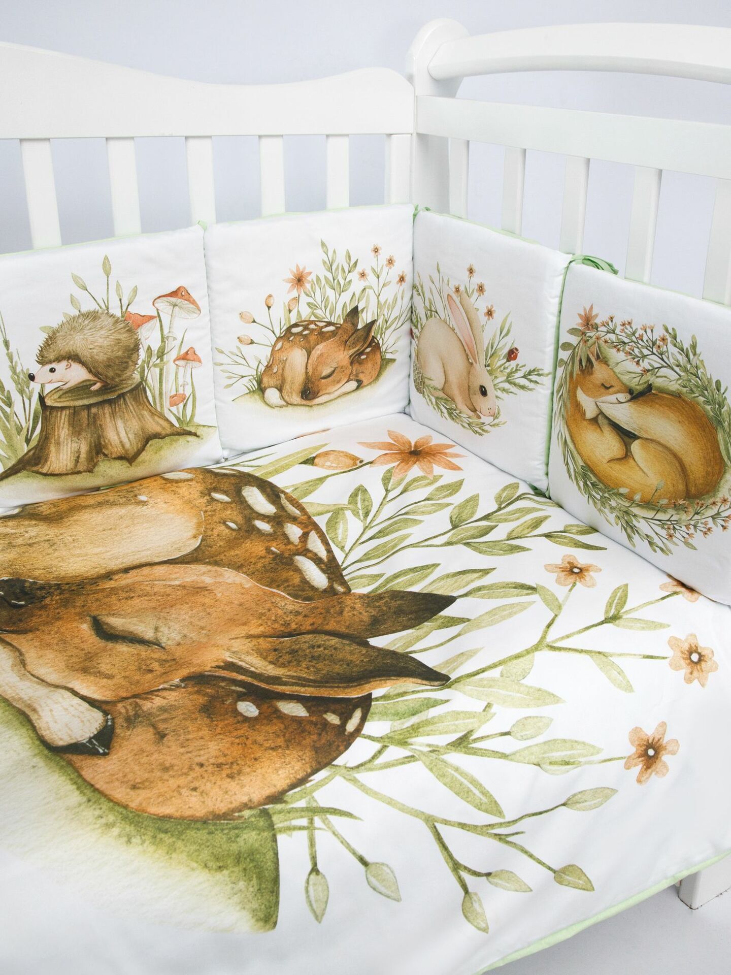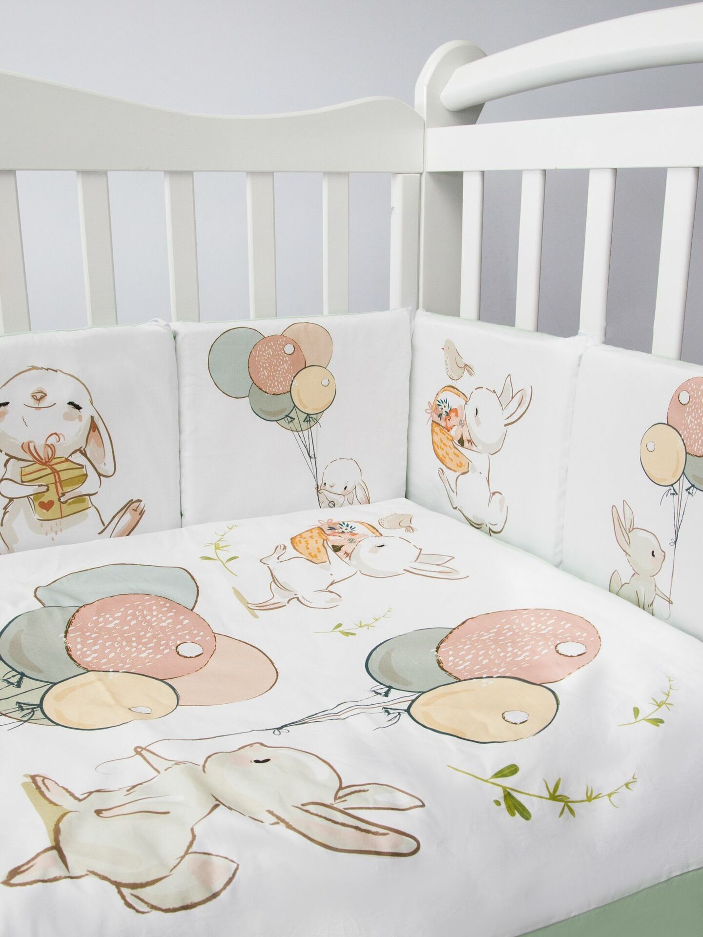 Бортики представлены в виде 12ти подушек на завязках, наволочки на бортиках съёмные. Мягкий наполнитель бортиков обезопасит сон вашего малыша.