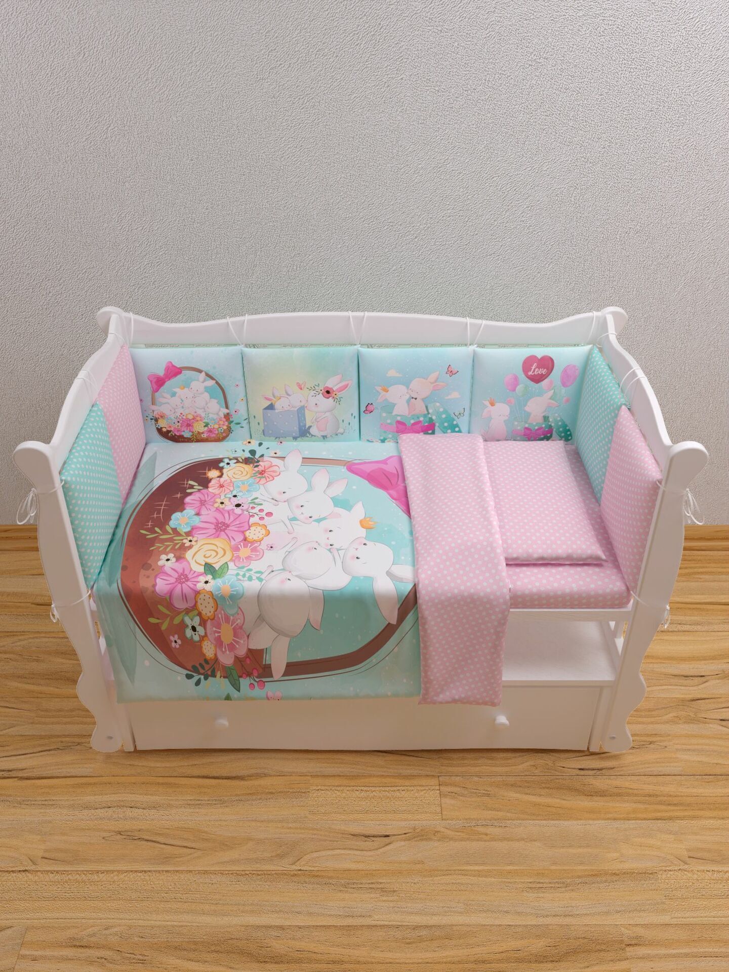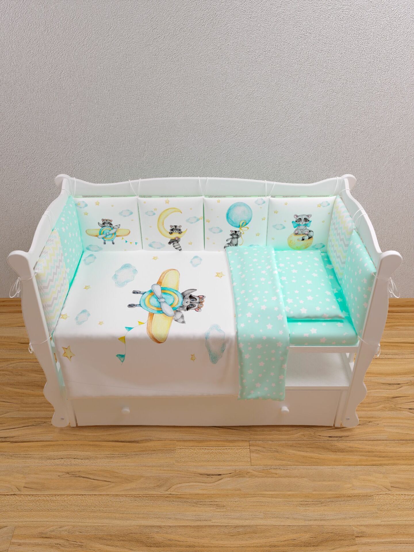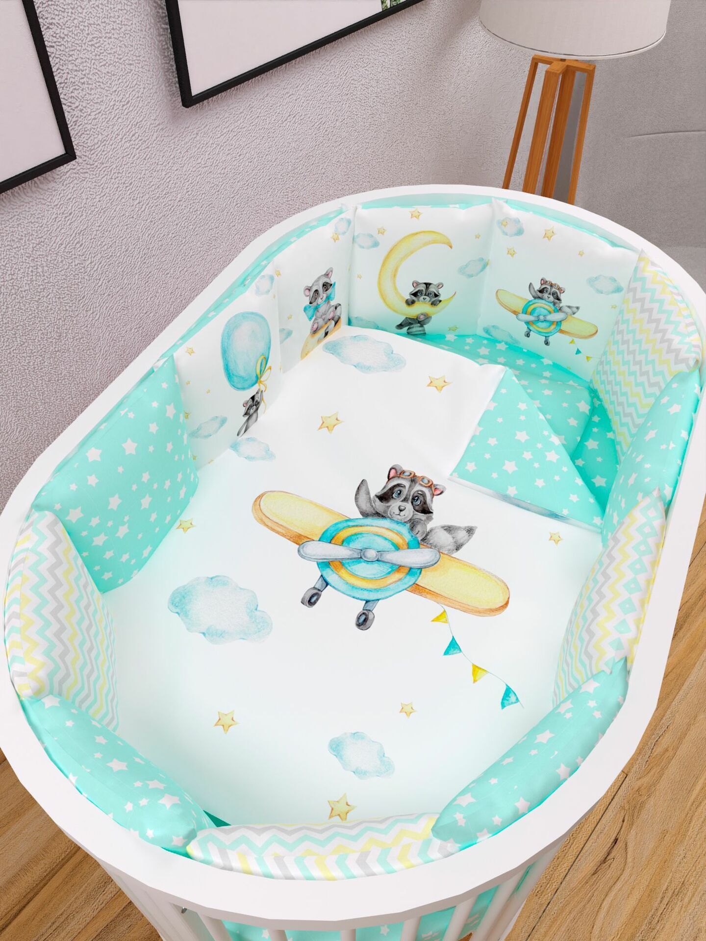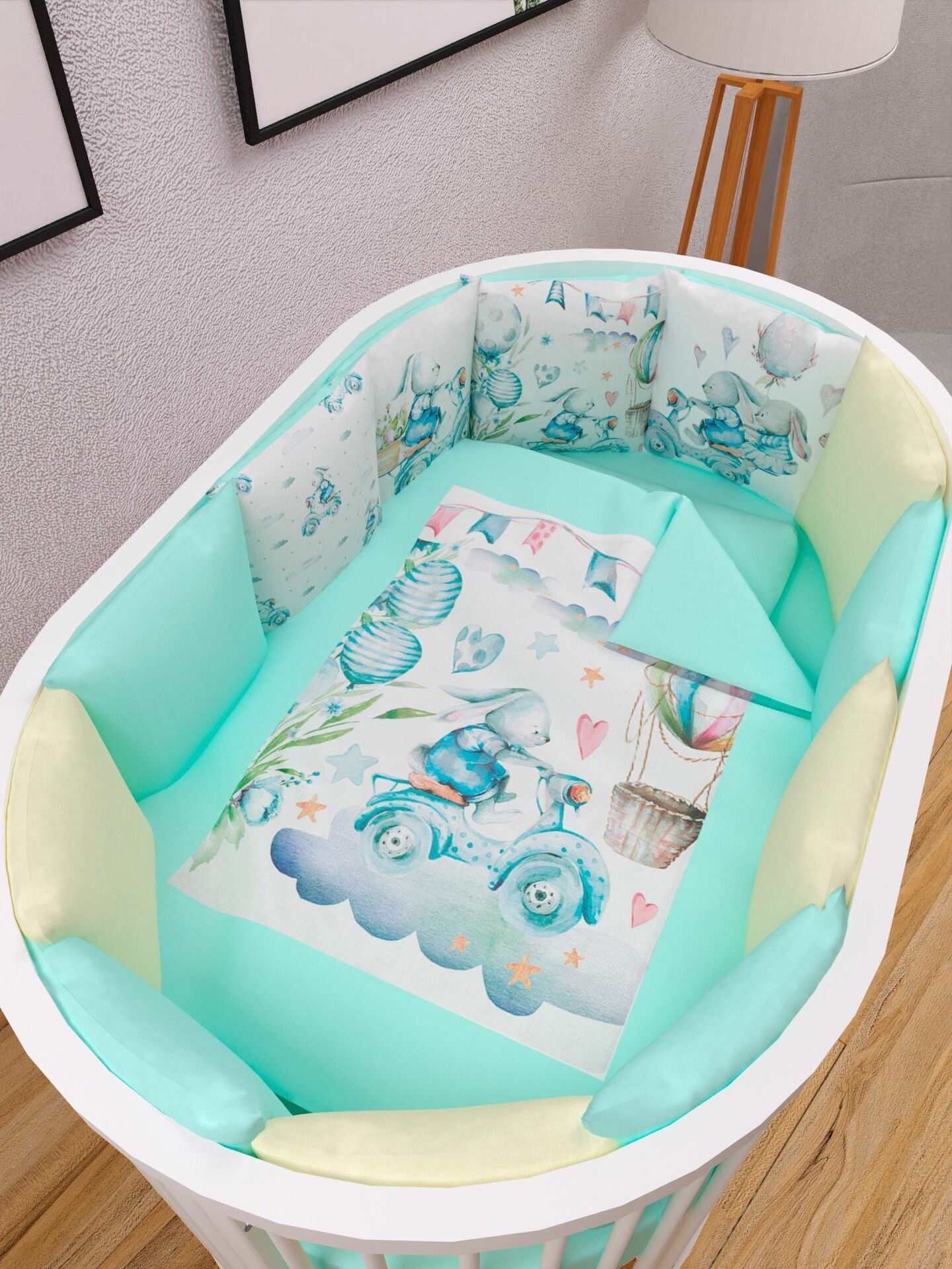 Бортики представлены в виде 12ти подушек на завязках, наволочки на бортиках съёмные. Мягкий наполнитель бортиков обезопасит сон вашего малыша.