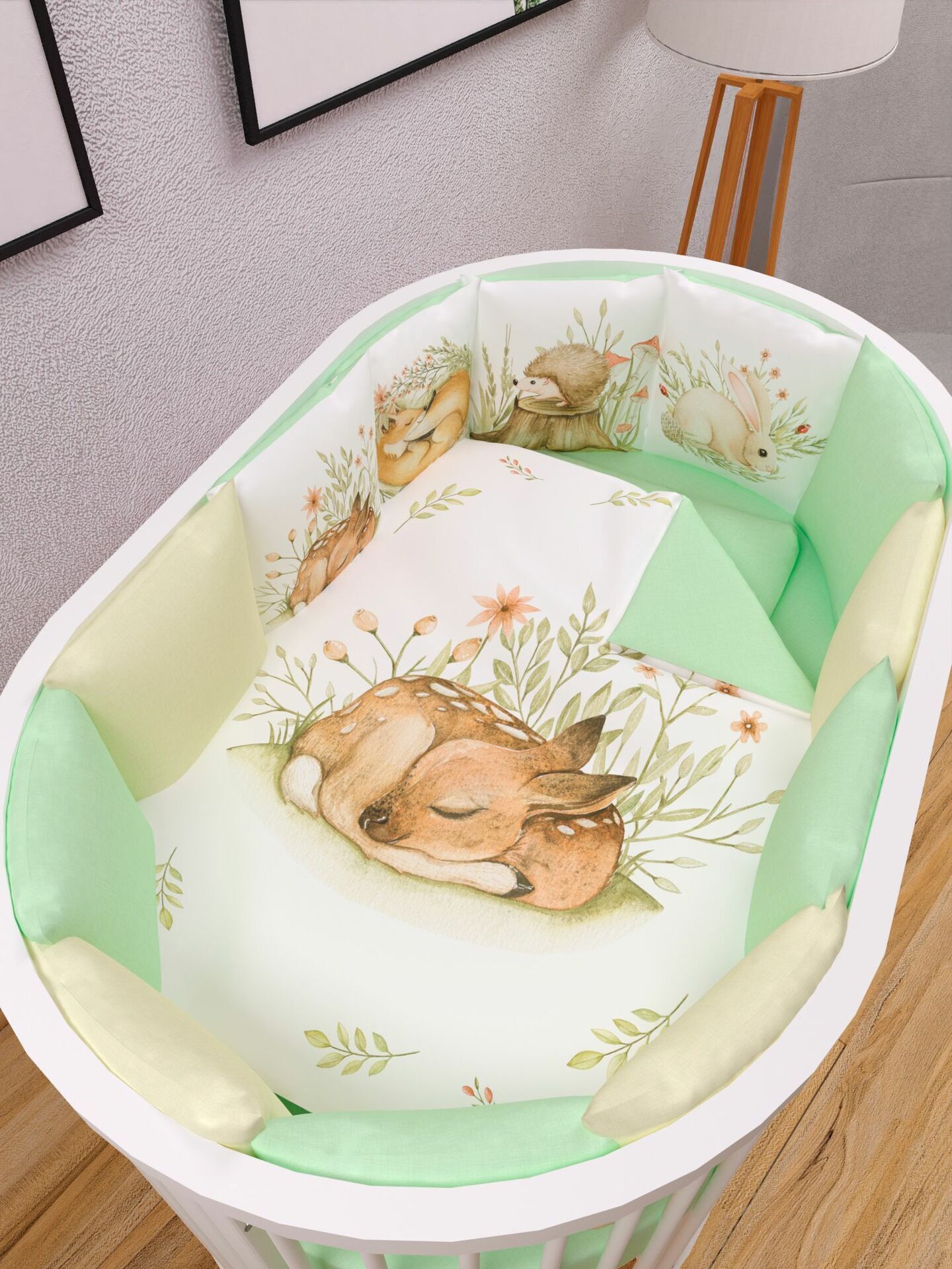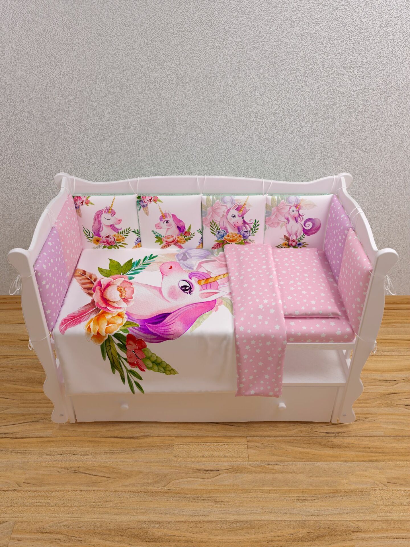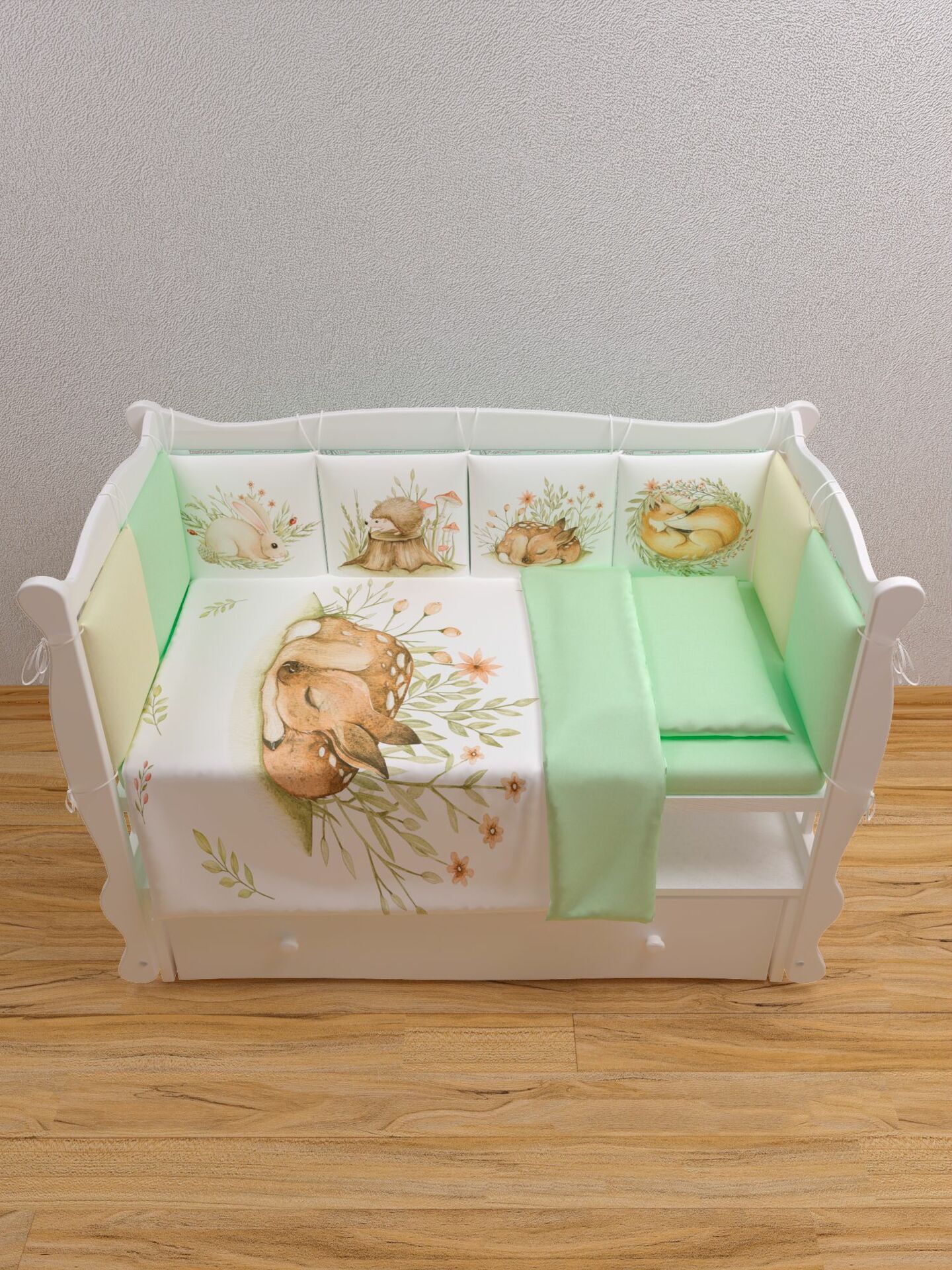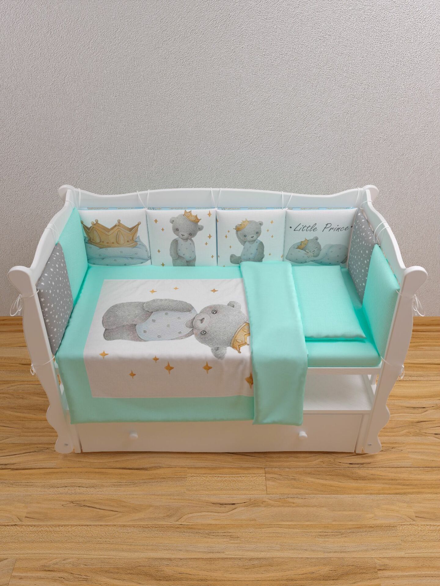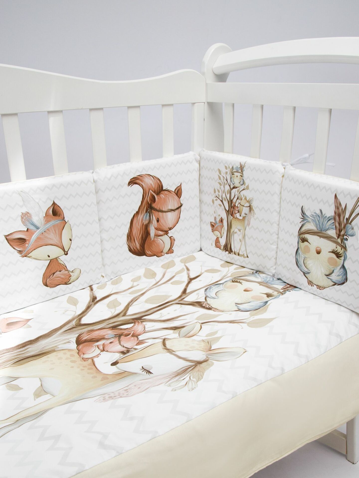 Бортики представлены в виде 12ти подушек на завязках, наволочки на бортиках съёмные. Мягкий наполнитель бортиков обезопасит сон вашего малыша.