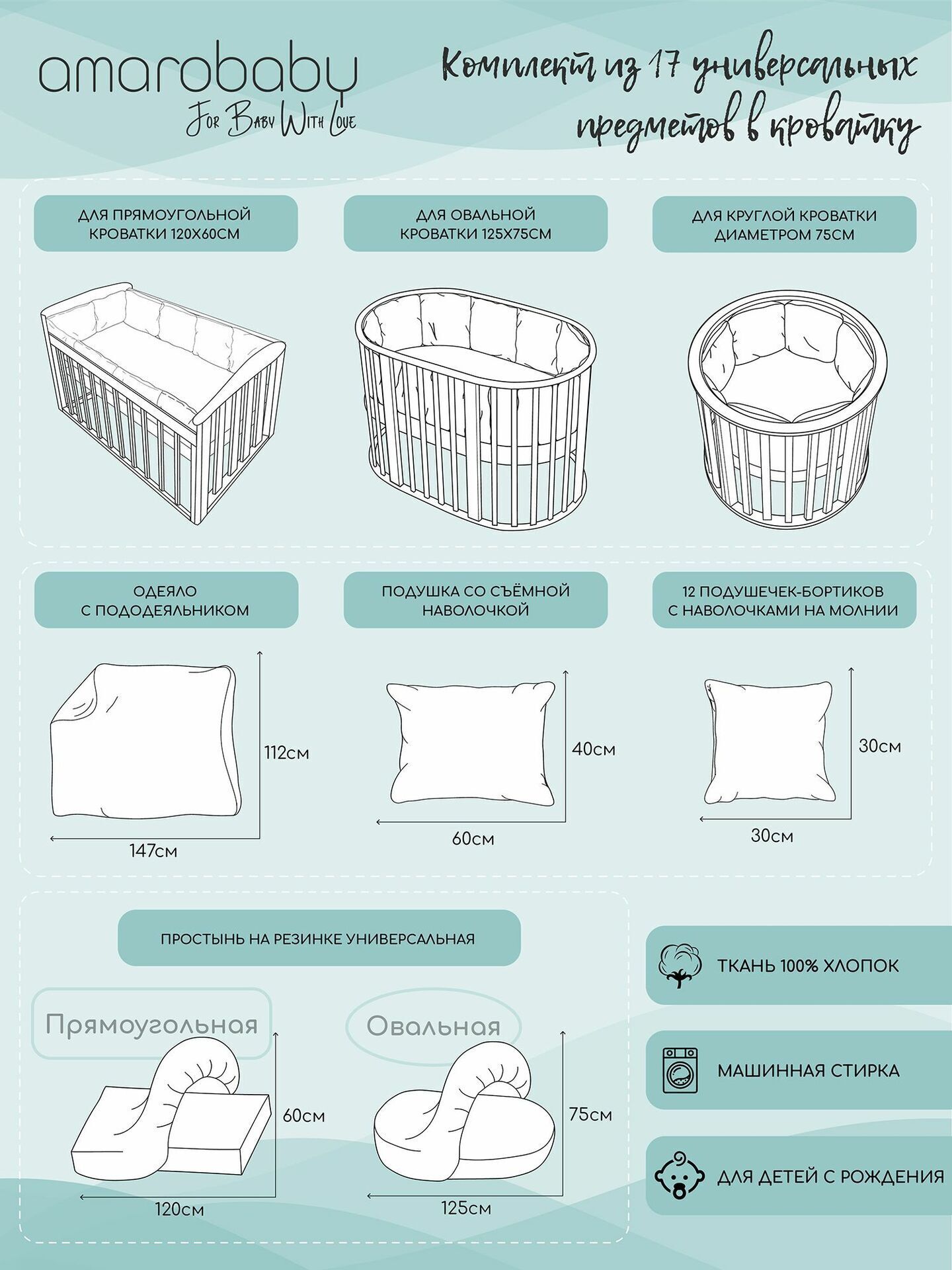 1. универсальная простыня на резинке – 75*125 см (подходит на матрас овал 75*125см и прямоугольник 60*120см и на круг);